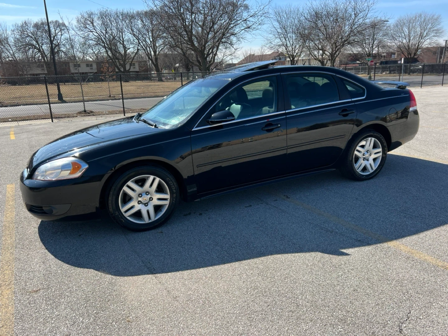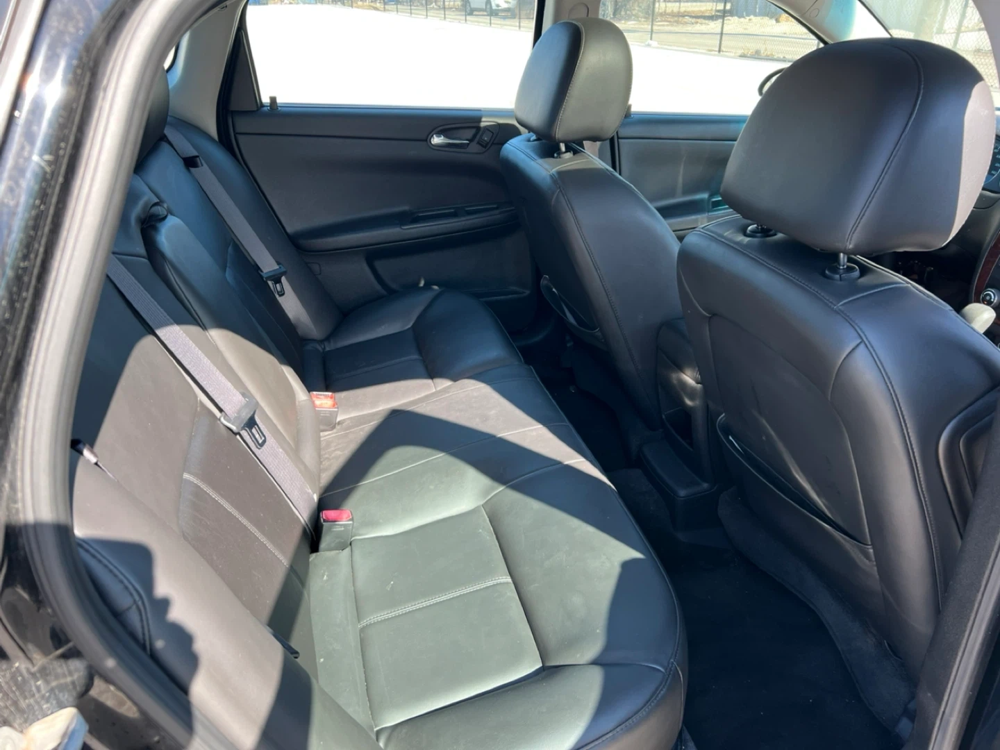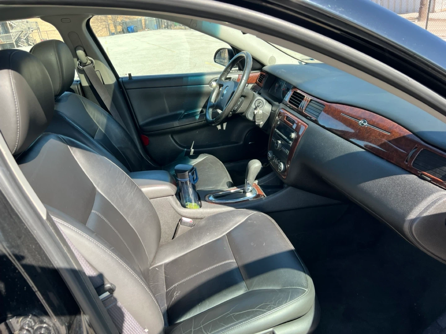 This is a black Chevrolet Impala sedan. It features a black leather interior and wood grain accents on the dashboard and doors. The car has a sunroof and alloy wheels.