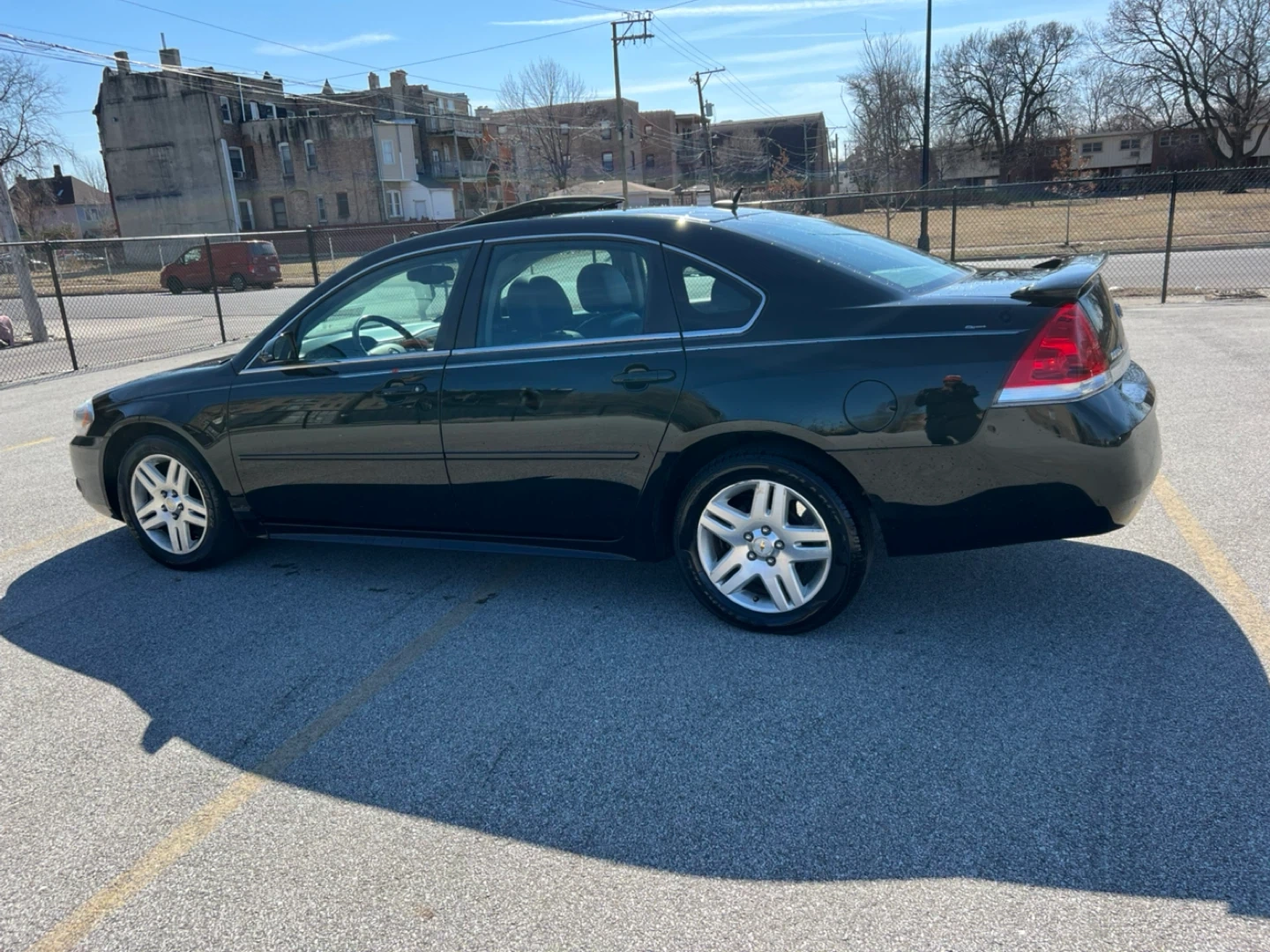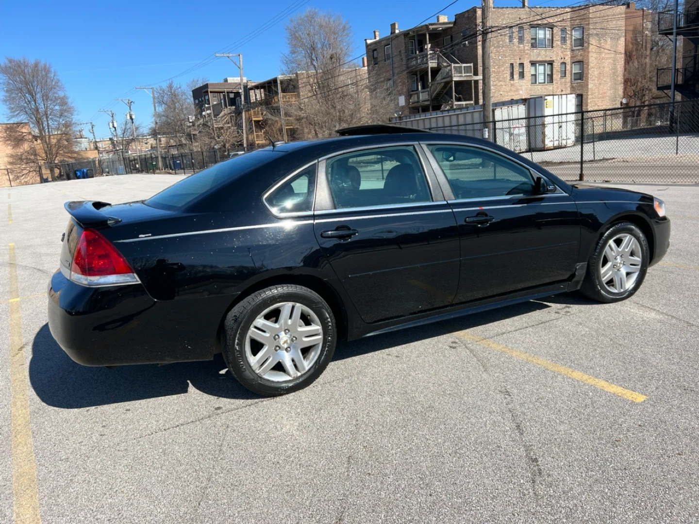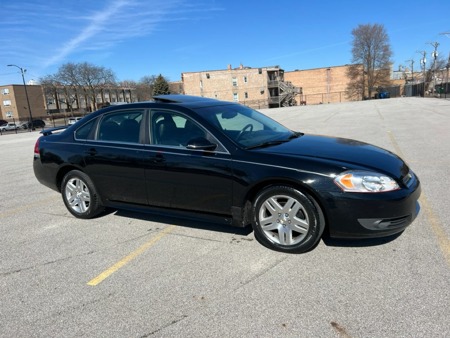 This is a black Chevrolet Impala sedan. It features a black leather interior and wood grain accents on the dashboard and doors. The car has a sunroof and alloy wheels.