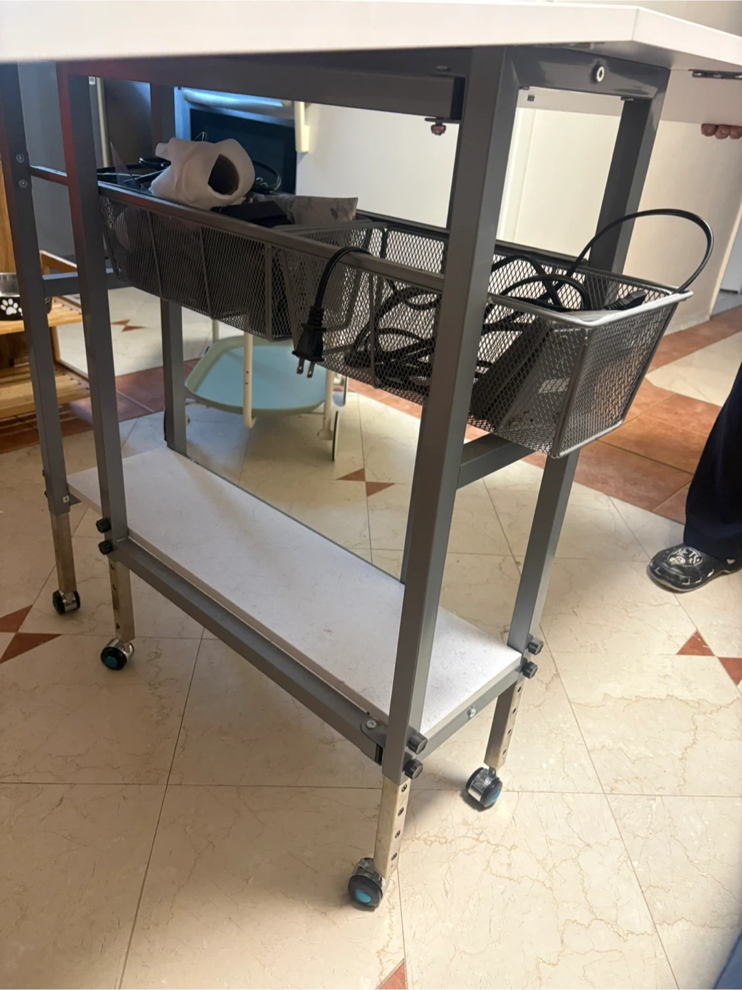 This sewing table features a large gridded surface for precise cutting and layout. The table has a metal frame with baskets for storage and wheels for mobility. It's great for sewing projects!