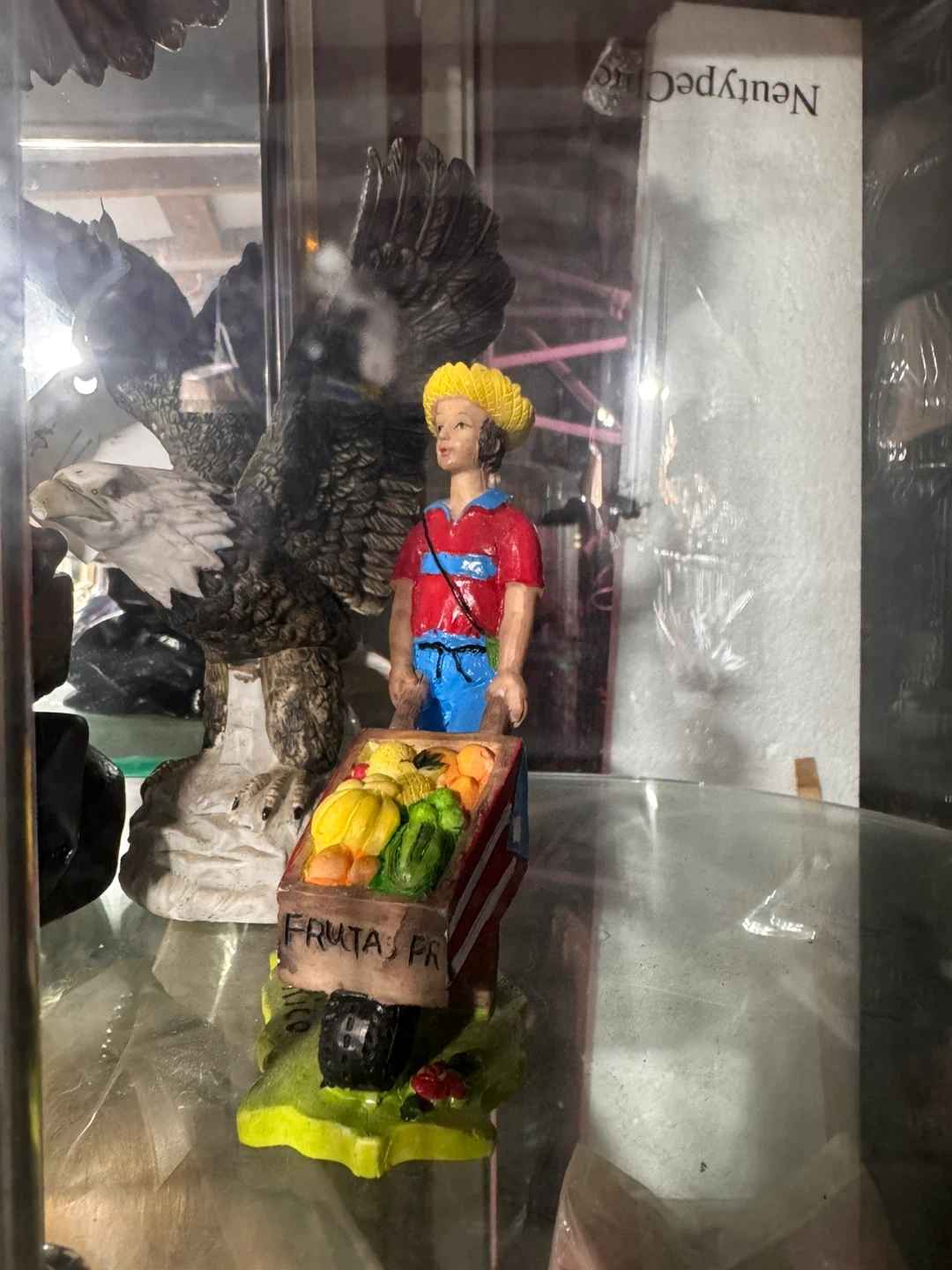 This is a decorative figurine featuring a person with a cart full of colorful fruits, and a large eagle statue. The cart is labeled 'FRUTAS PR'. It's a unique piece for display!