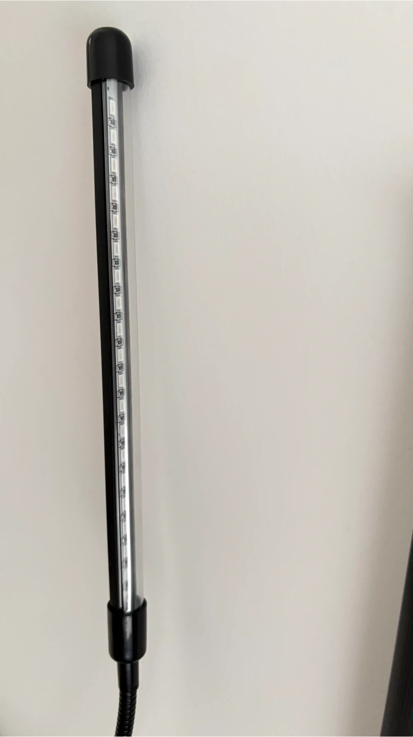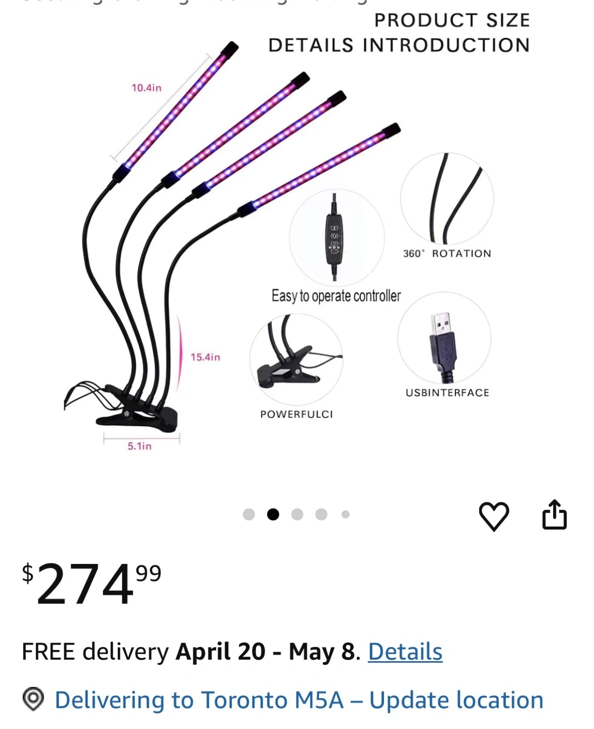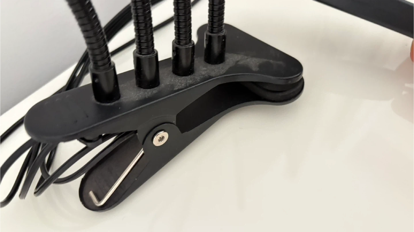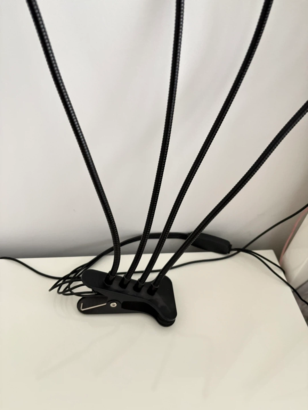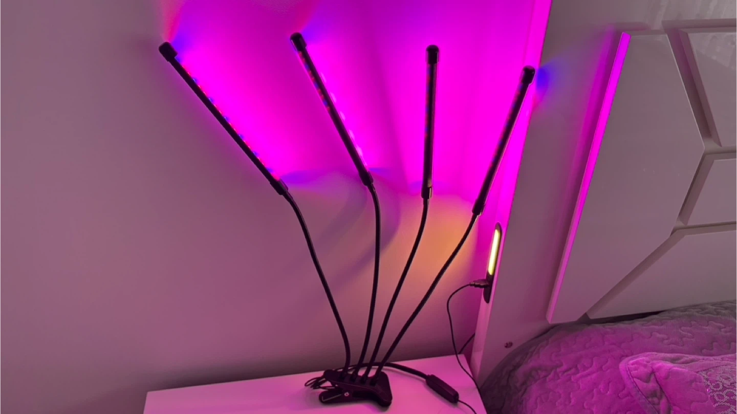 This four-head LED grow light is designed to support plant growth. It features flexible gooseneck arms and a clip base for easy positioning. The lights offer red, blue, and mixed spectrums.