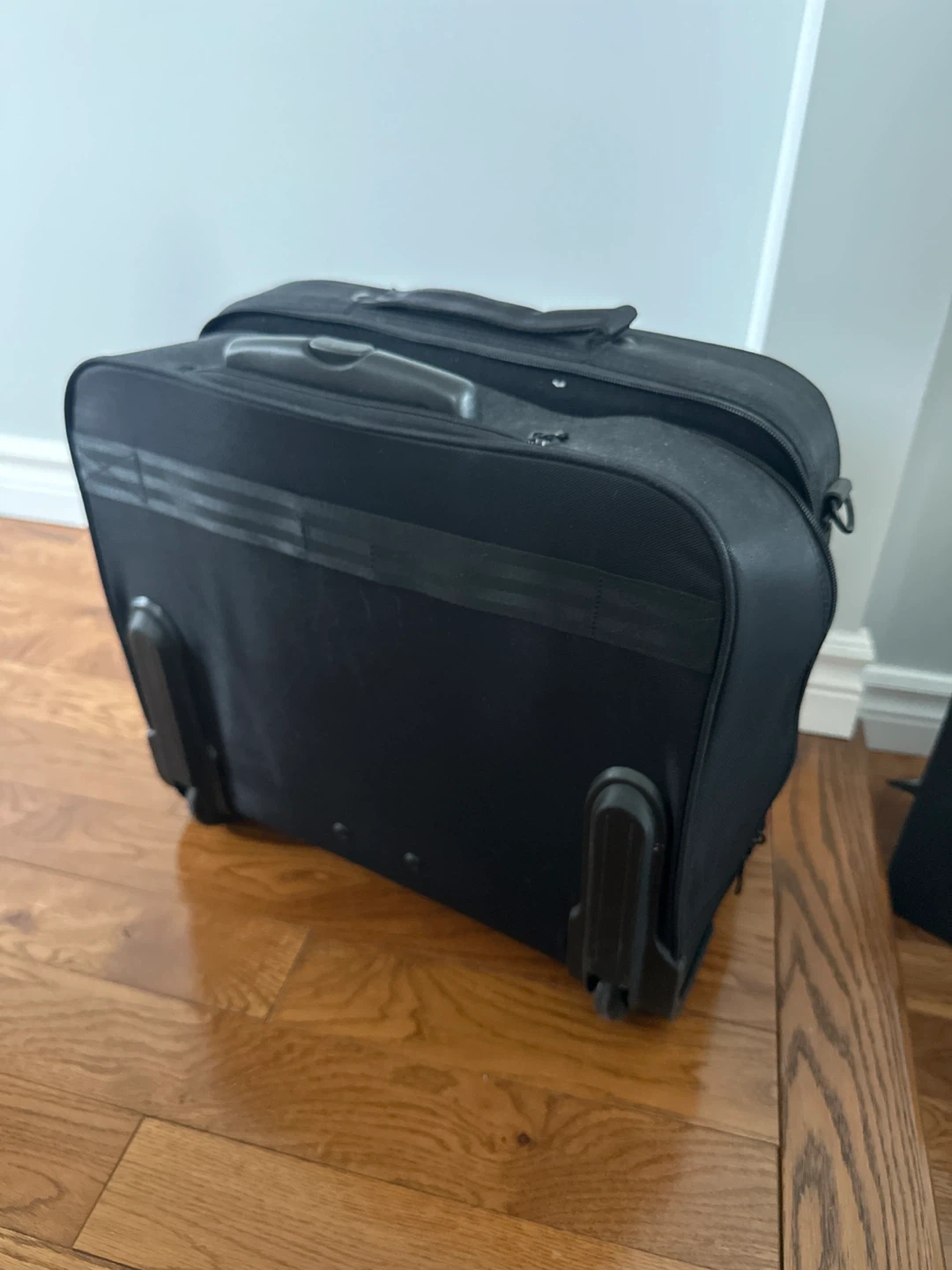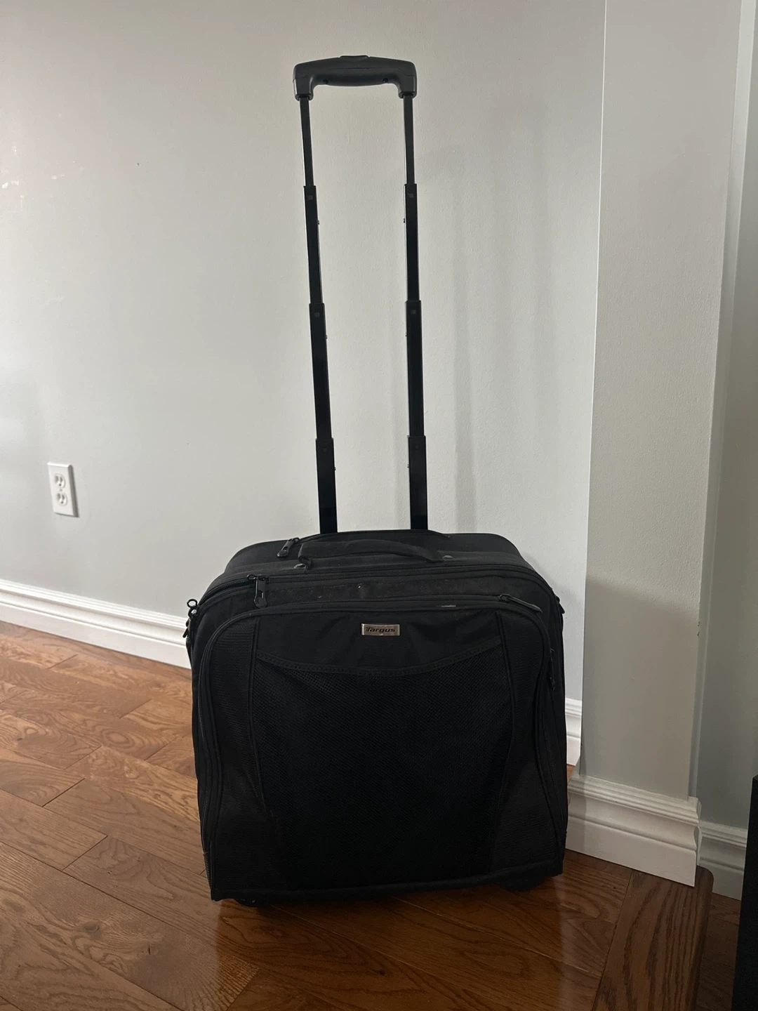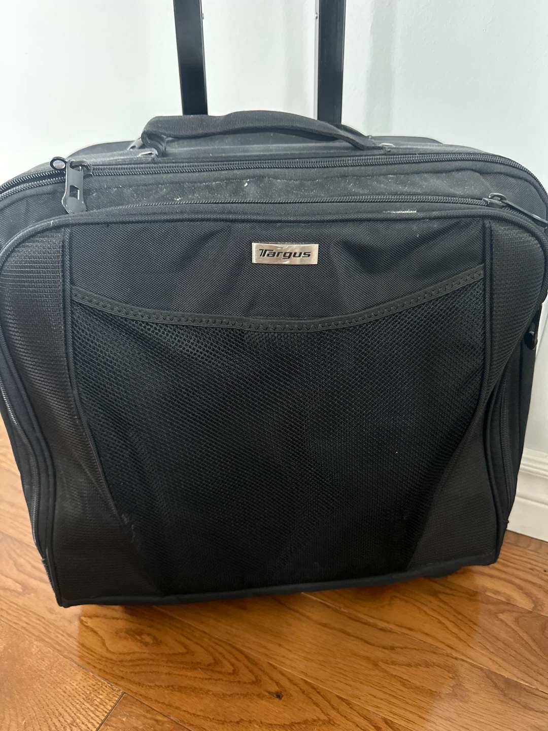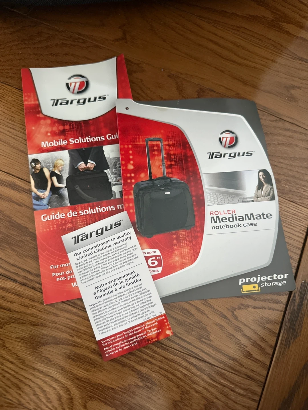 This is a black Targus Roller MediaMate notebook case. It's designed to hold laptops up to 16 inches. It has wheels and a retractable handle for easy transport.