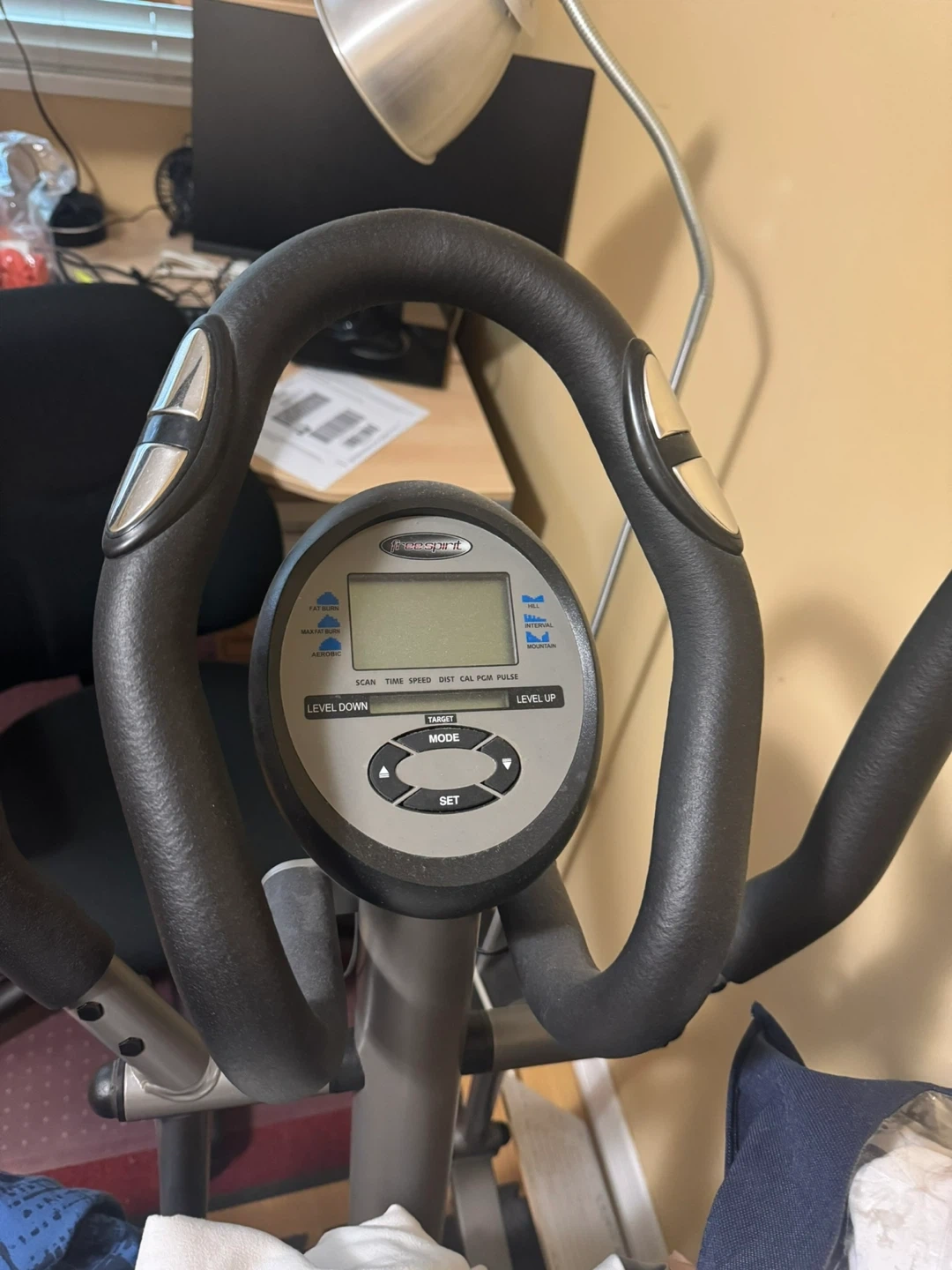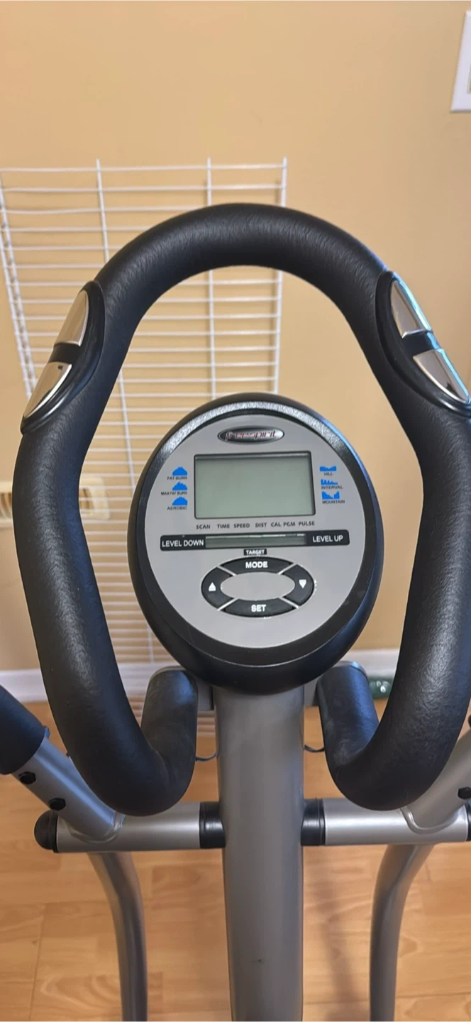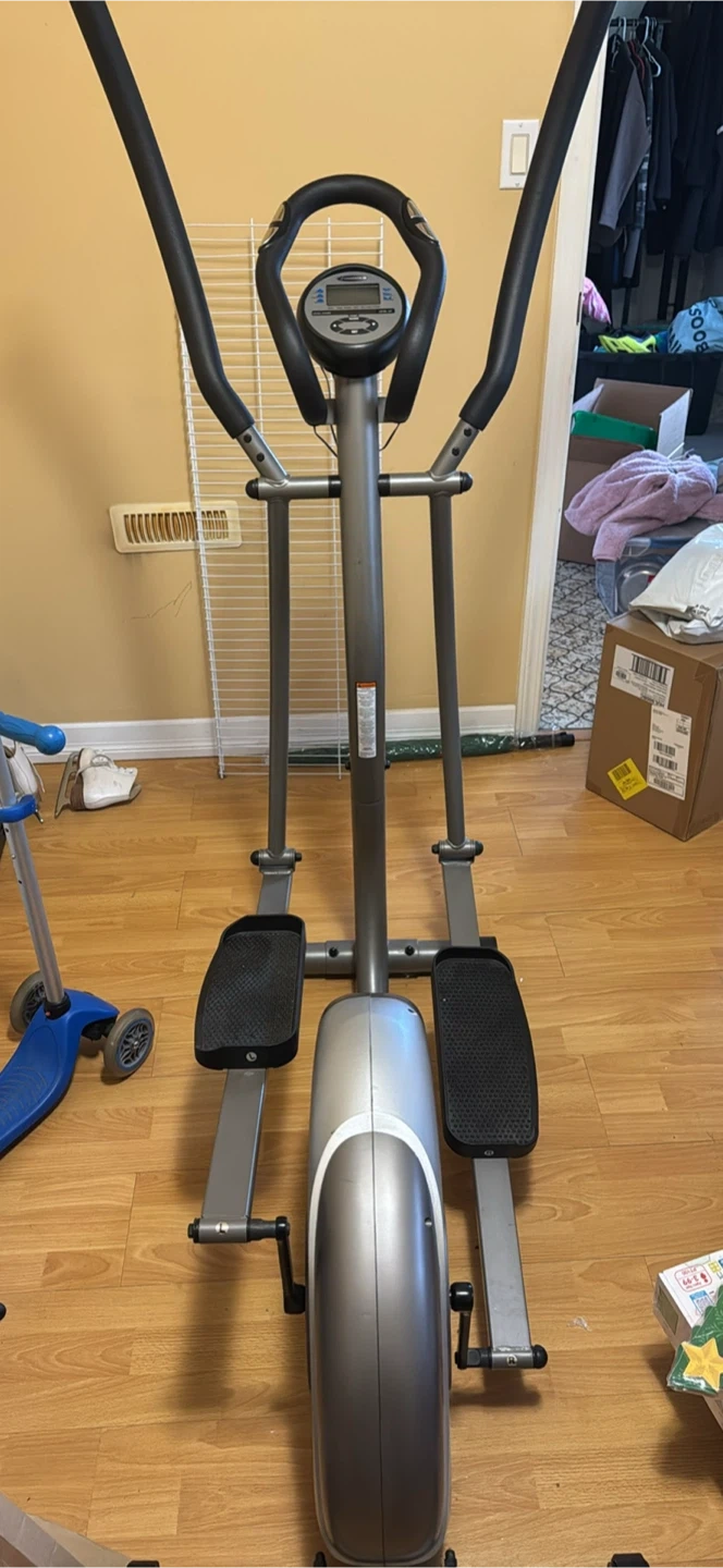 Selling a Free Spirit elliptical machine! It's in good condition and ready for someone to get a great workout. The display shows scan, time, speed, distance, calories, pulse and has level up and level down buttons. Perfect for your home gym!