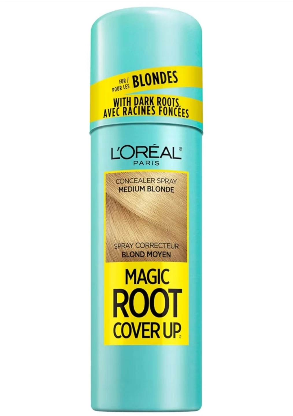 L'Oréal Paris Magic Root Cover Up concealer spray for blondes. It's a spray corrector for medium blonde hair. This product helps cover dark roots.