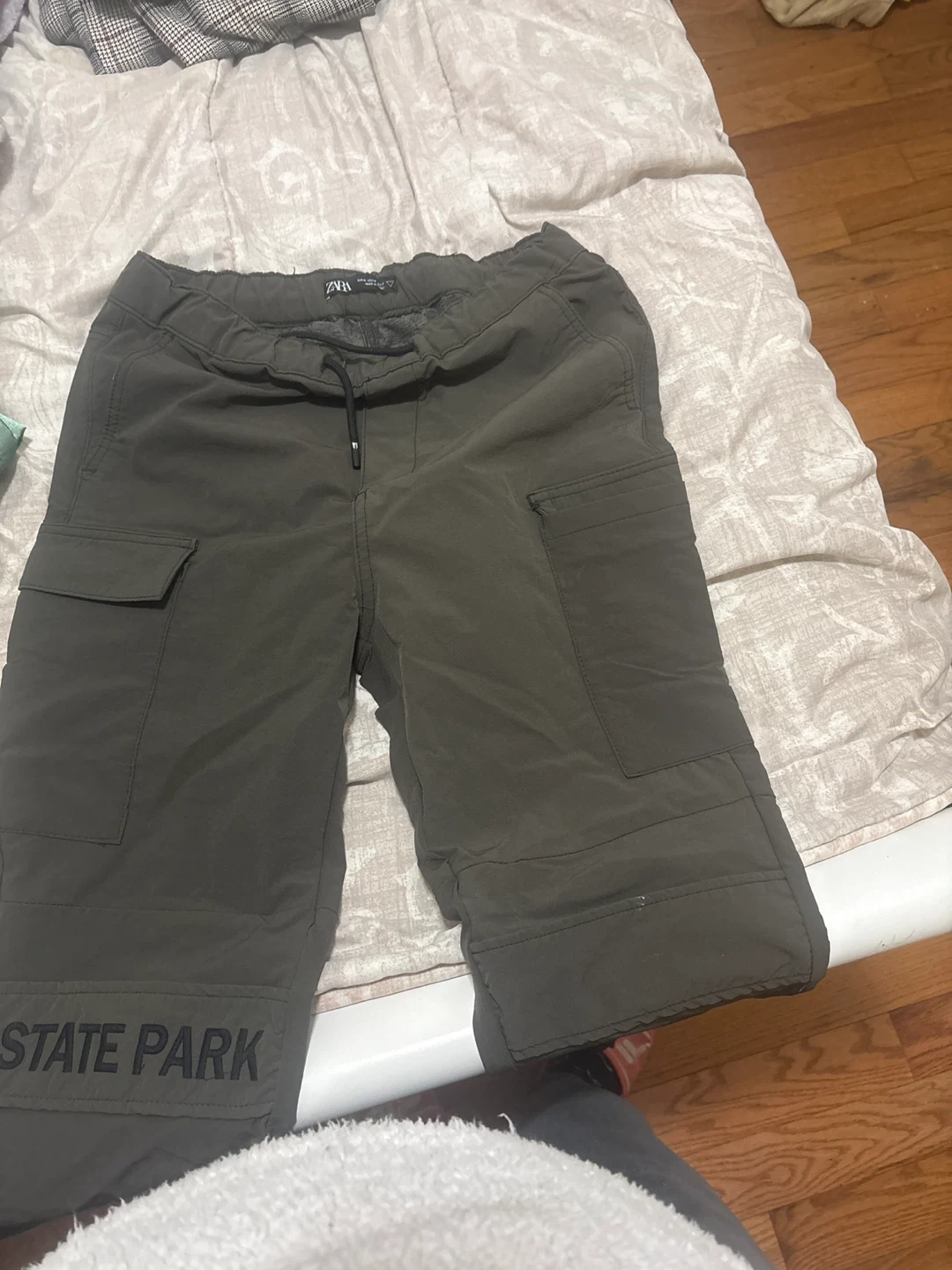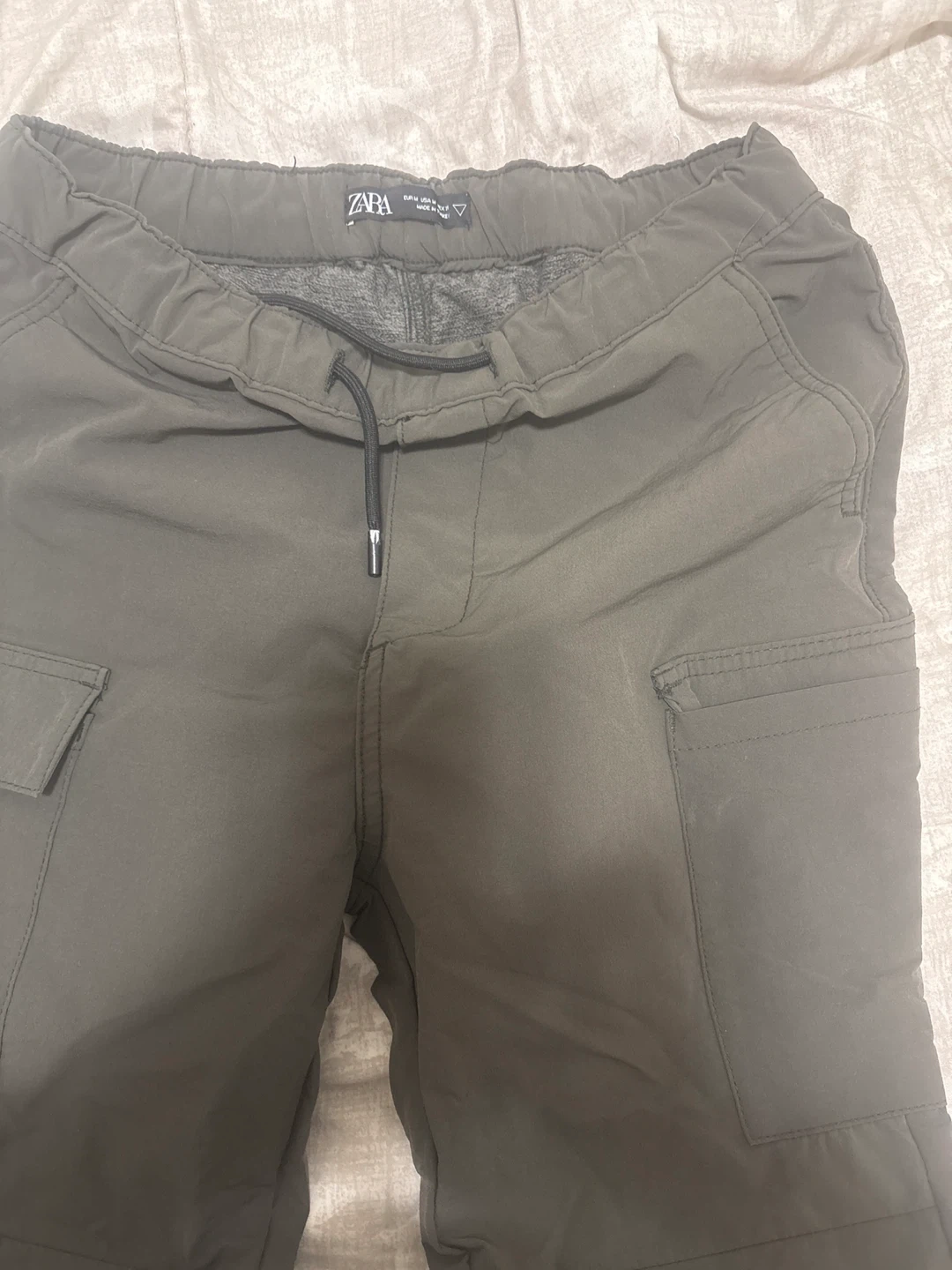 Olive green cargo pants from Zara. Features a drawstring waist and multiple pockets. Made from a durable fabric. Perfect for casual wear.
