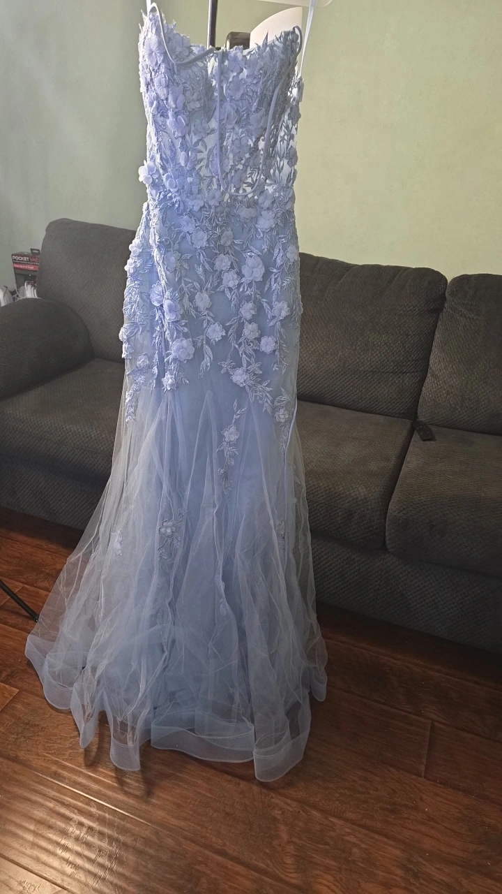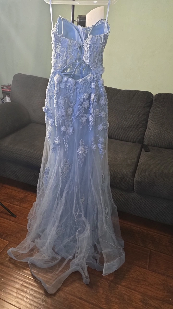 Beautiful light blue prom dress with intricate floral lace detailing throughout. It features a flattering silhouette with a corset-style back. Perfect for formal events or a special occasion!