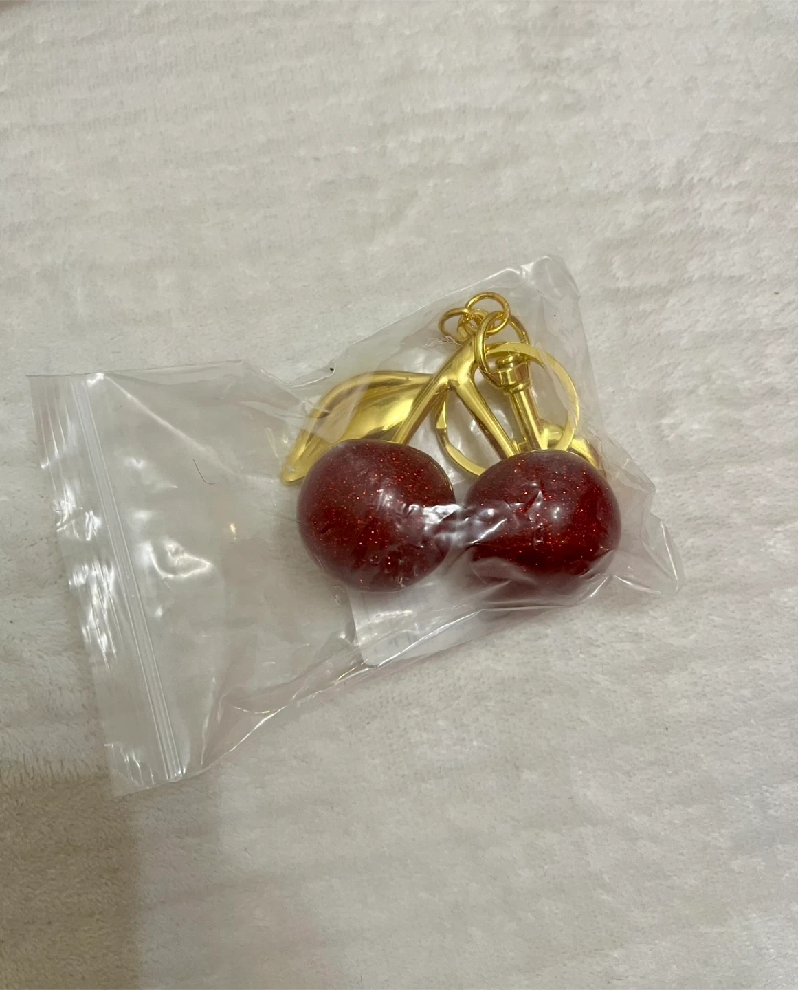 Selling a cute cherry keychain! It features two red, glittery cherries and gold-coloured leaves and keyring. It's still in its original packaging