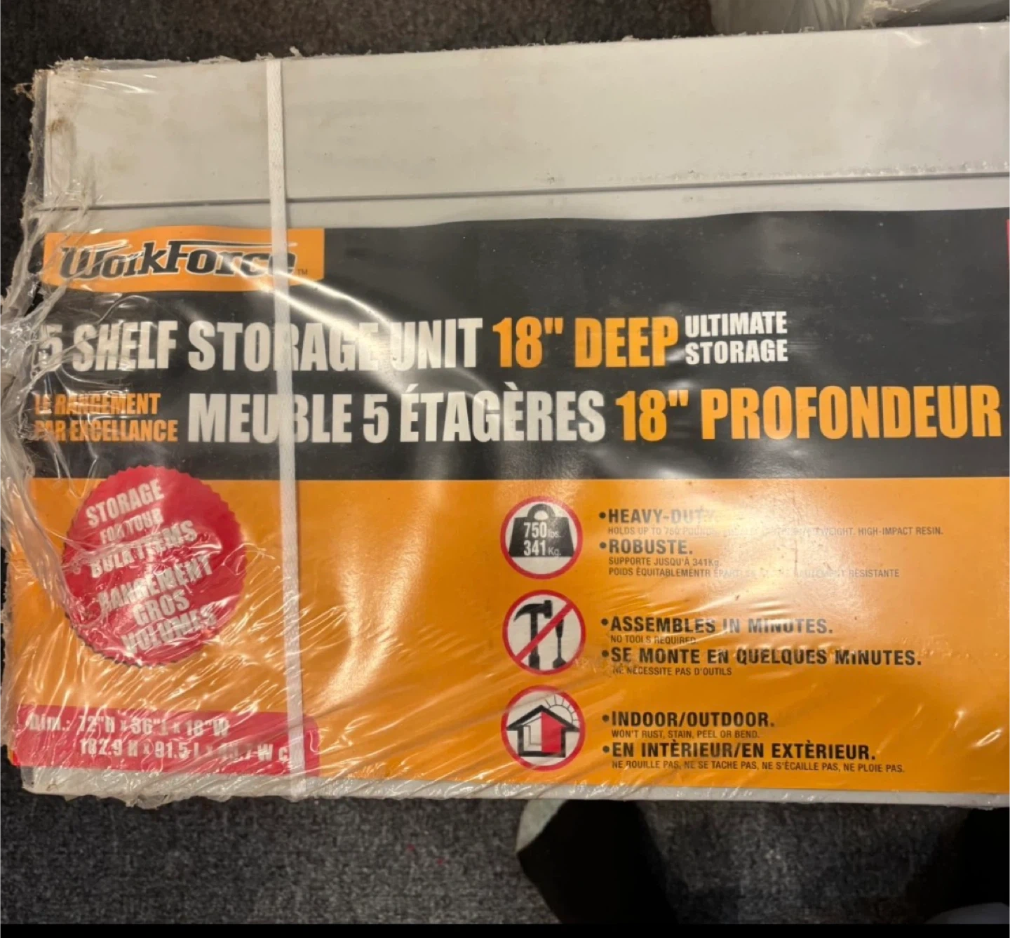 This WorkForce 5 shelf storage unit is 18" deep and suitable for indoor or outdoor use. It's made from high-impact resin that won't rust, stain, peel, or bend. Each shelf supports up to 341kg.
