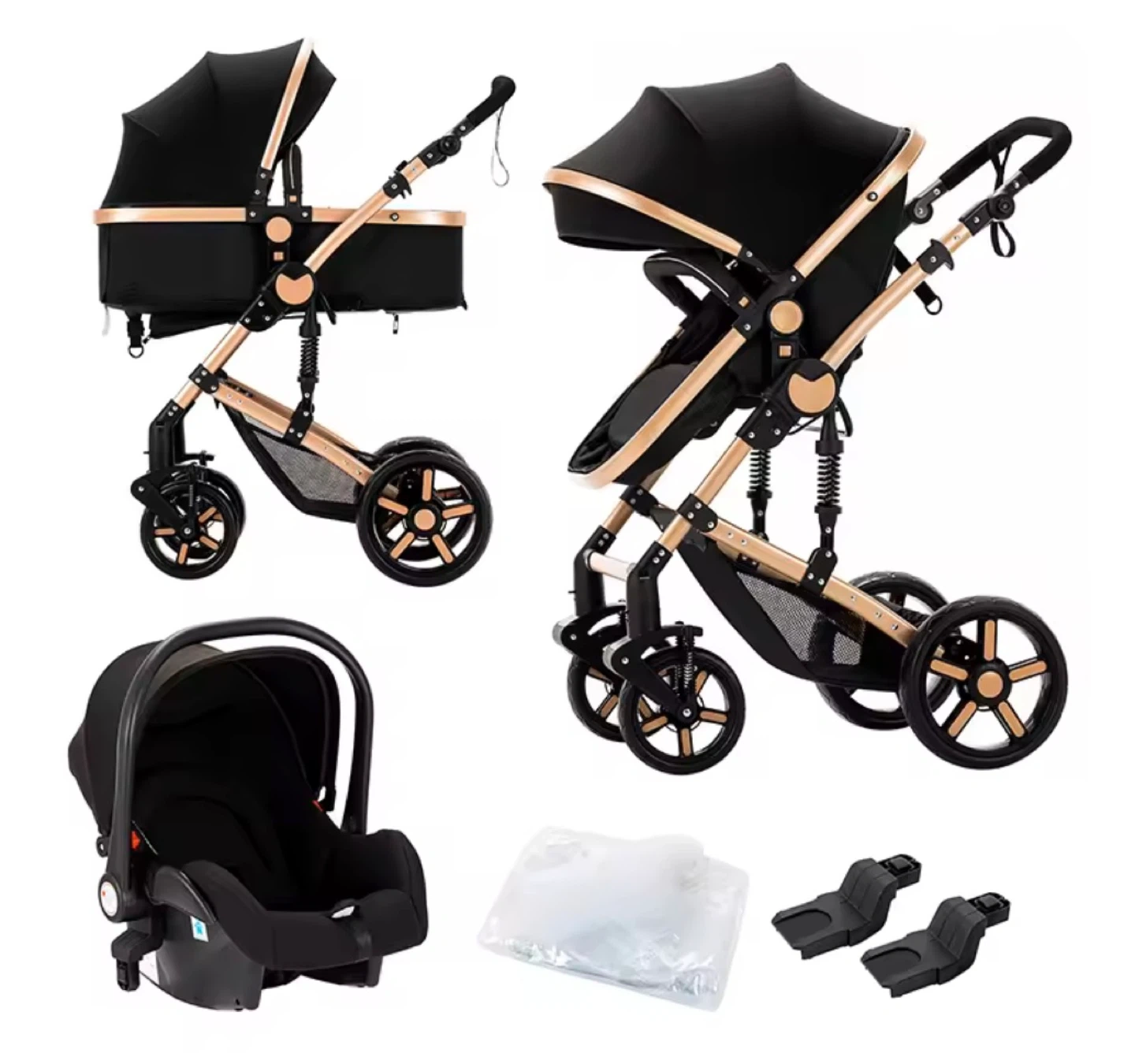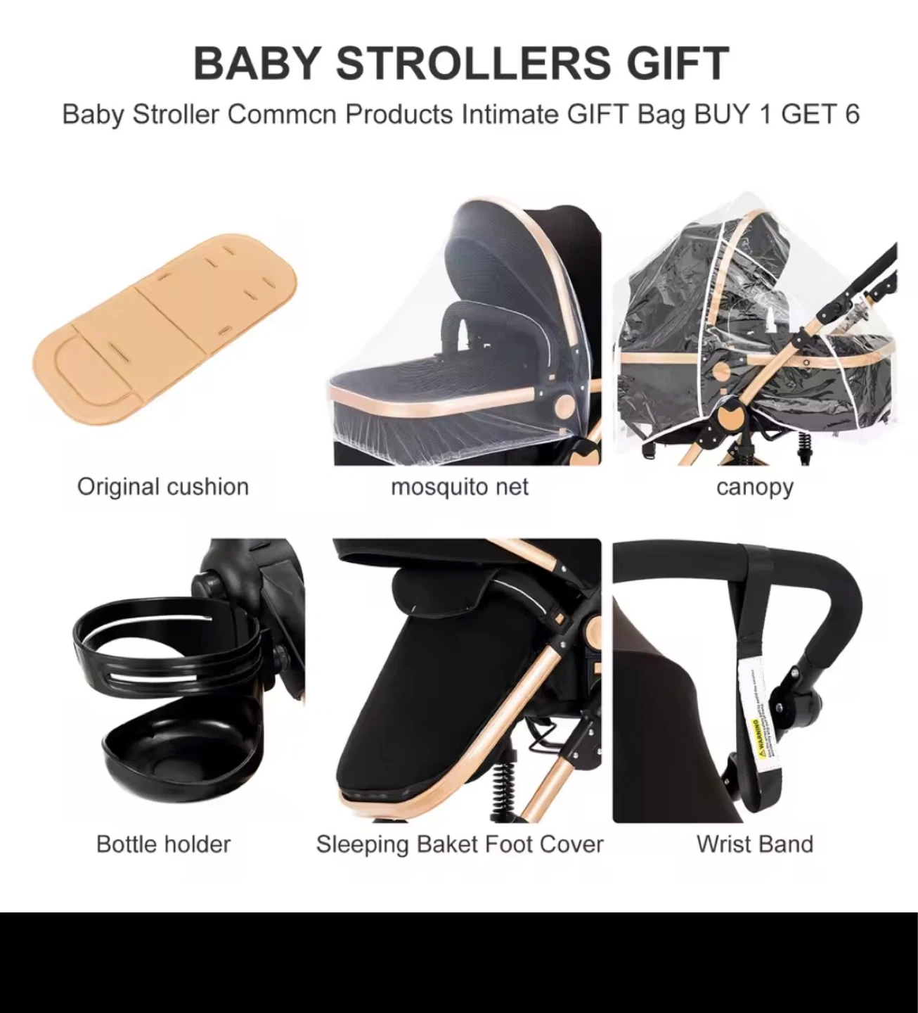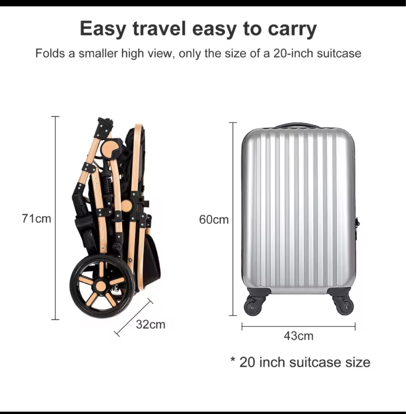 This black baby stroller comes with a bassinet and a car seat. It's foldable for easy travel, fitting into a 20-inch suitcase size when collapsed. Includes original cushion, canopy, bottle holder, sleeping basket foot cover, and wrist band. The item is almost new, just used 5-6 times.