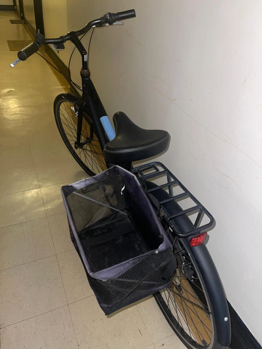 Midnight black. 26-inch retro bike with a steel frame, 7-speed transmission, and a 3-bike rack.