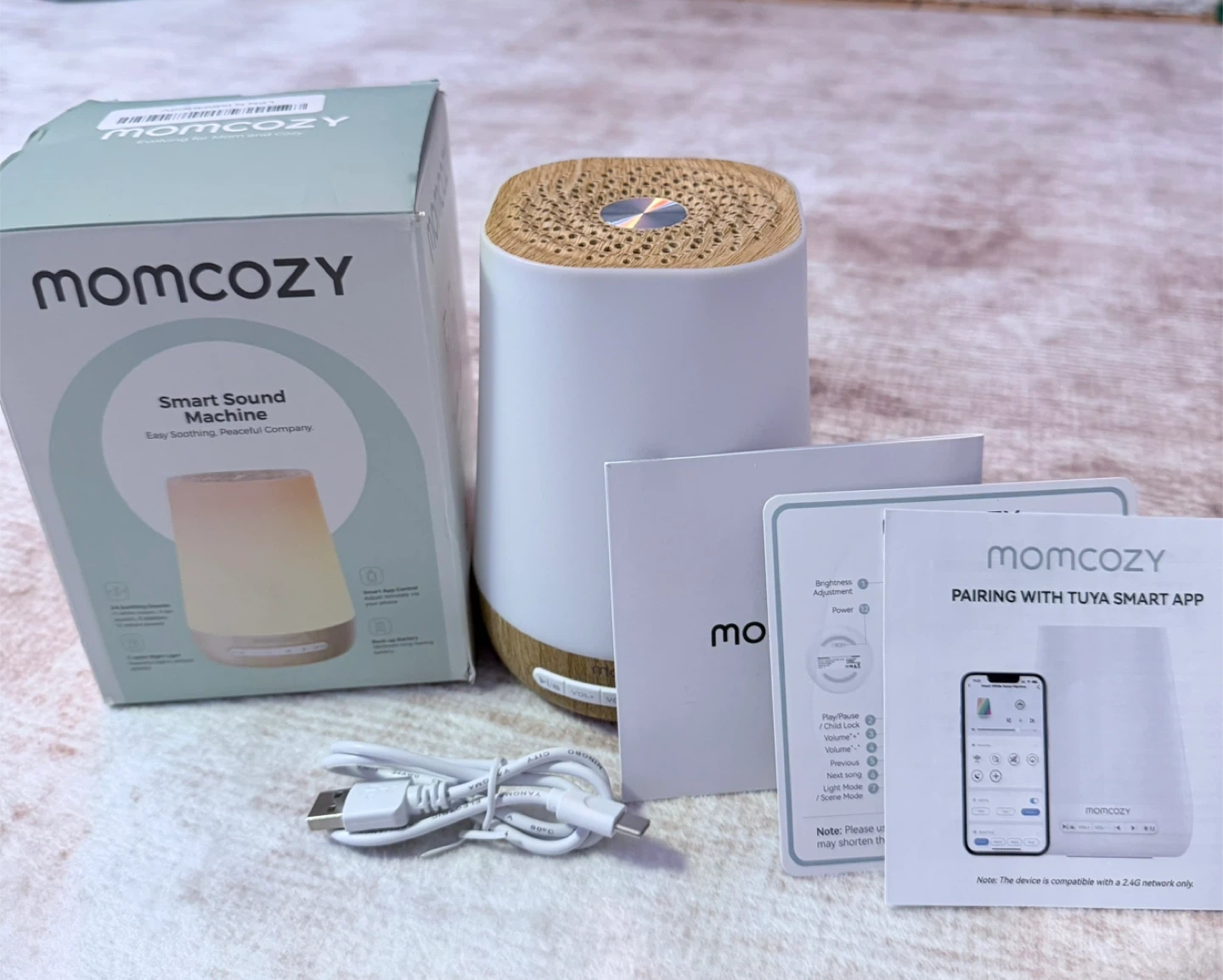 This Momcozy Smart Sound Machine offers easy soothing sounds and peaceful company. It features brightness adjustment, child lock, and light mode. The device connects with the Tuya Smart App for control.