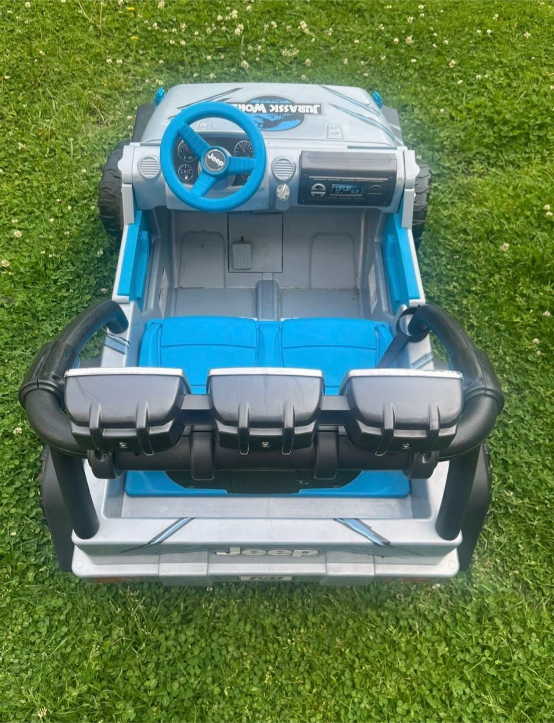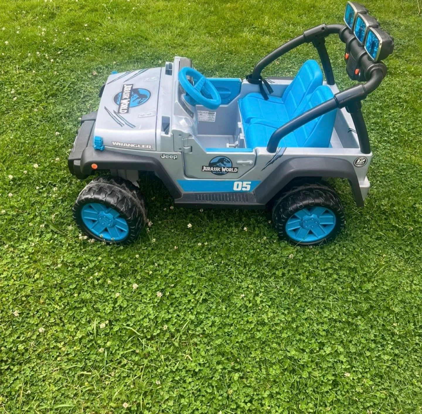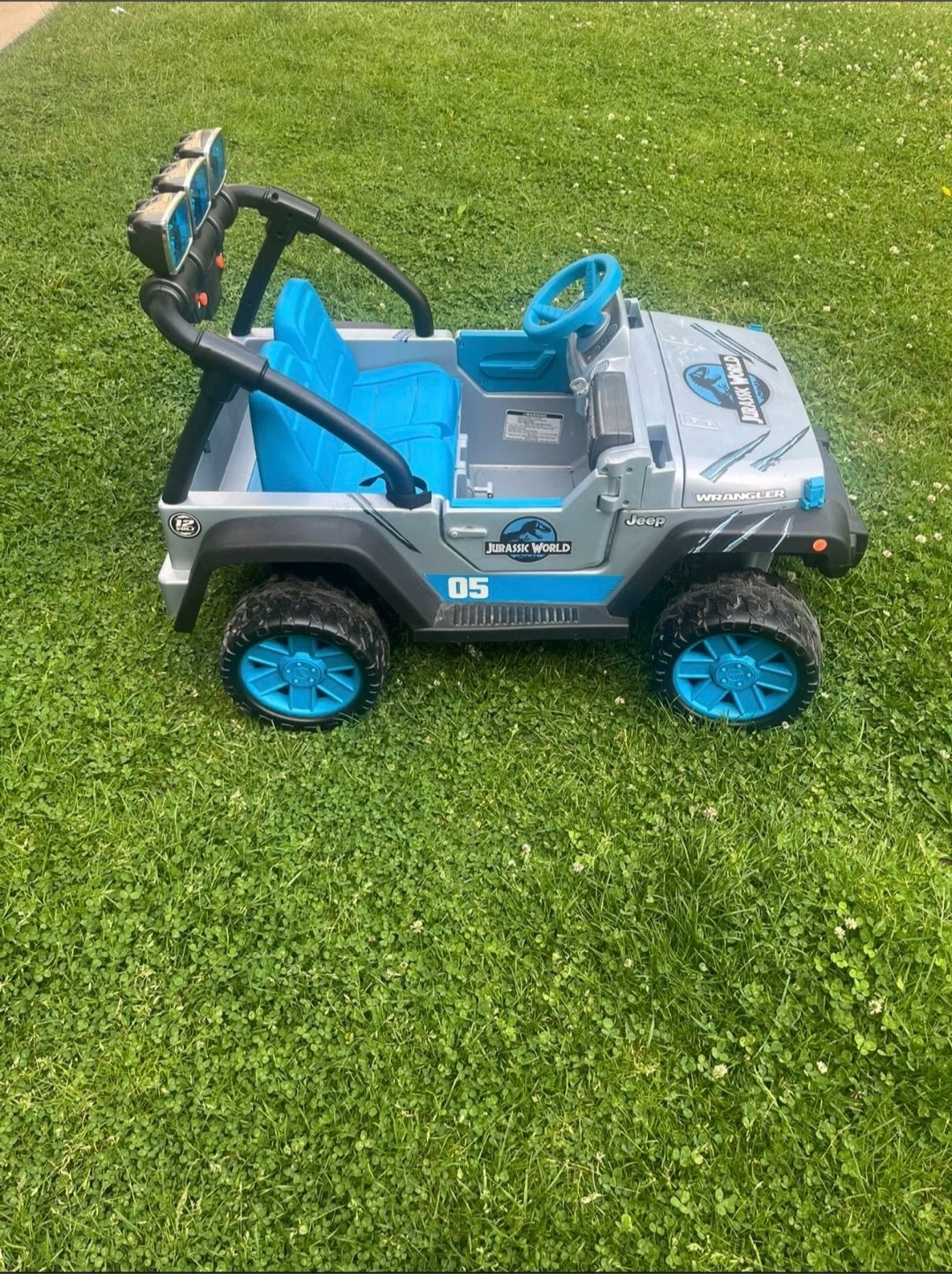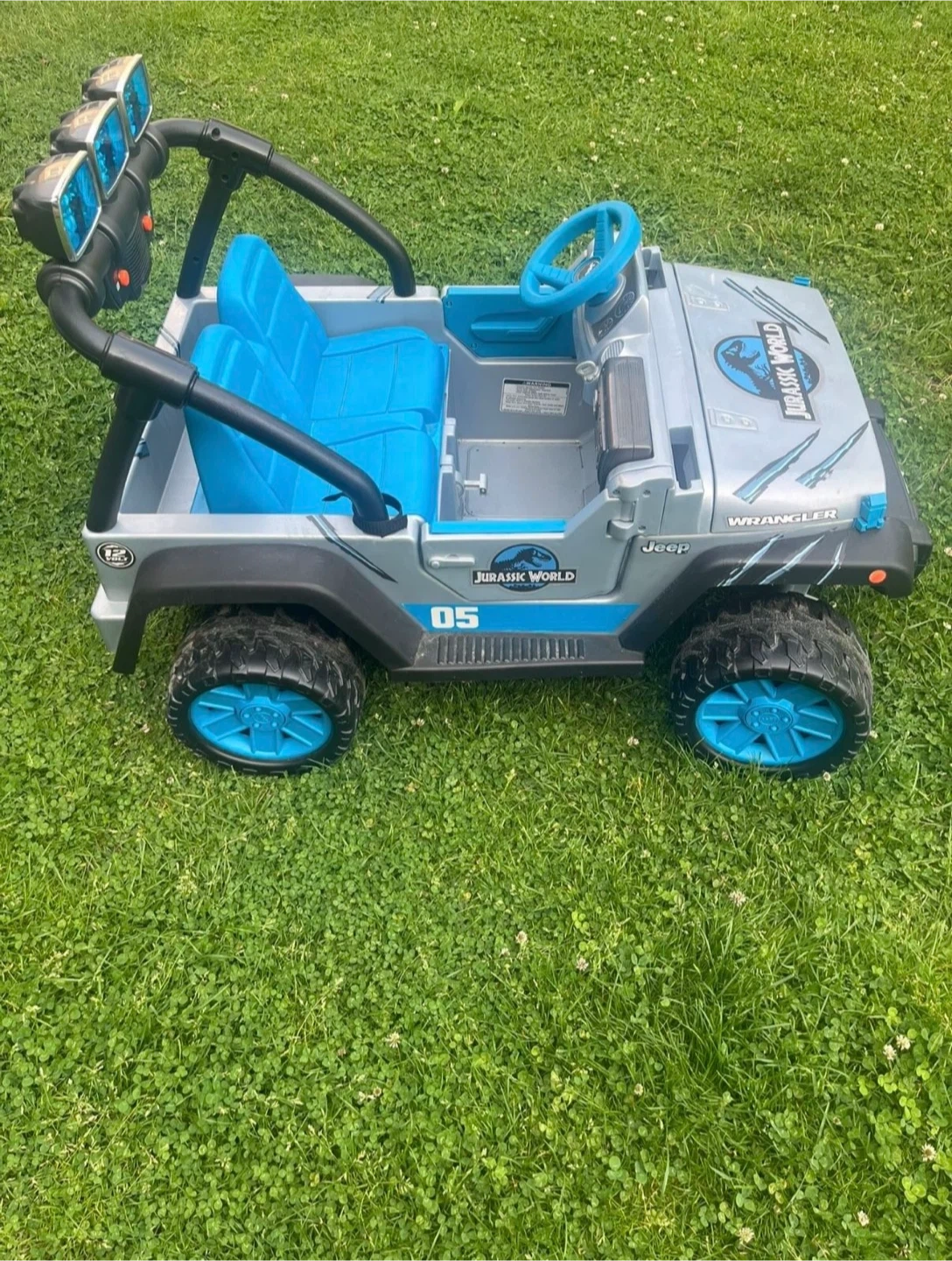 This kids' ride-on Jeep Wrangler features a fun Jurassic World theme with blue seats and accents. It's a great way for little adventurers to explore! Made of durable plastic for outdoor play and it’s In great condition as brand new power wheels Jurassic World Jeep Kids Car with two passengers seat age 3-7 with max weight 130 Lb and everything is working great it has battery and charger , very clean it’s just been used couple times you can try it before you buy .