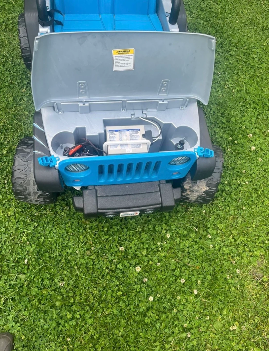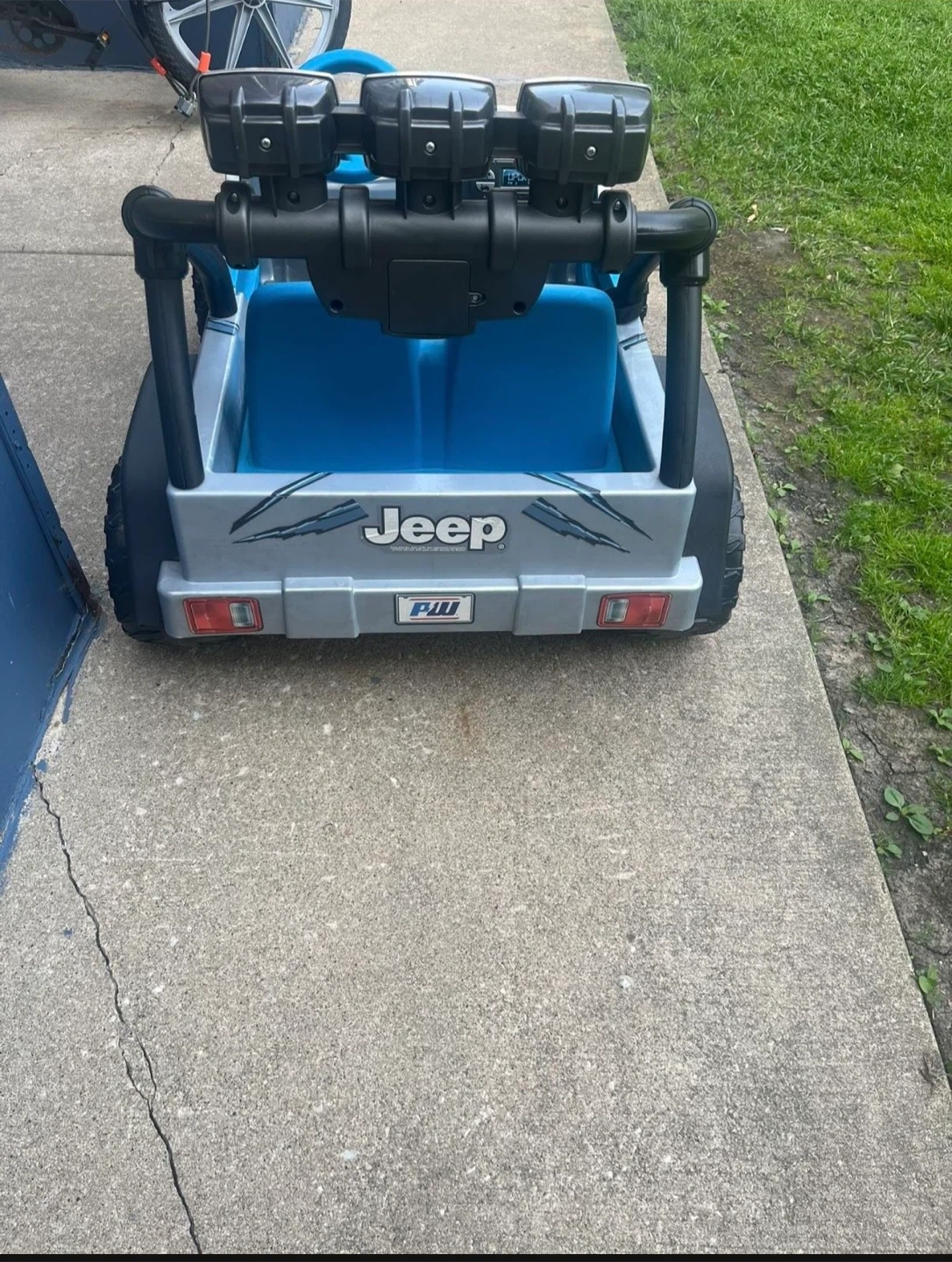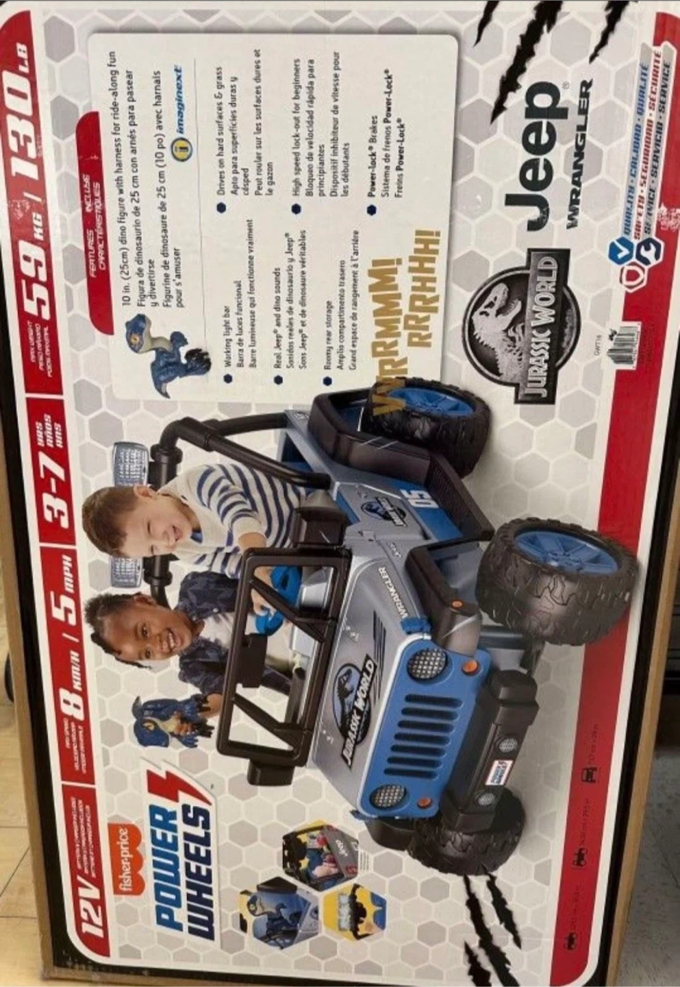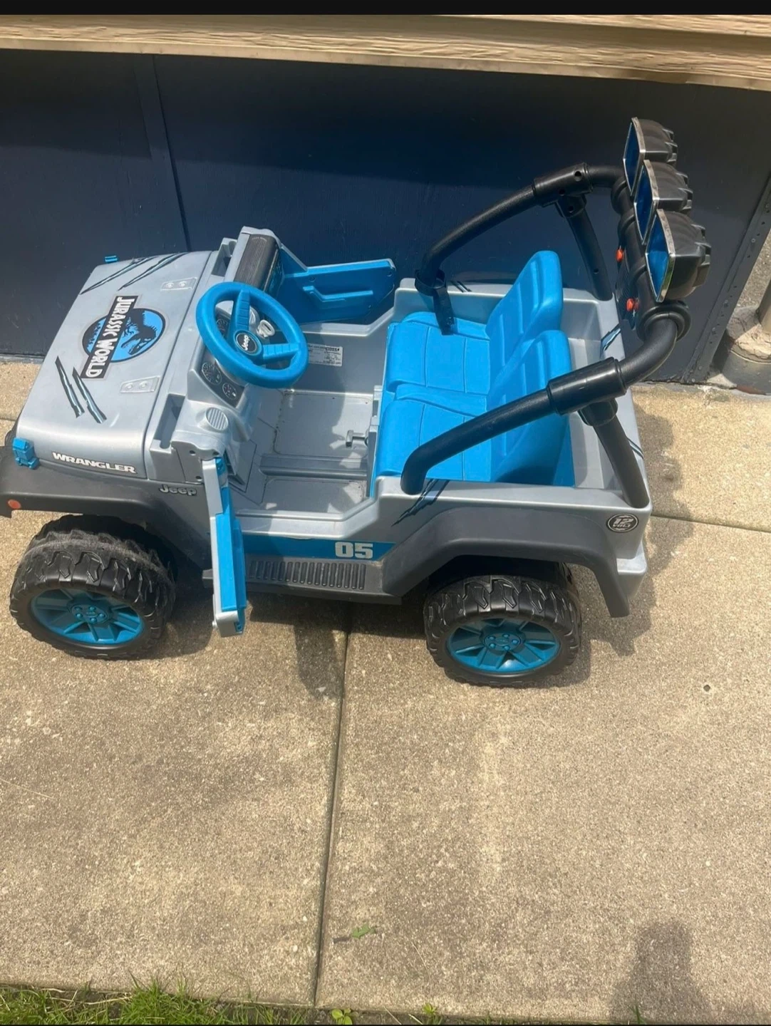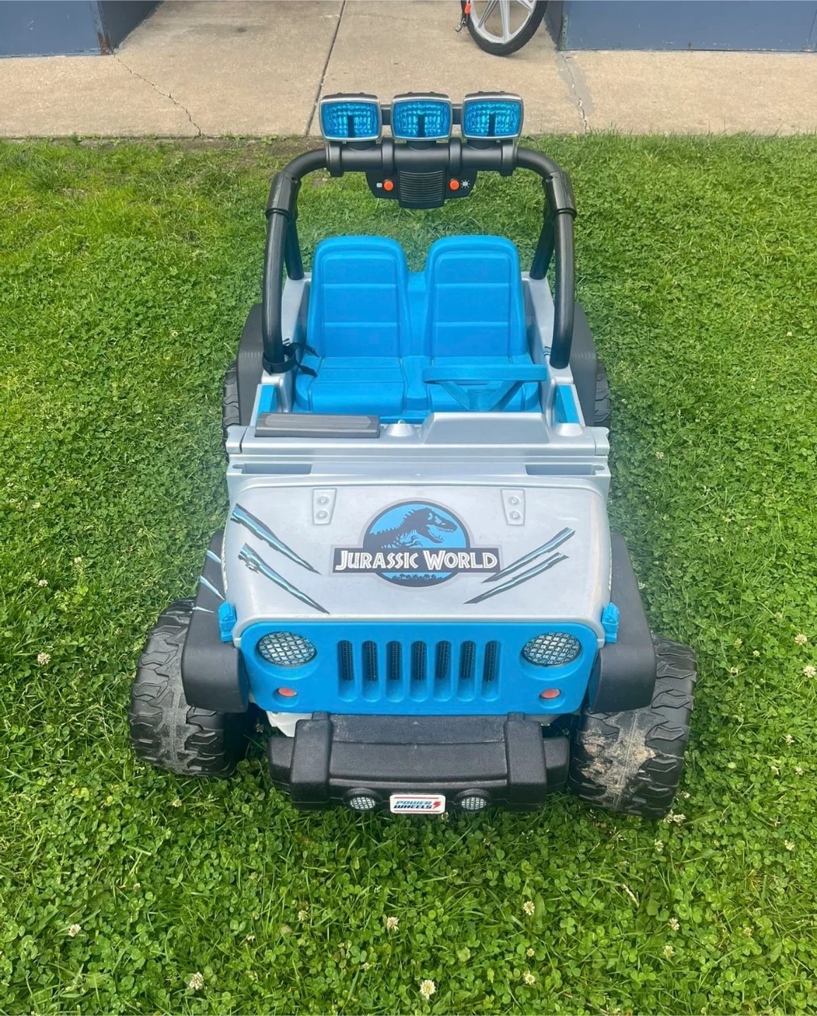 This kids' ride-on Jeep Wrangler features a fun Jurassic World theme with blue seats and accents. It's a great way for little adventurers to explore! Made of durable plastic for outdoor play and it’s In great condition as brand new power wheels Jurassic World Jeep Kids Car with two passengers seat age 3-7 with max weight 130 Lb and everything is working great it has battery and charger , very clean it’s just been used couple times you can try it before you buy .