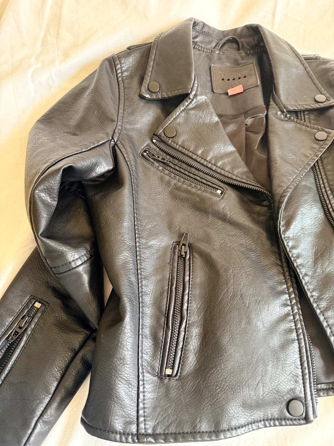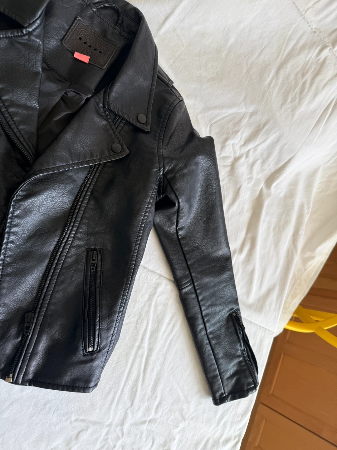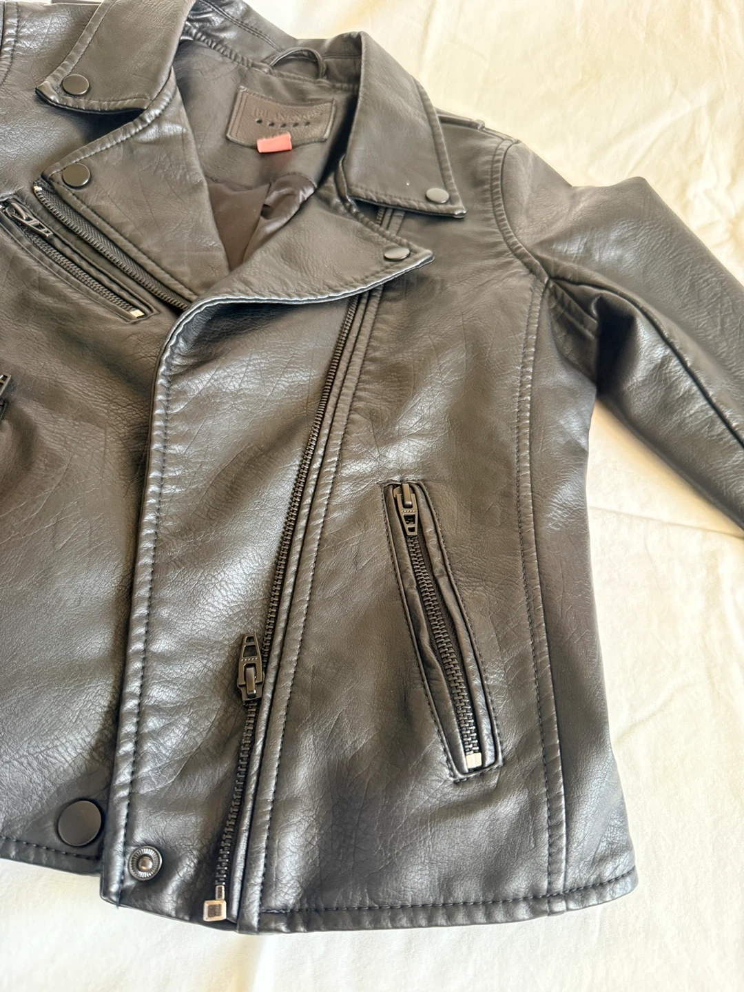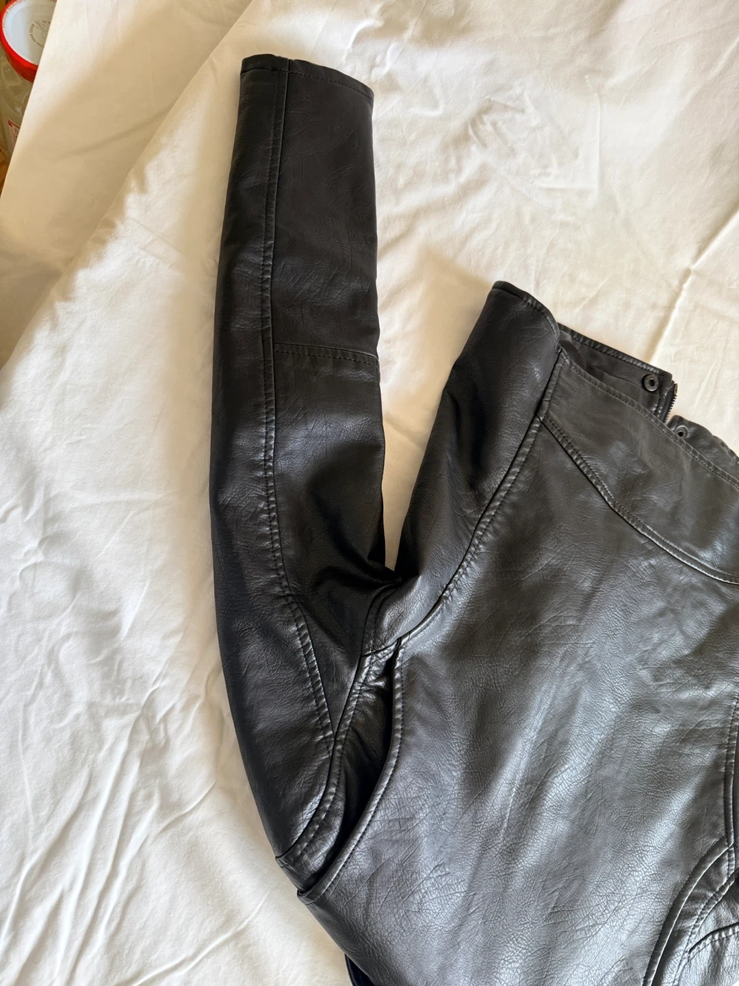 Black faux leather moto jacket. It's a size L. This jacket has a classic moto style with a zippered front and lapel. Looks great for everyday wear!