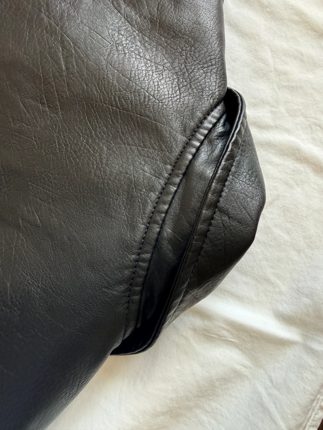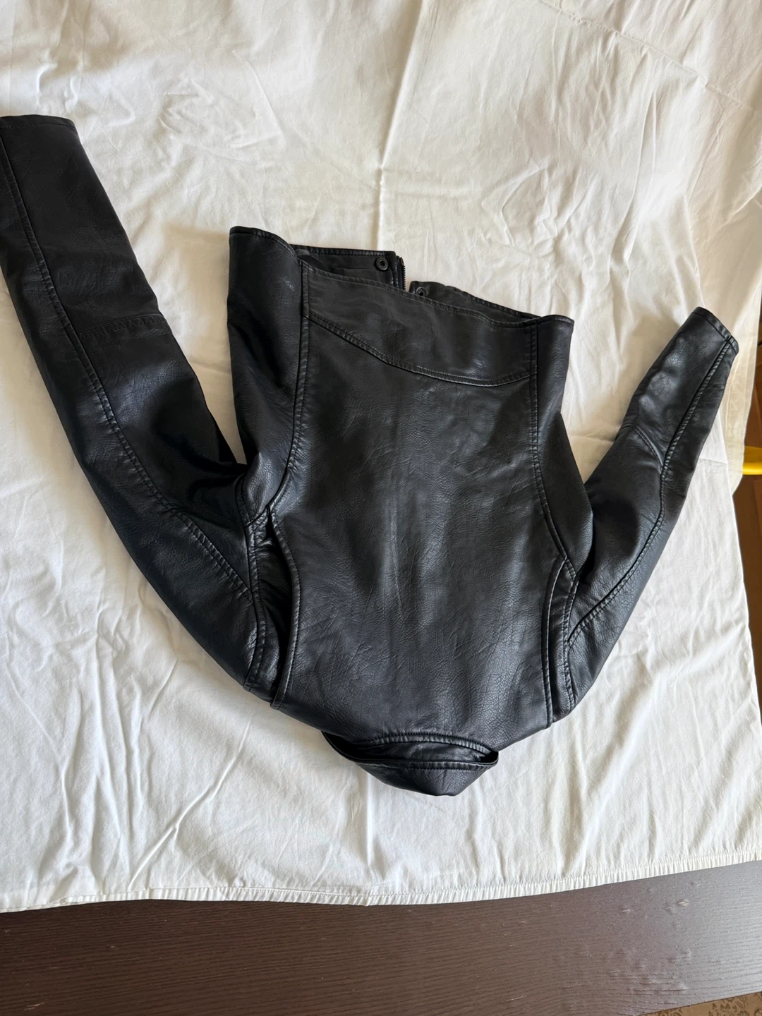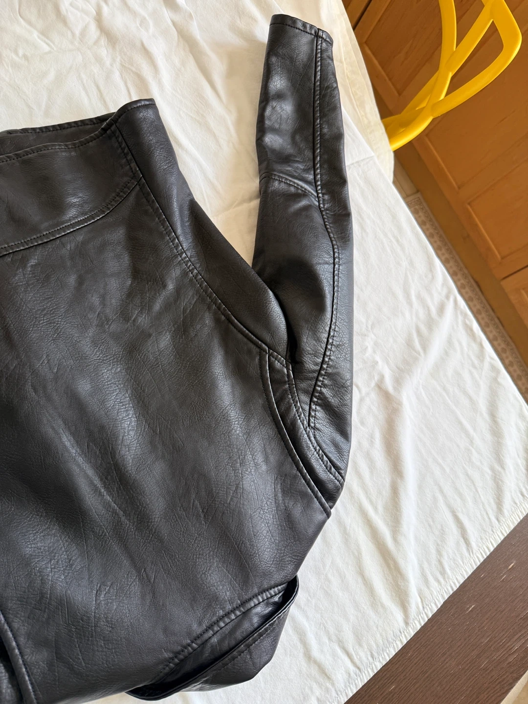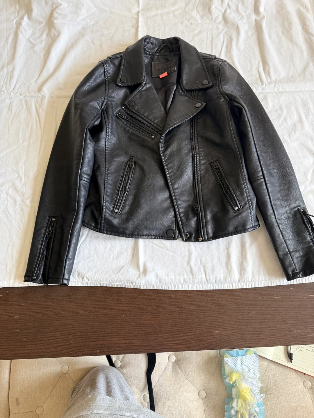 Black faux leather moto jacket. It's a size L. This jacket has a classic moto style with a zippered front and lapel. Looks great for everyday wear!