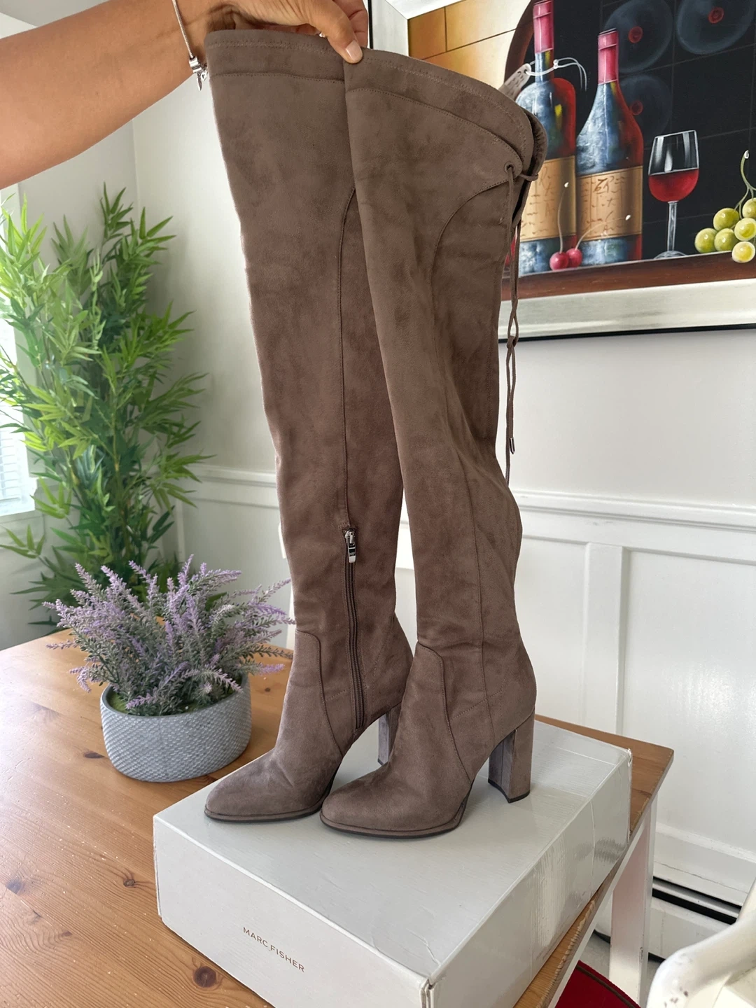 Marc Fisher over-the-knee boots in a taupe/brown faux suede. Features a side zipper and lace-up detail at the back. Block heel measures approximately 3.5 inches. These are perfect for a stylish winter look!