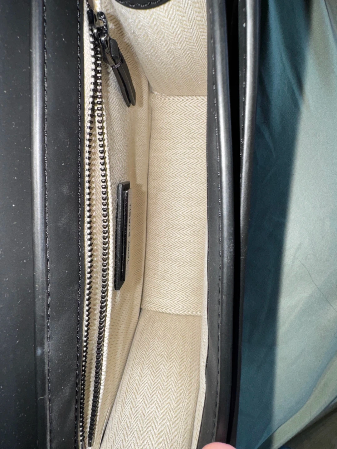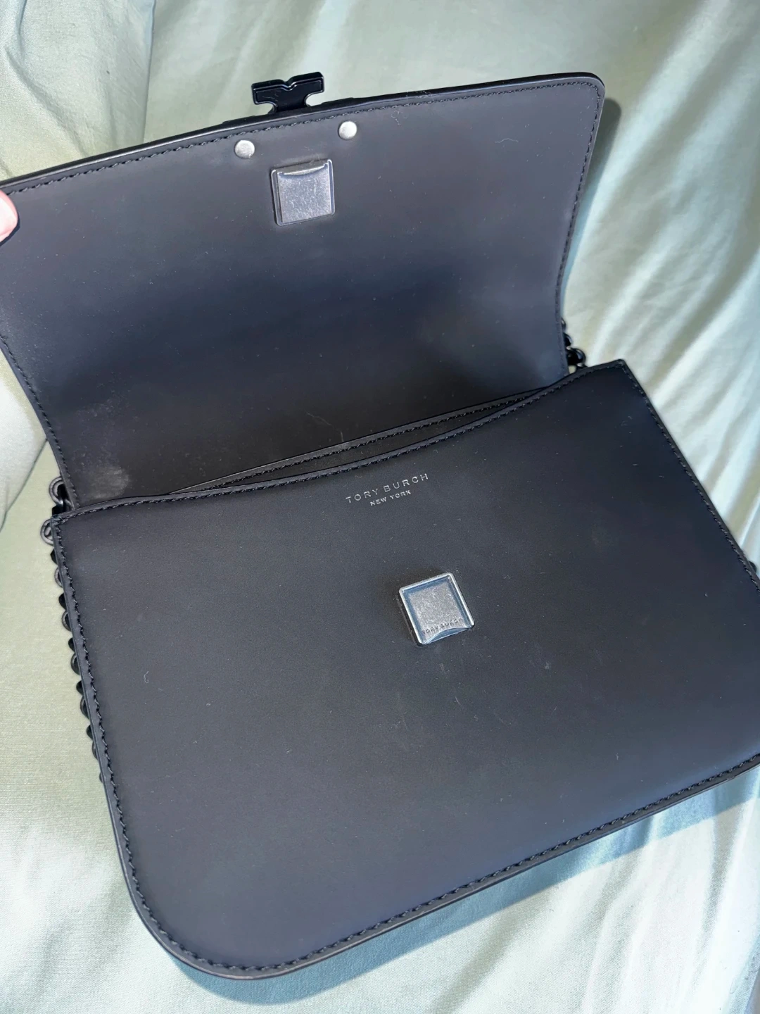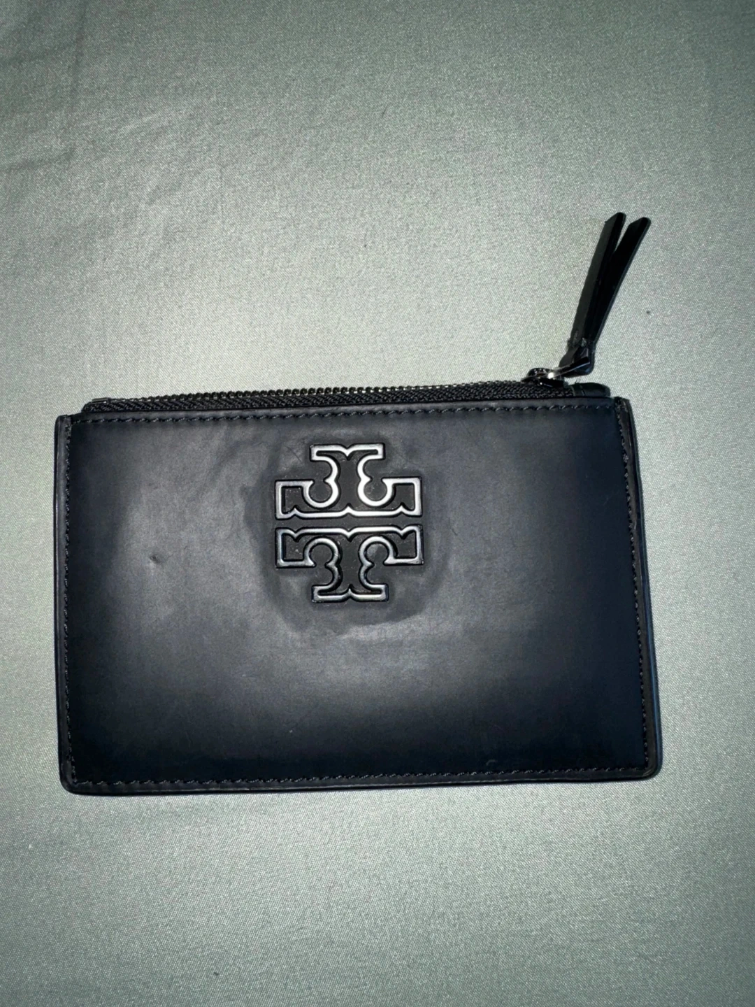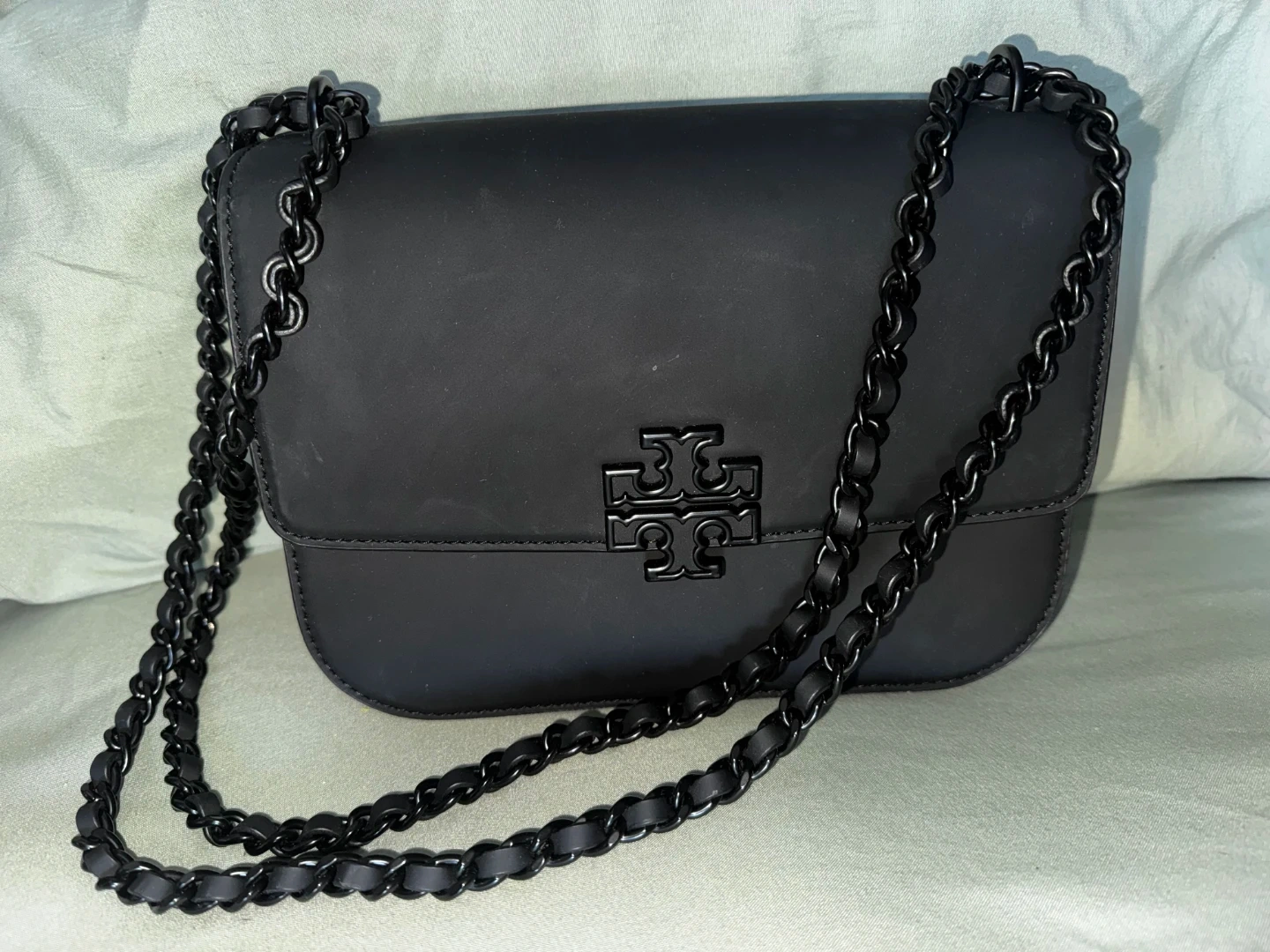 Tory Burch black leather shoulder bag with a chain strap. Interior has a zippered compartment and card slots. Bag measures approximately 7" W x 5" H x 3" D. Comes with a Tory Burch black leather cardholder. Excellent condition!