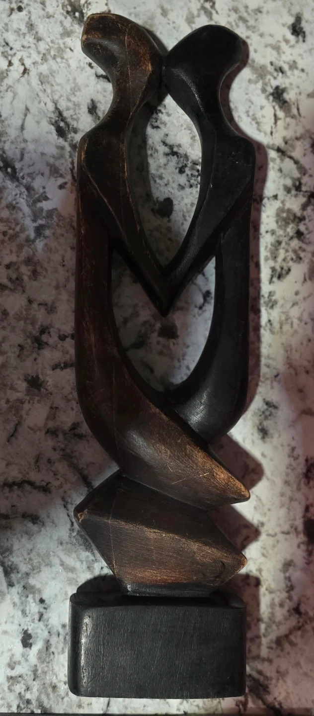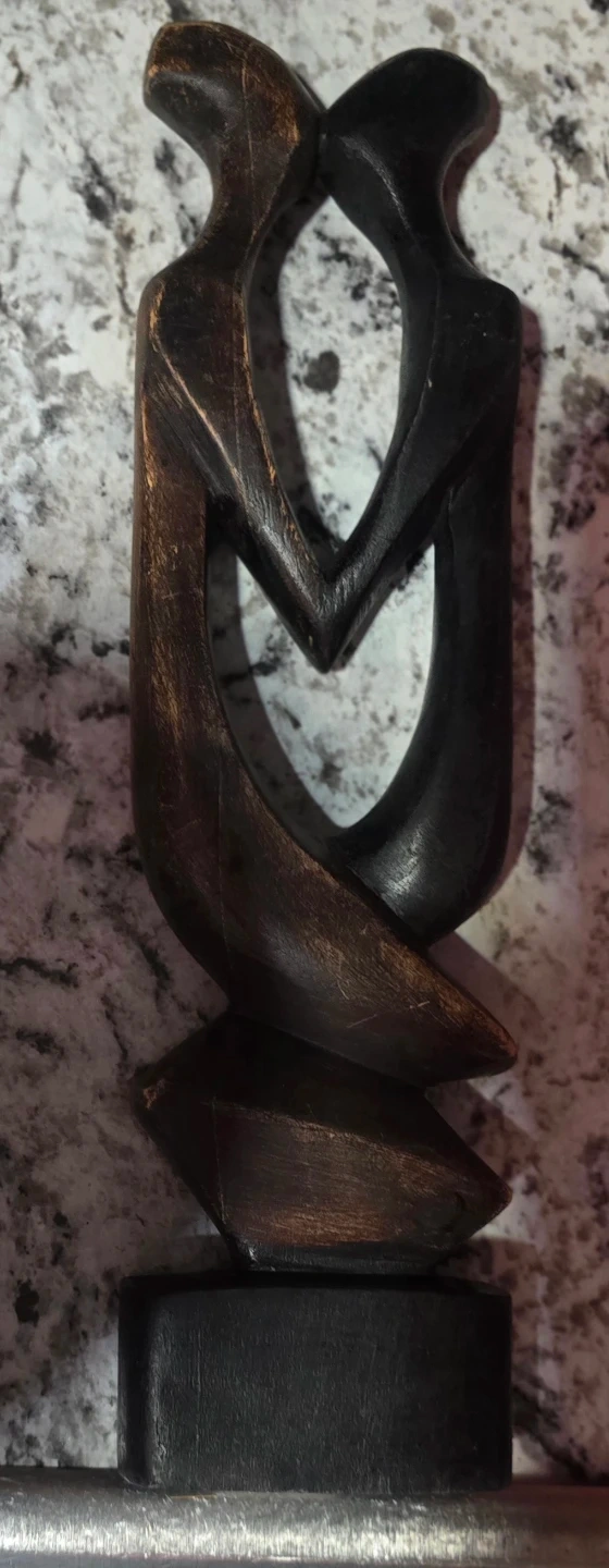 This abstract wooden sculpture depicts a loving couple intertwined. It's made of dark wood with a slightly distressed finish on the edges. The base is solid black wood. Approximately 13 inches tall.