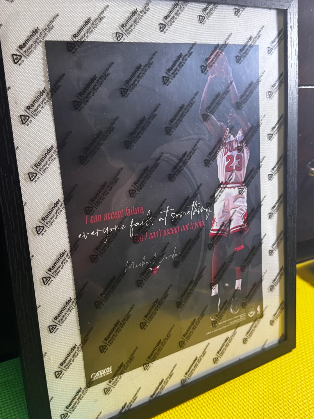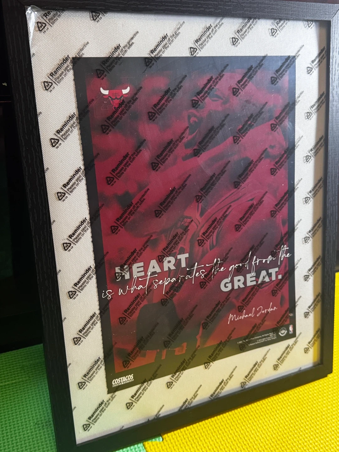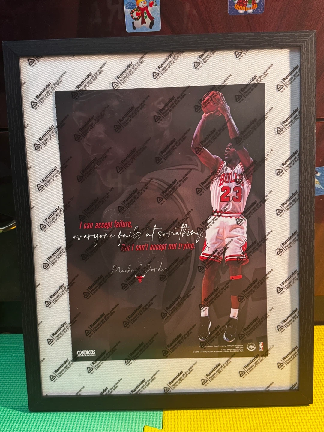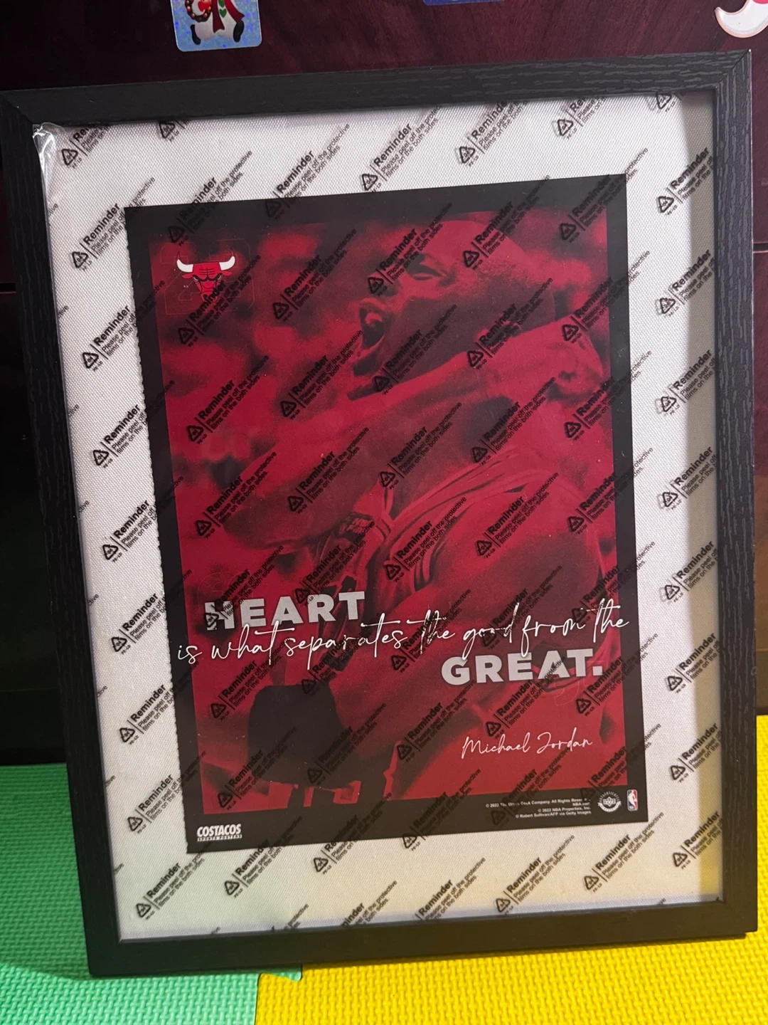 Features a framed print with Michael Jordan in action, showcasing quotes like 'HEART is what separates the good from the GREAT.' and 'I can accept failure, everyone fails at something. But I can't accept not trying.' Includes Costacos branding. Perfect for a sports fan's collection!