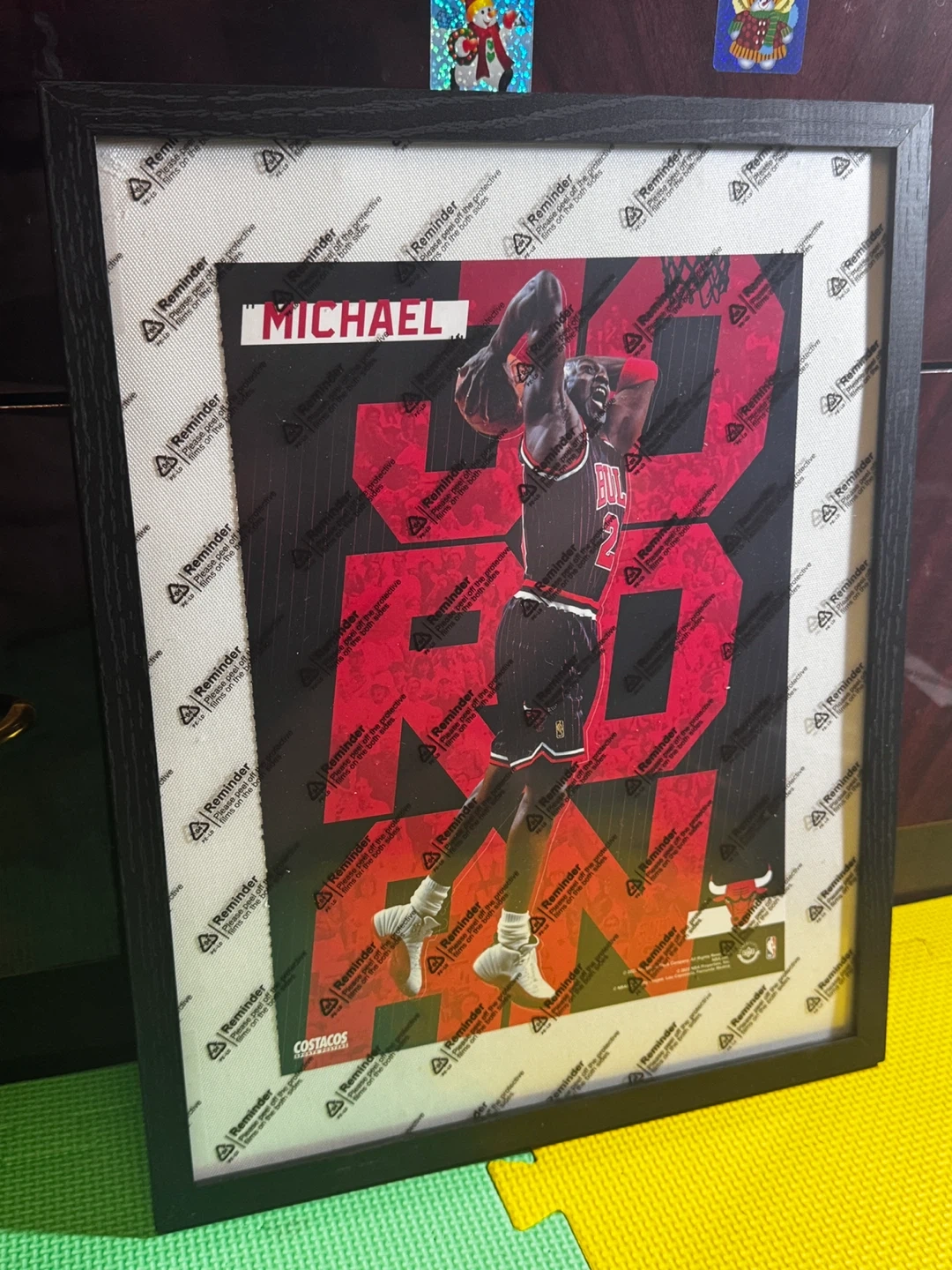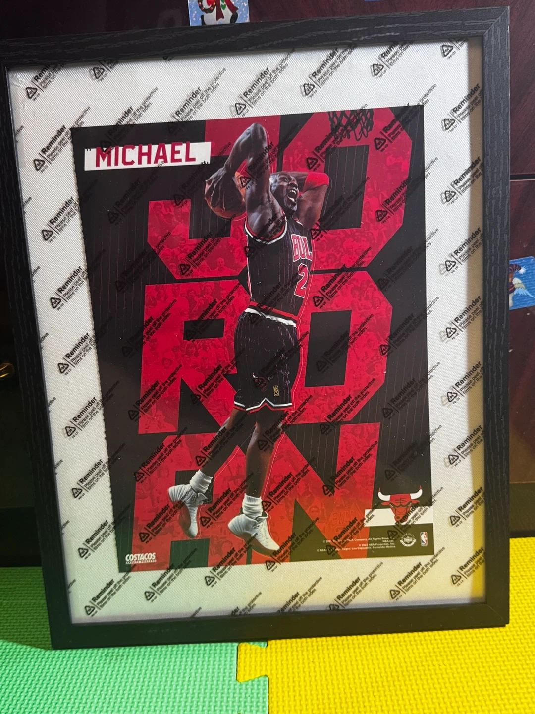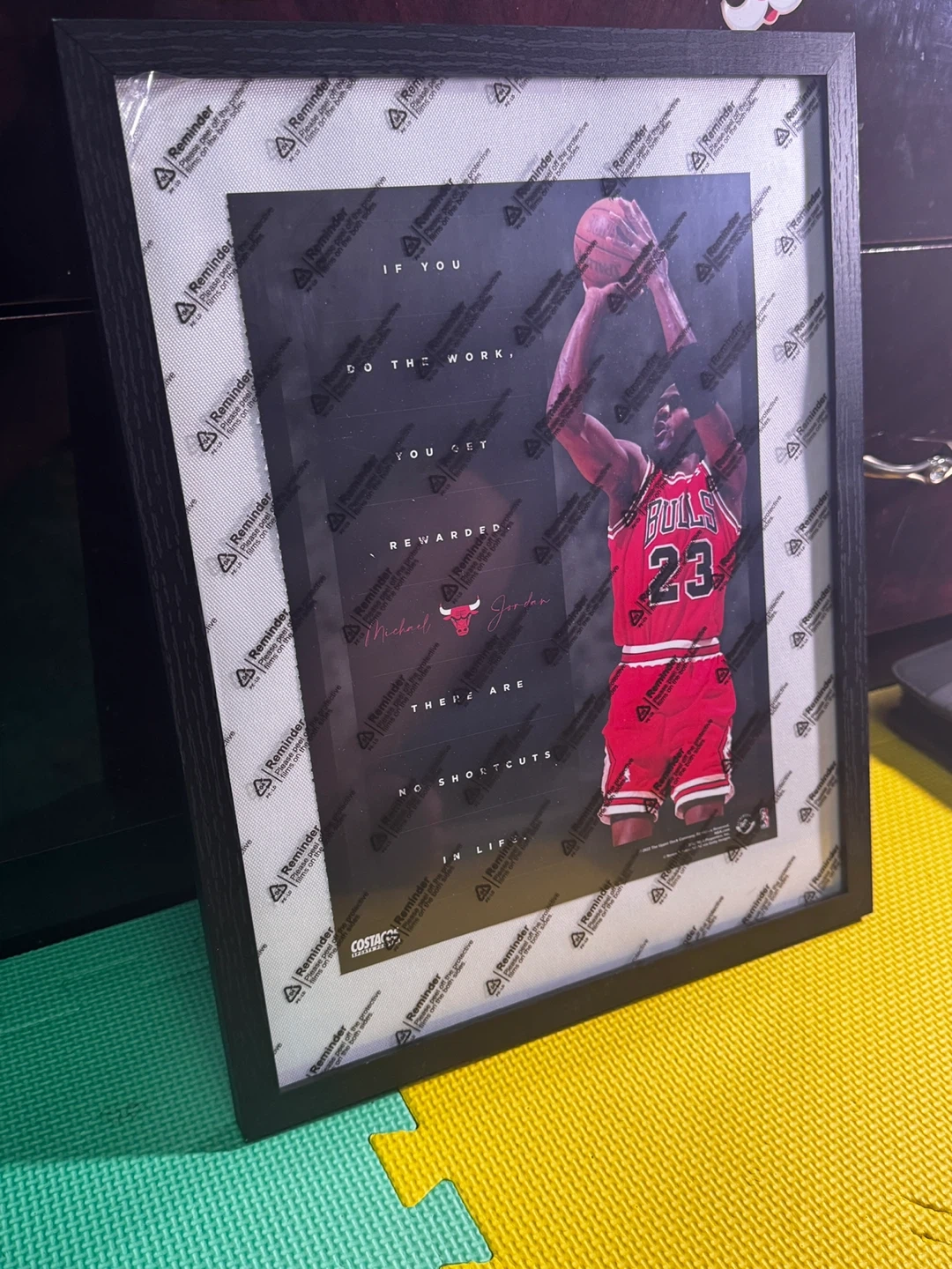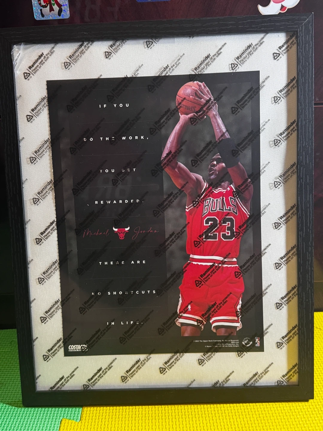Features a framed print with Michael Jordan in action, showcasing quotes like 'HEART is what separates the good from the GREAT.' and 'I can accept failure, everyone fails at something. But I can't accept not trying.' Includes Costacos branding. Perfect for a sports fan's collection!
