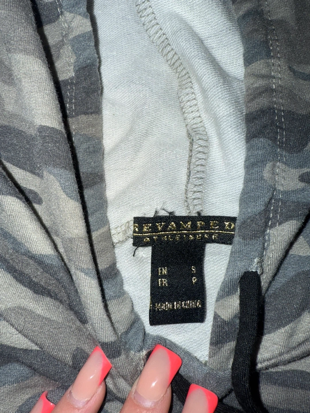 This REVAMPED CO. cropped hoodie features a cool camouflage print. It's a size small with black stripe detailing on the sleeves. Made in China.