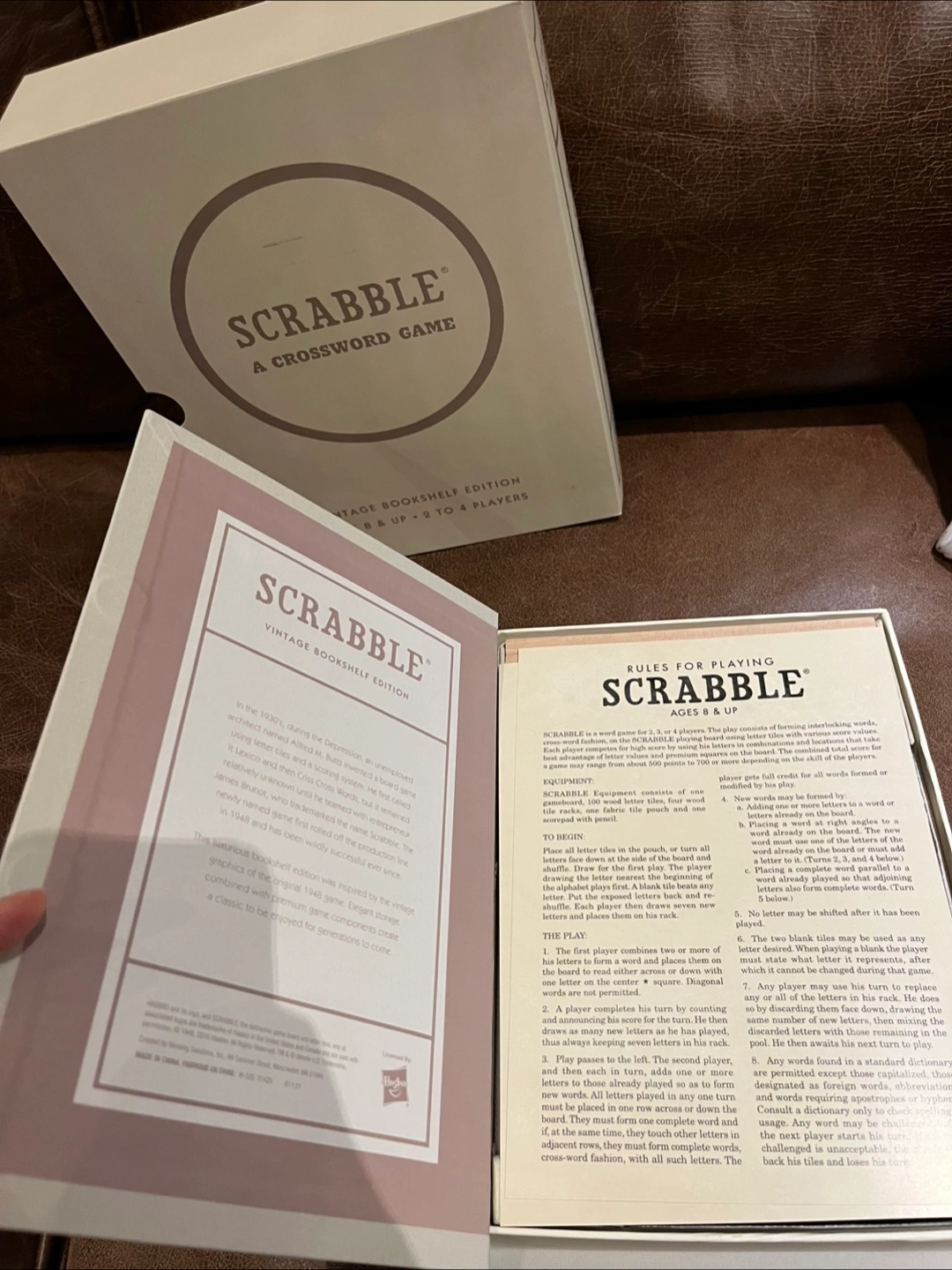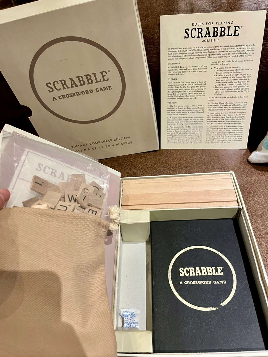 Vintage Bookshelf edition Scrabble game. Includes game board, letter tiles, tile rack, and rule book. For 2 to 4 players, ages 8 and up.