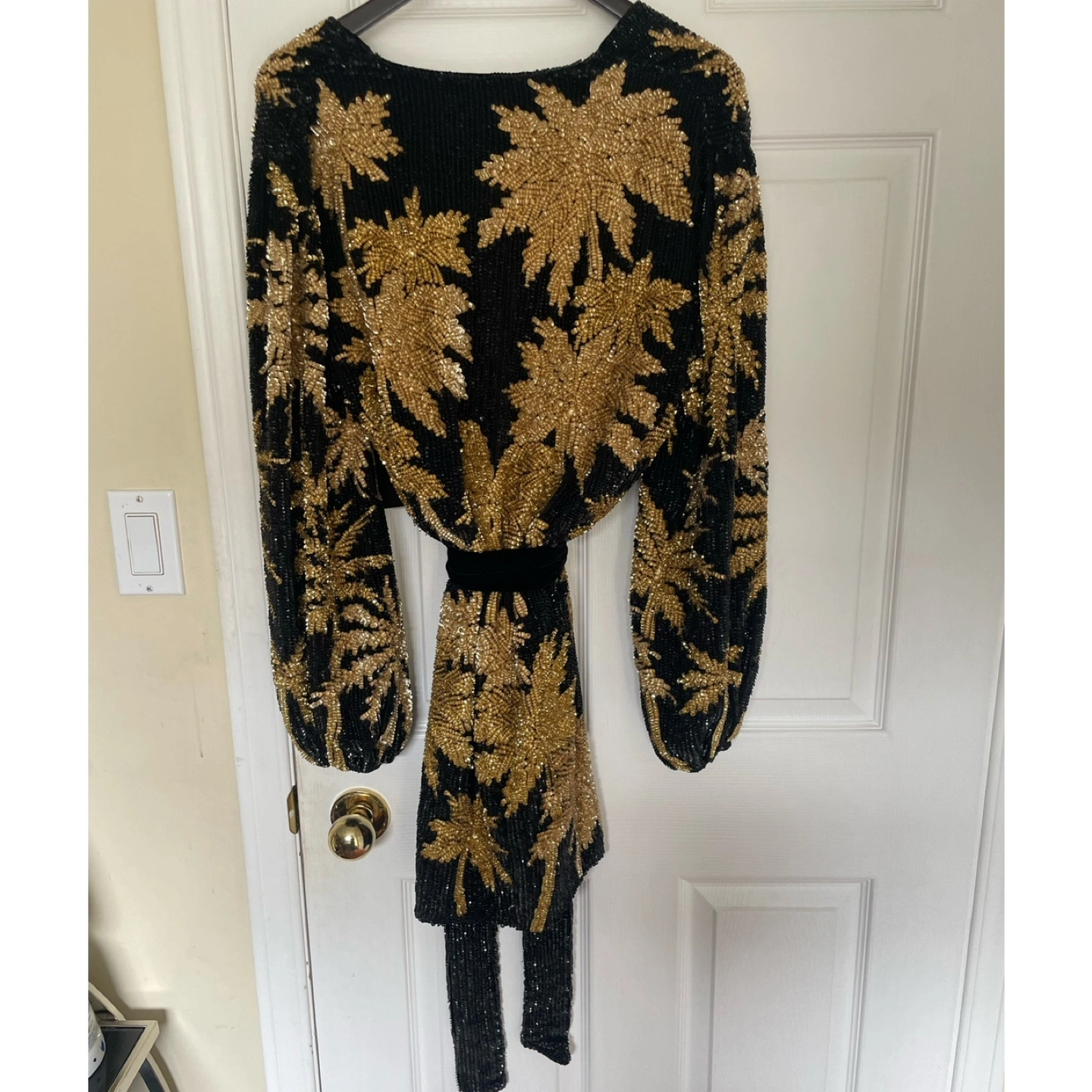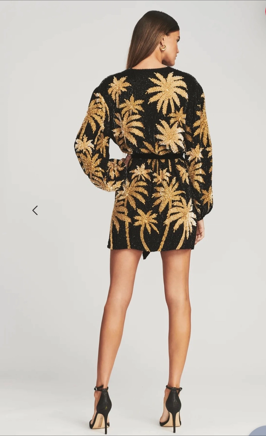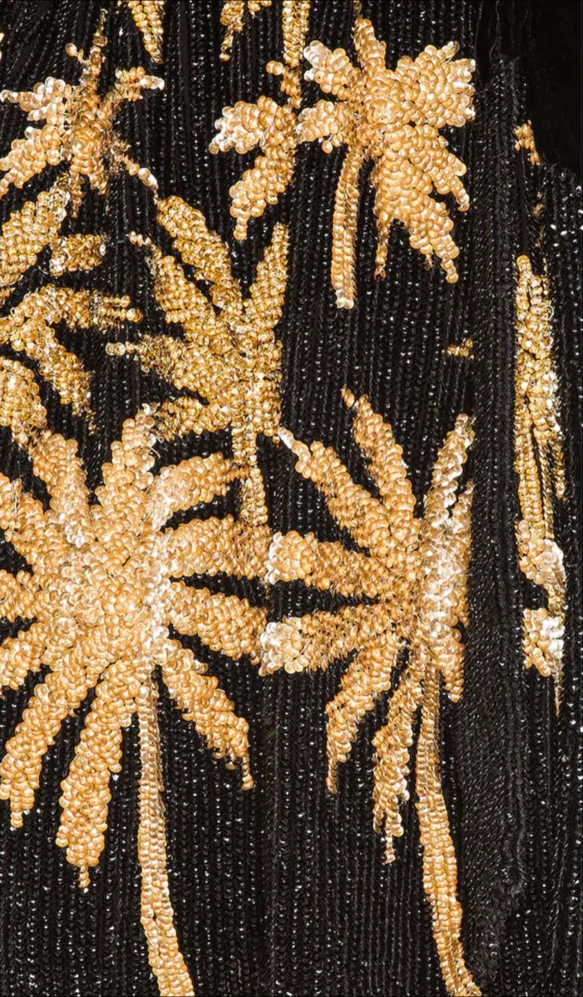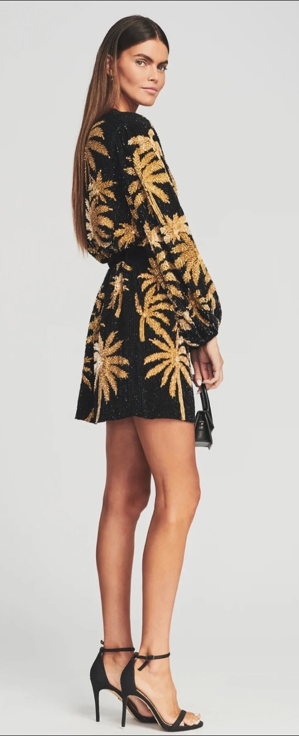 Introducing the ultimate party frock: The Gabrielle Robe. Enveloped in hand-stitched sequin embellishments, this timeless silhouette features a wrap bodice, which is complemented by voluminous blouson sleeves and a velvet tie belt to cinch the waist. For a micro mini moment, we recommend sizing down. Shown here in Black & Gold Palm.