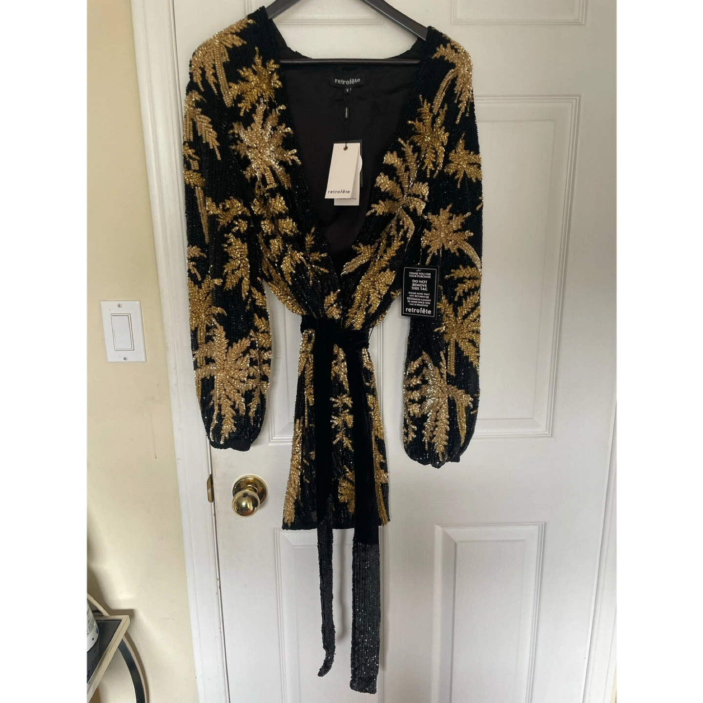 Retrofete NEW Gabrielle Dress Black & Gold Palm Tree Size Small