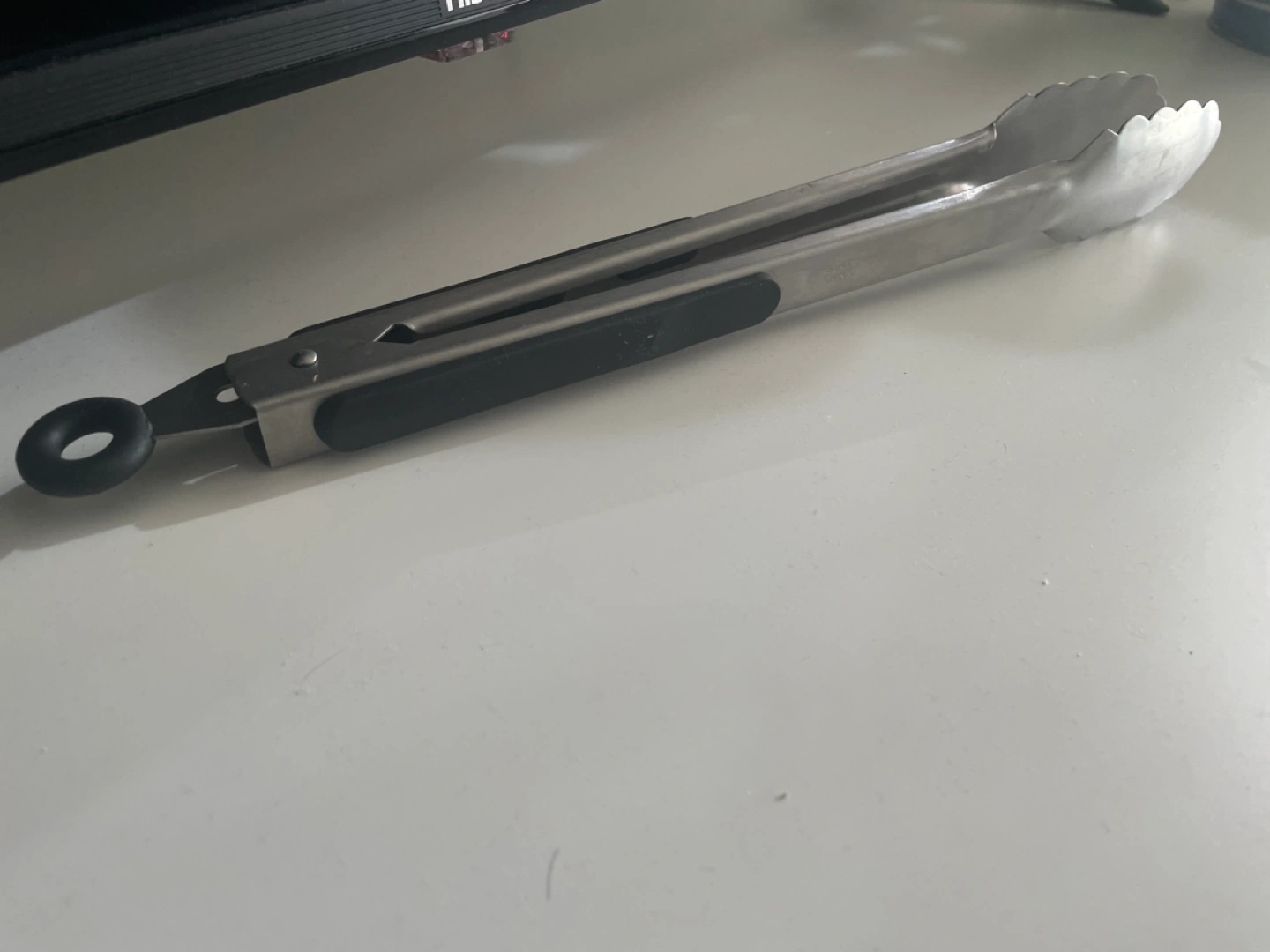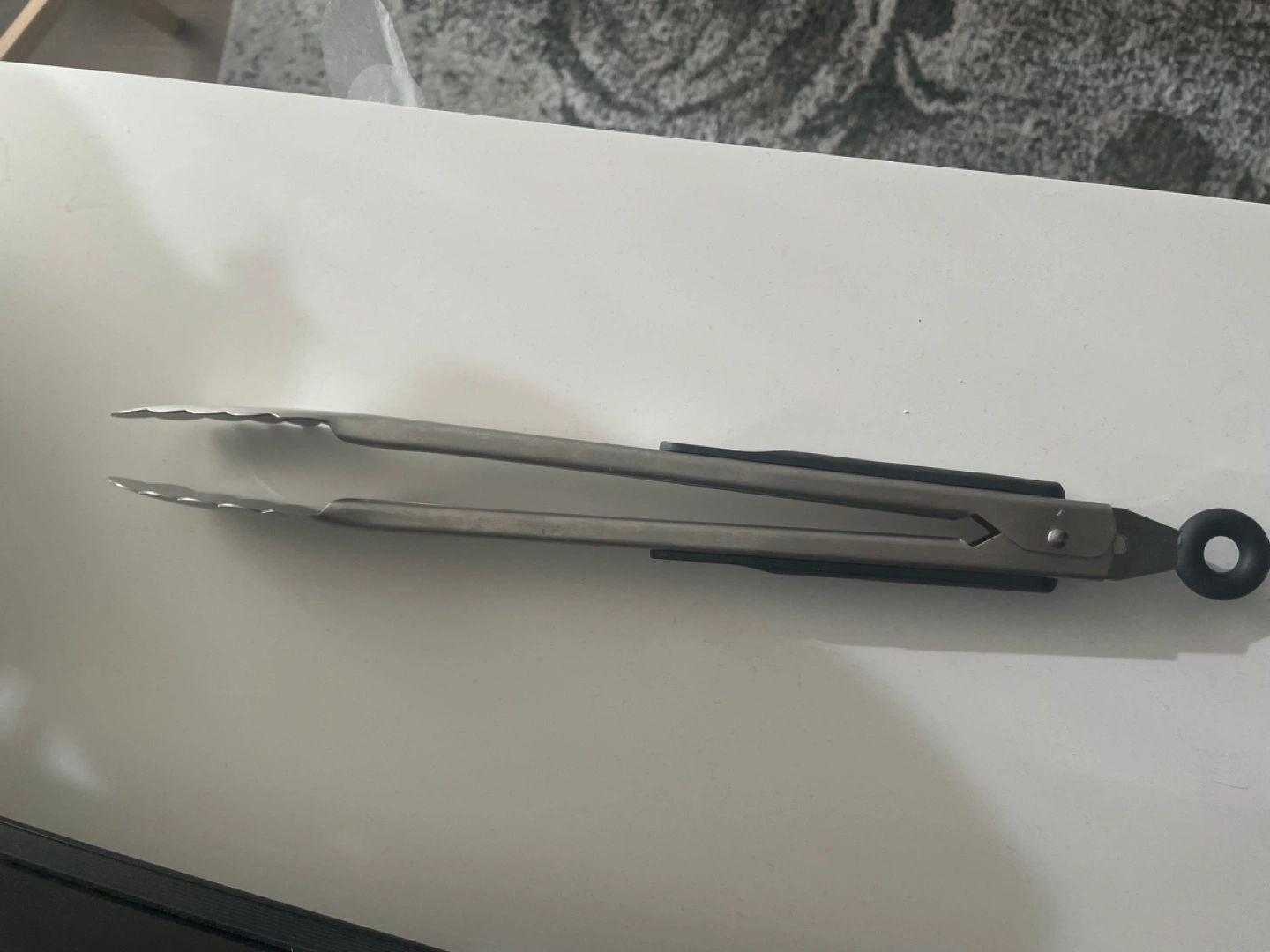Stainless steel tongs with a black rubber handle. Great for grilling, serving salads, or other food preparation.