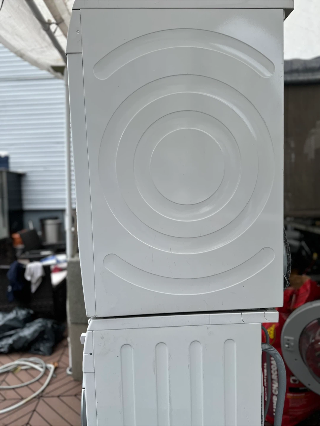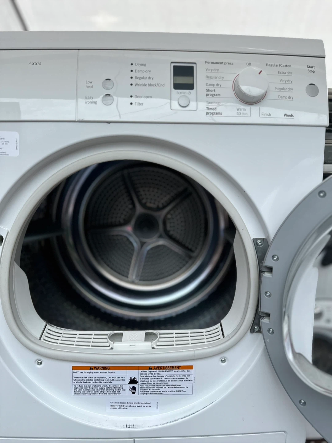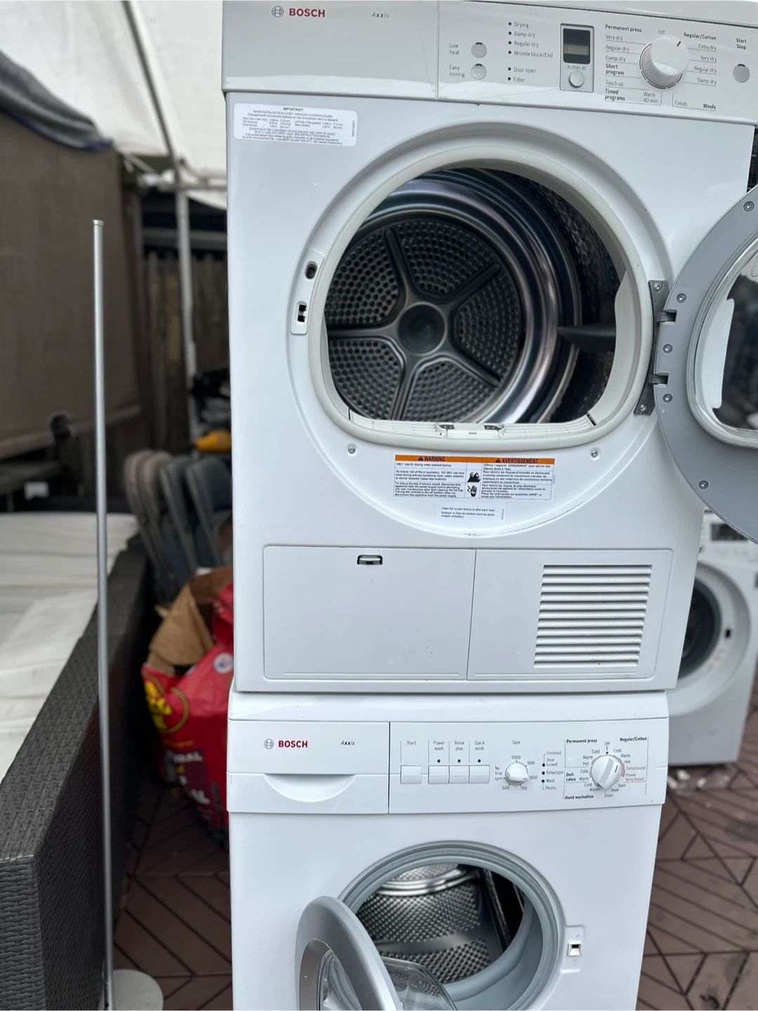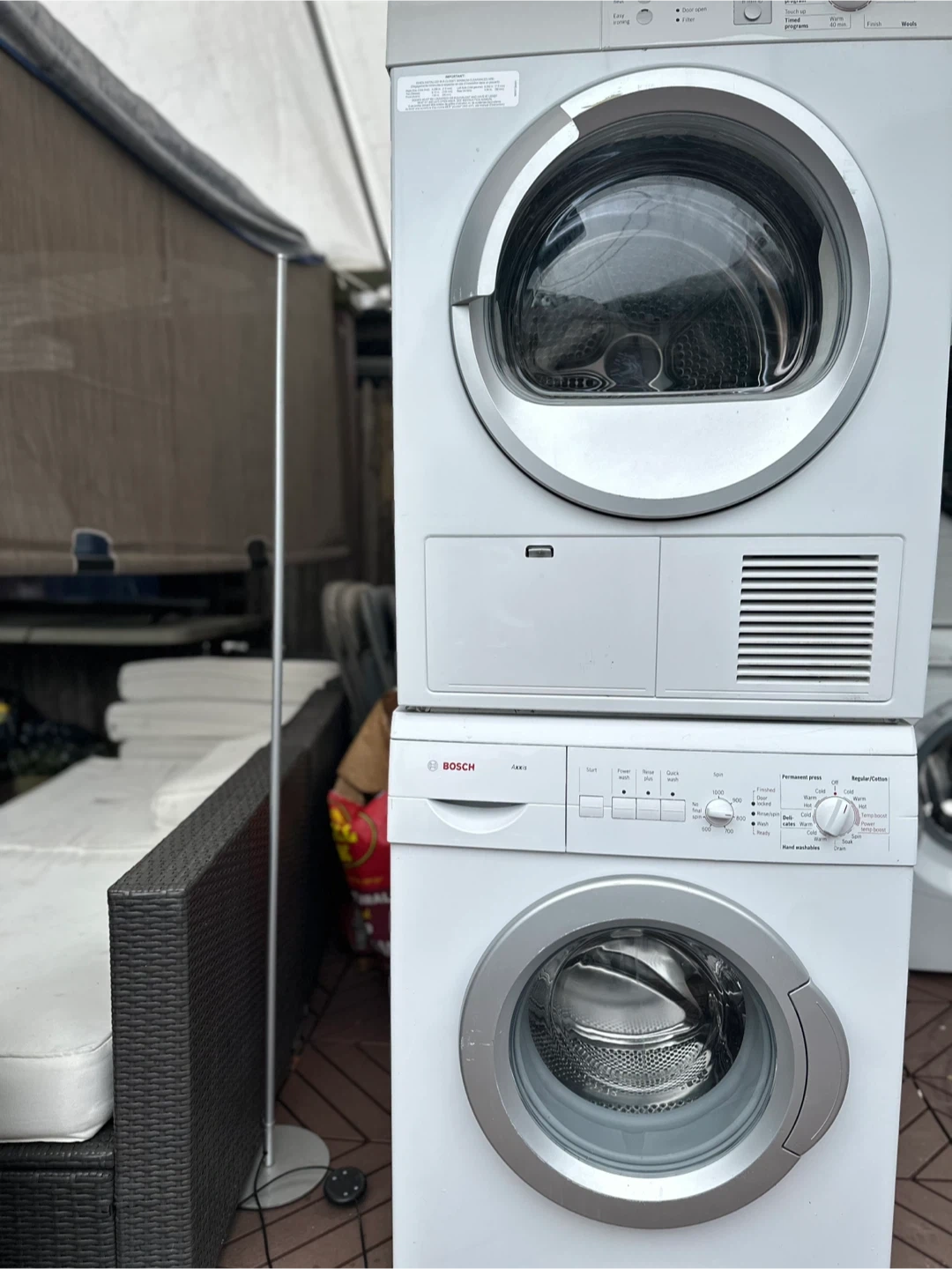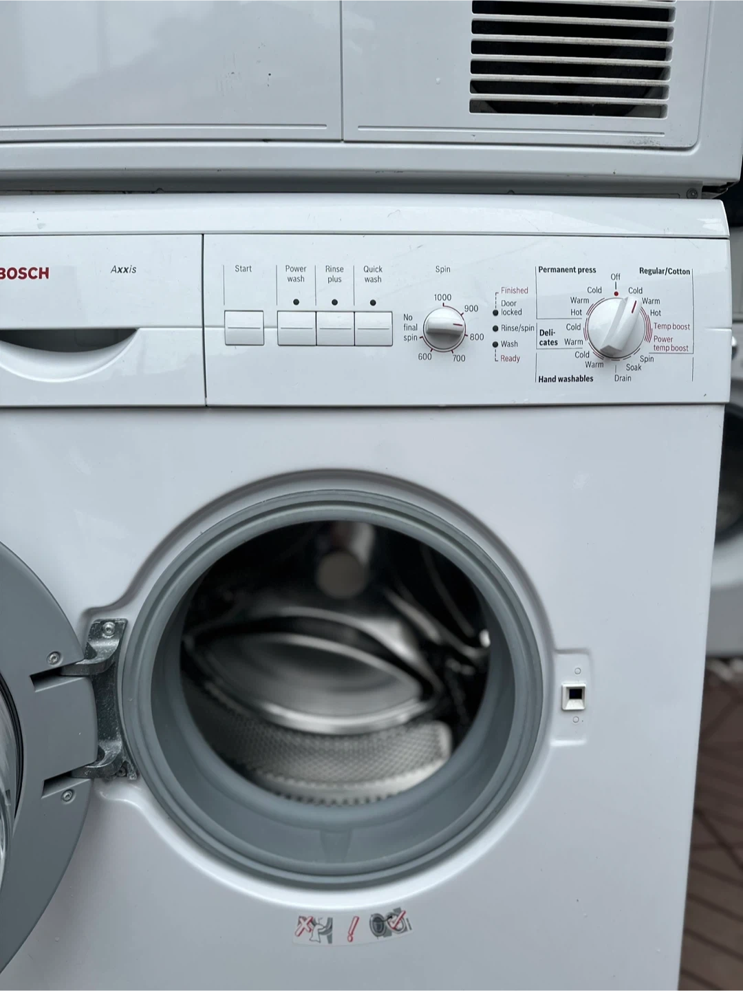 Selling a Bosch Axxis washer and dryer set in white. It's a compact set, perfect for smaller spaces. The washer has various settings like Power Wash, Rinse Plus, and Quick Wash. The dryer has options for Permanent Press and Regular/Cotton. Both are in very good working condition!