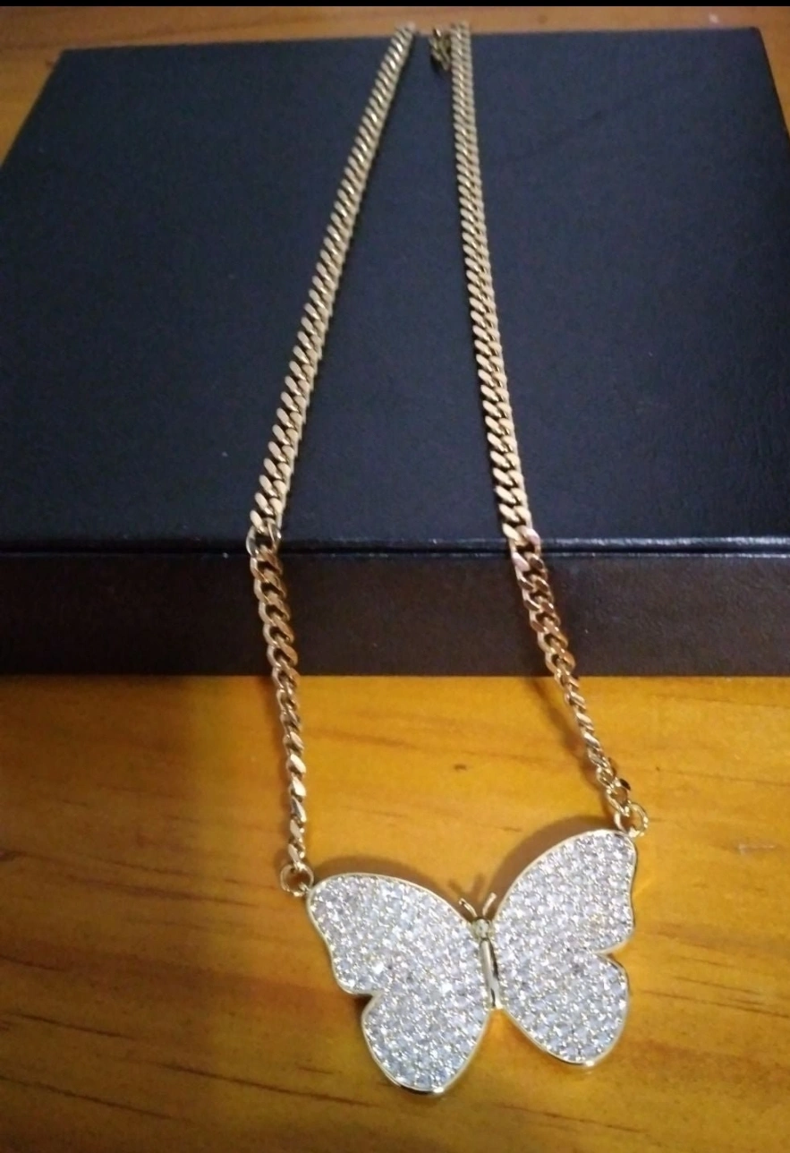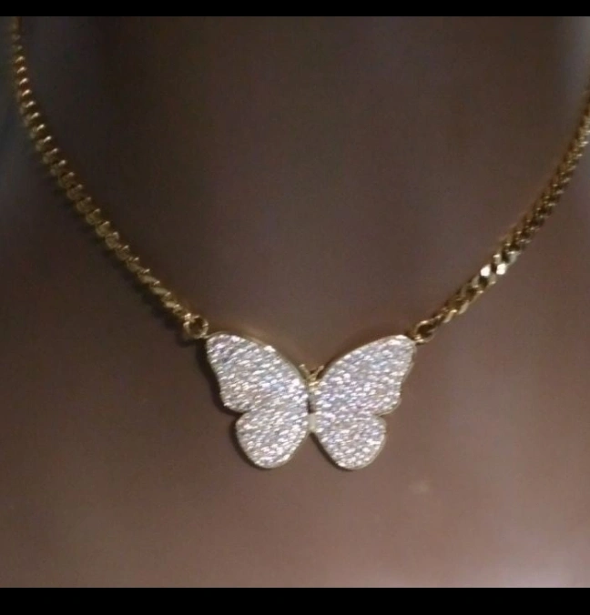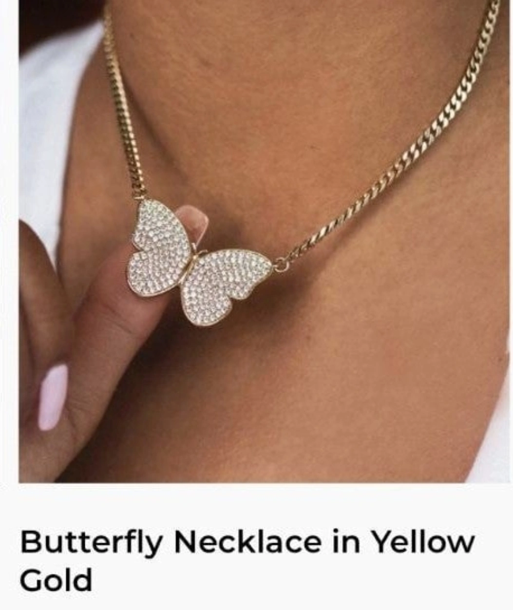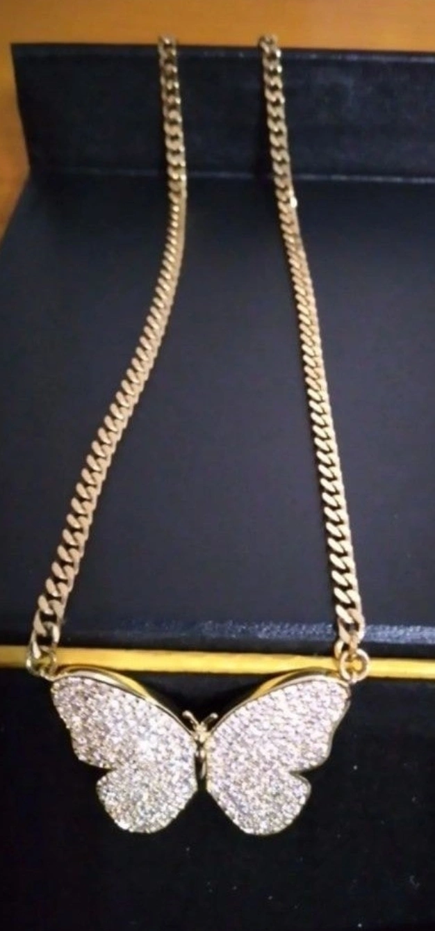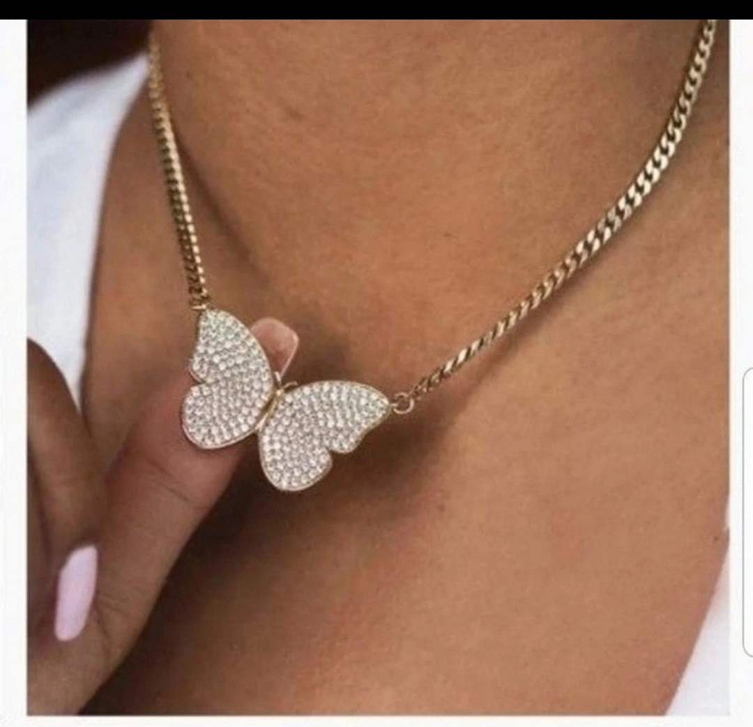 Selling a beautiful butterfly pendant necklace! It has a gold chain and the butterfly is covered in sparkling stones. It's in great condition and would make a lovely addition to any jewelry collection