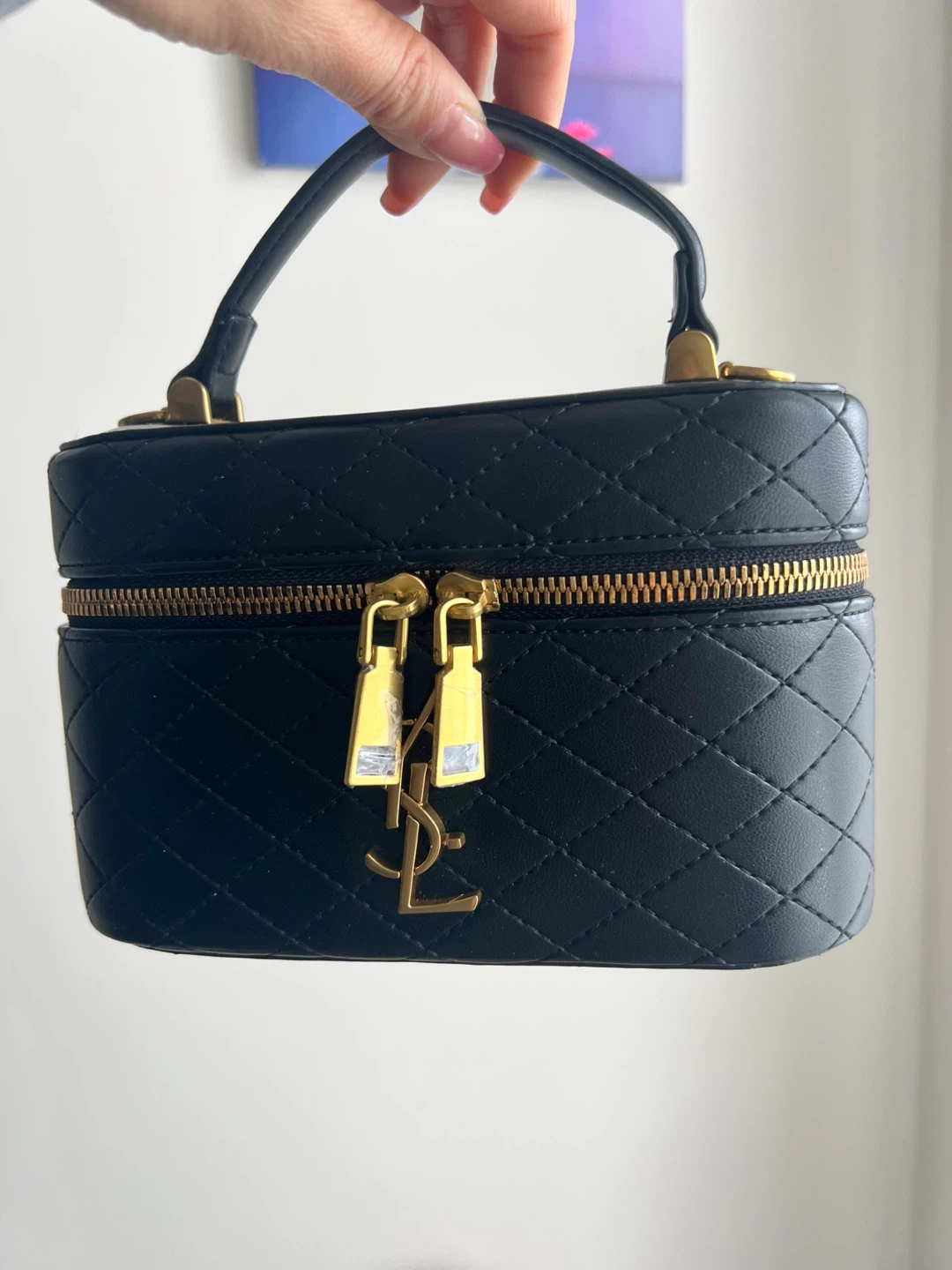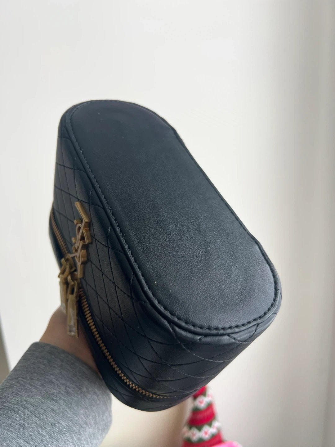 This is a stylish black quilted vanity case with gold hardware. It's made from faux leather and features a zippered closure. This case is perfect for storing makeup and travel essentials.