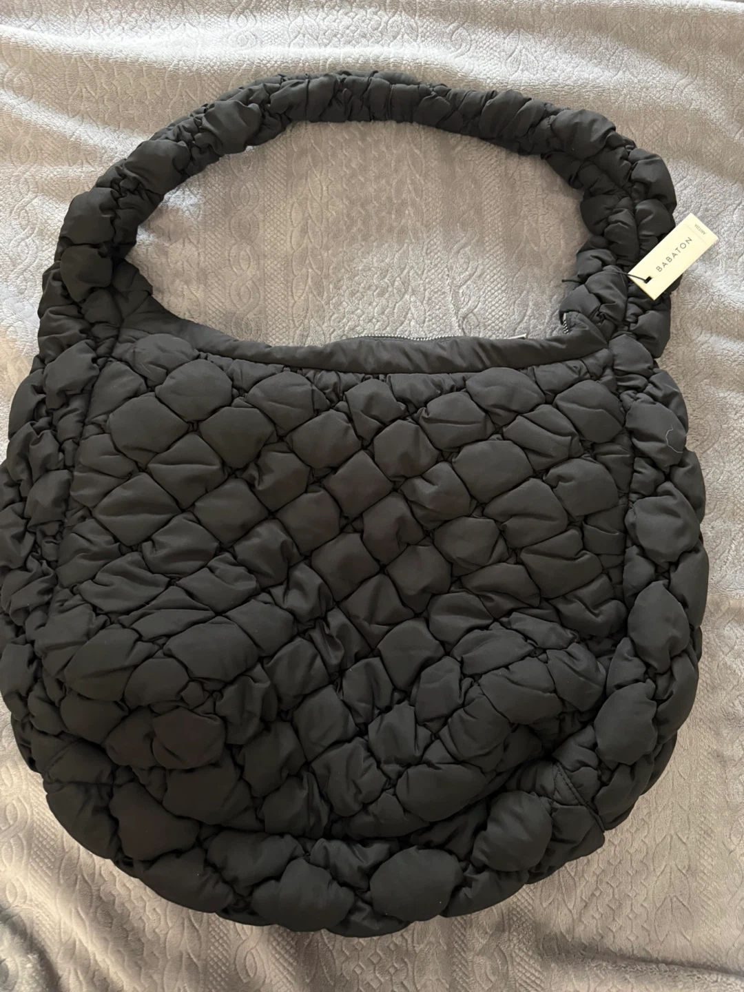 This stylish black quilted puffer shoulder bag is from Babaton. It features a unique puffy texture and a comfortable shoulder strap. The bag's design is practical and chic for everyday use.