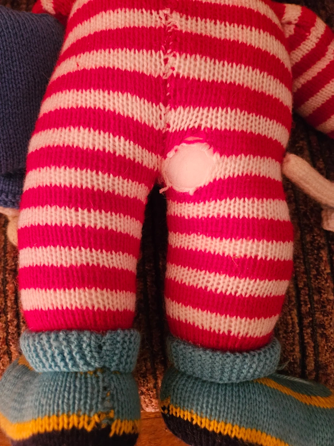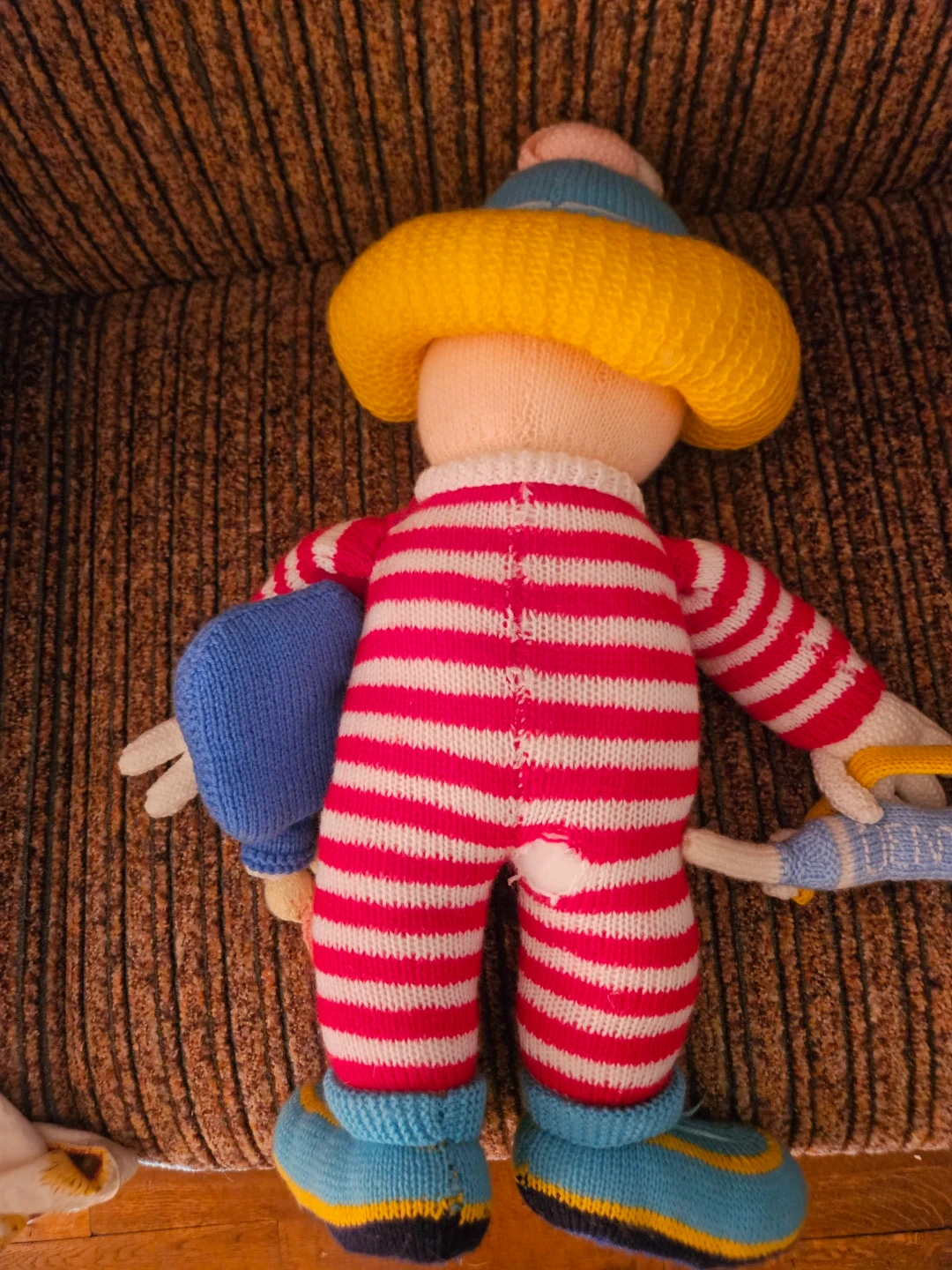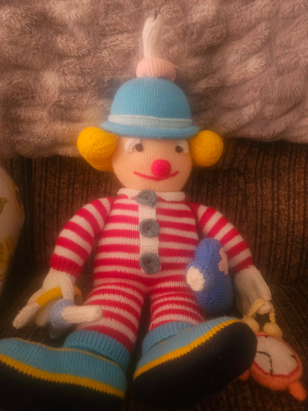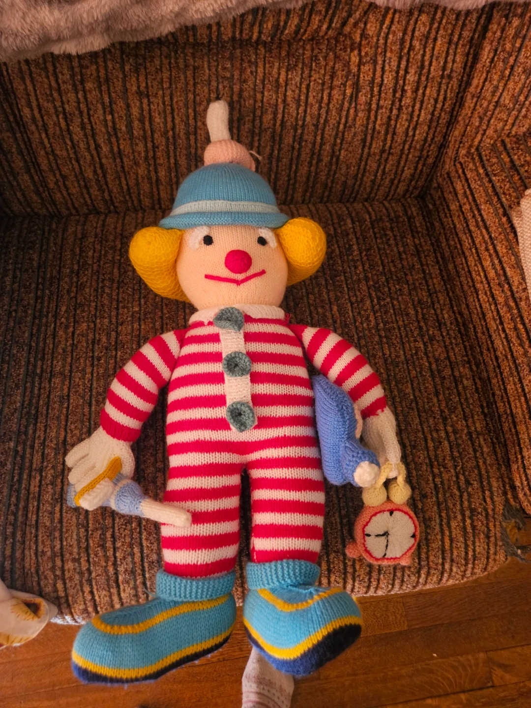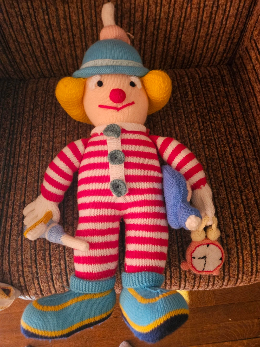 This is a handmade knitted clown doll. It's wearing a striped jumpsuit, hat, and boots. It comes with a blue accessory and a small clock. There's a small tear on the back of the trousers.