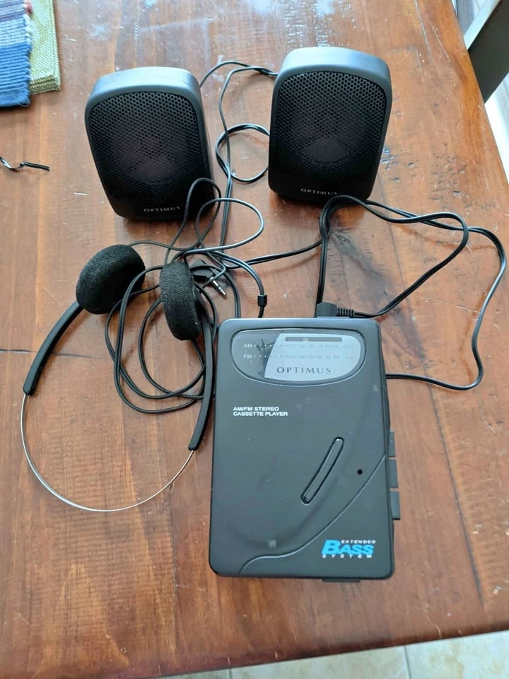 Complete Optimus AM/FM stereo cassette player set. Includes two external Optimus speakers and headphones. The cassette player has an Extended Bass System. Good for listening to your old tapes or radio.