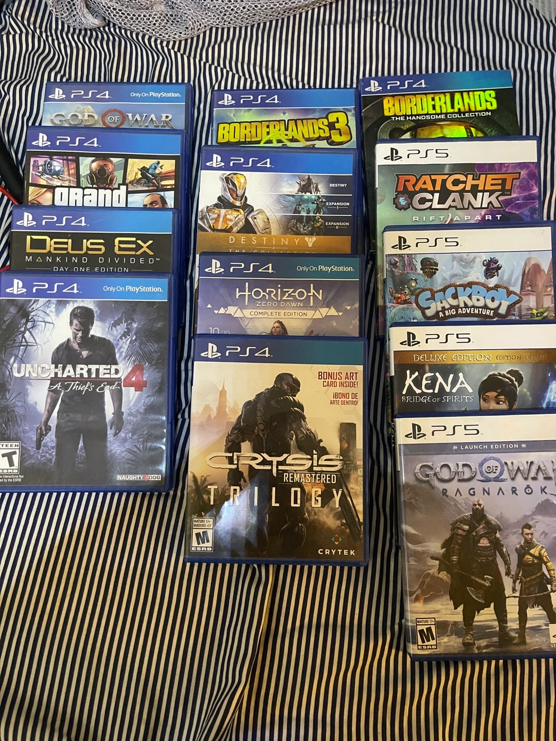 New condition (latest console release) PS5 with white controller and extras. 13 games total; including PS5 originals and PS4 originals (all games play on console). I am also including a 1TB WD external drive which can be used for all games but especially the PS4 games, giving them quicker access. I have also installed a Samsung Pro M.2 SSD with heatsink included. This is a 1TB internal HD which is excellent for accessing PS5 games making it that much faster. There is also another PS5 controller in black. All original cables etc included as well as original box. Unit is spotless and also comes with a PlayStation themed cover to keep the dust off when not using it.