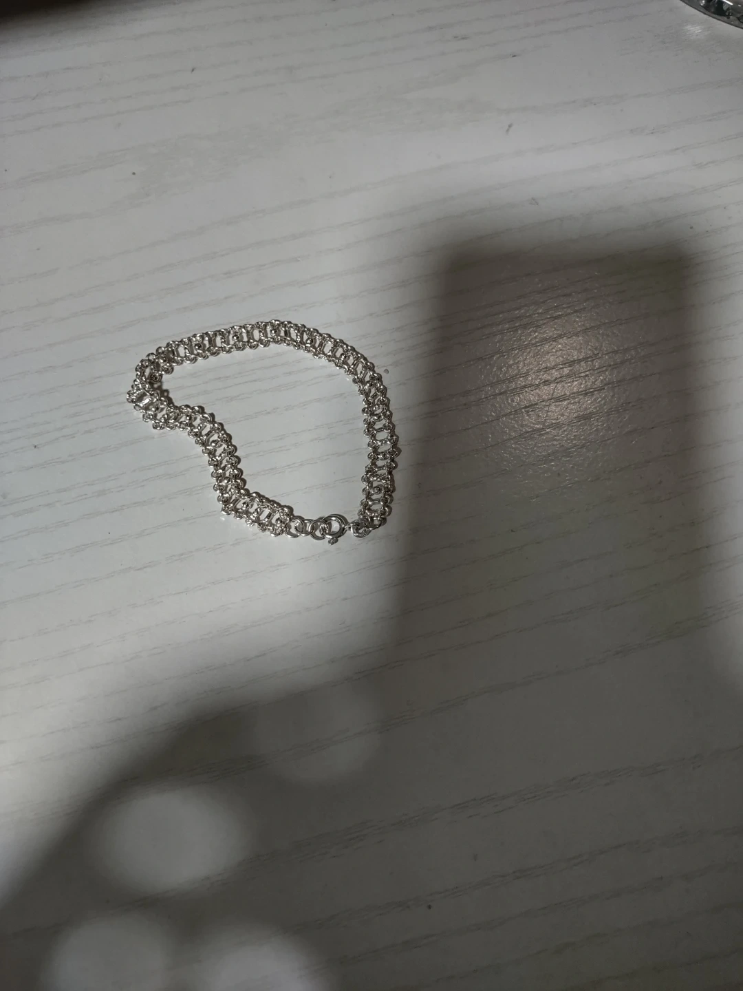 This is a silver bracelet with a classic chain link design. It features a secure clasp closure for easy wear. Its simple elegance makes it suitable for everyday wear or special occasions.