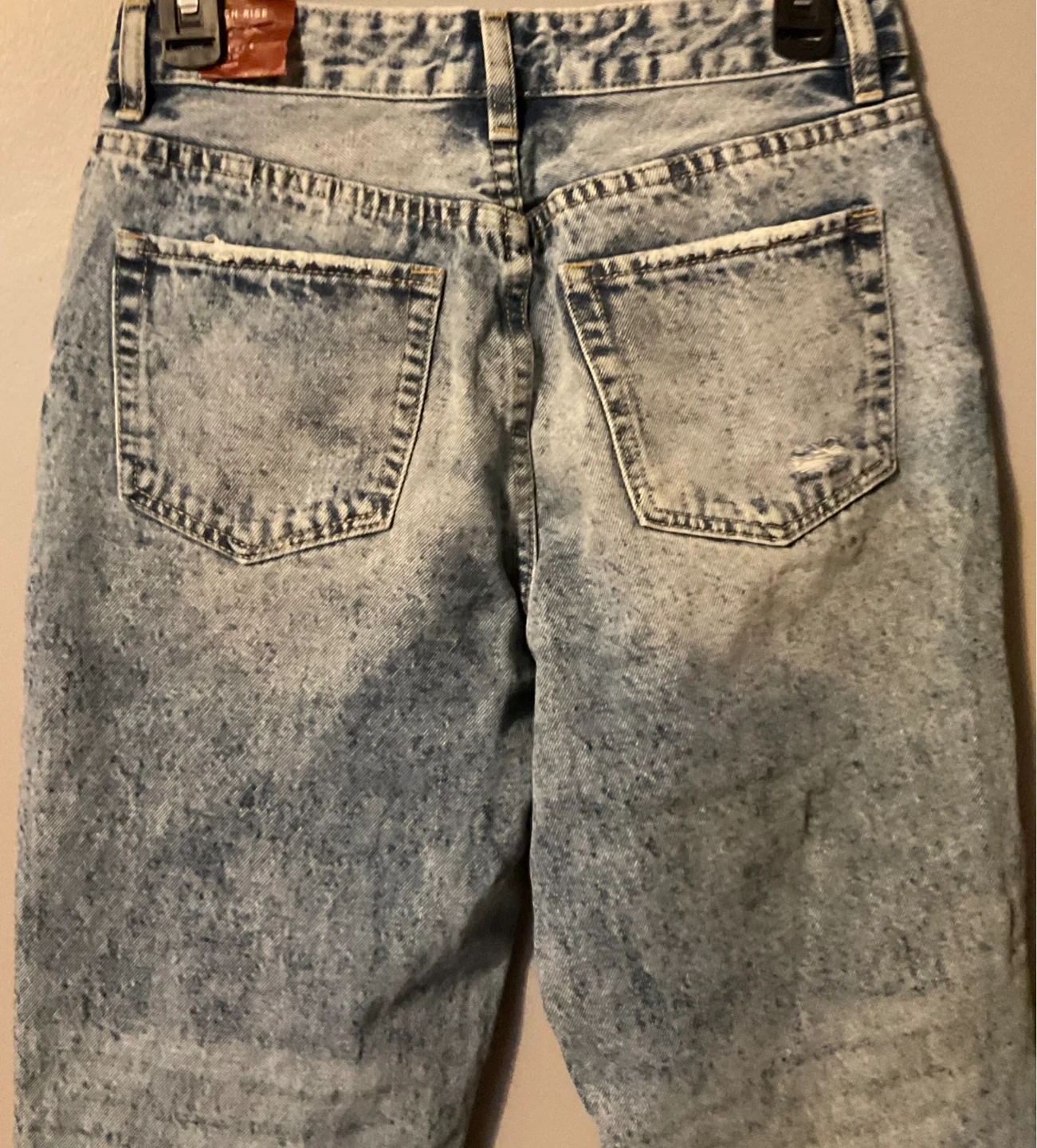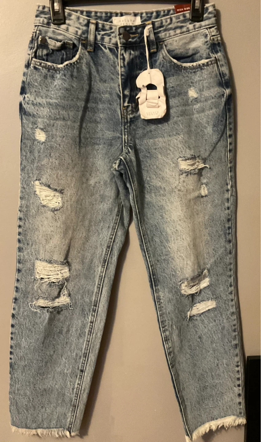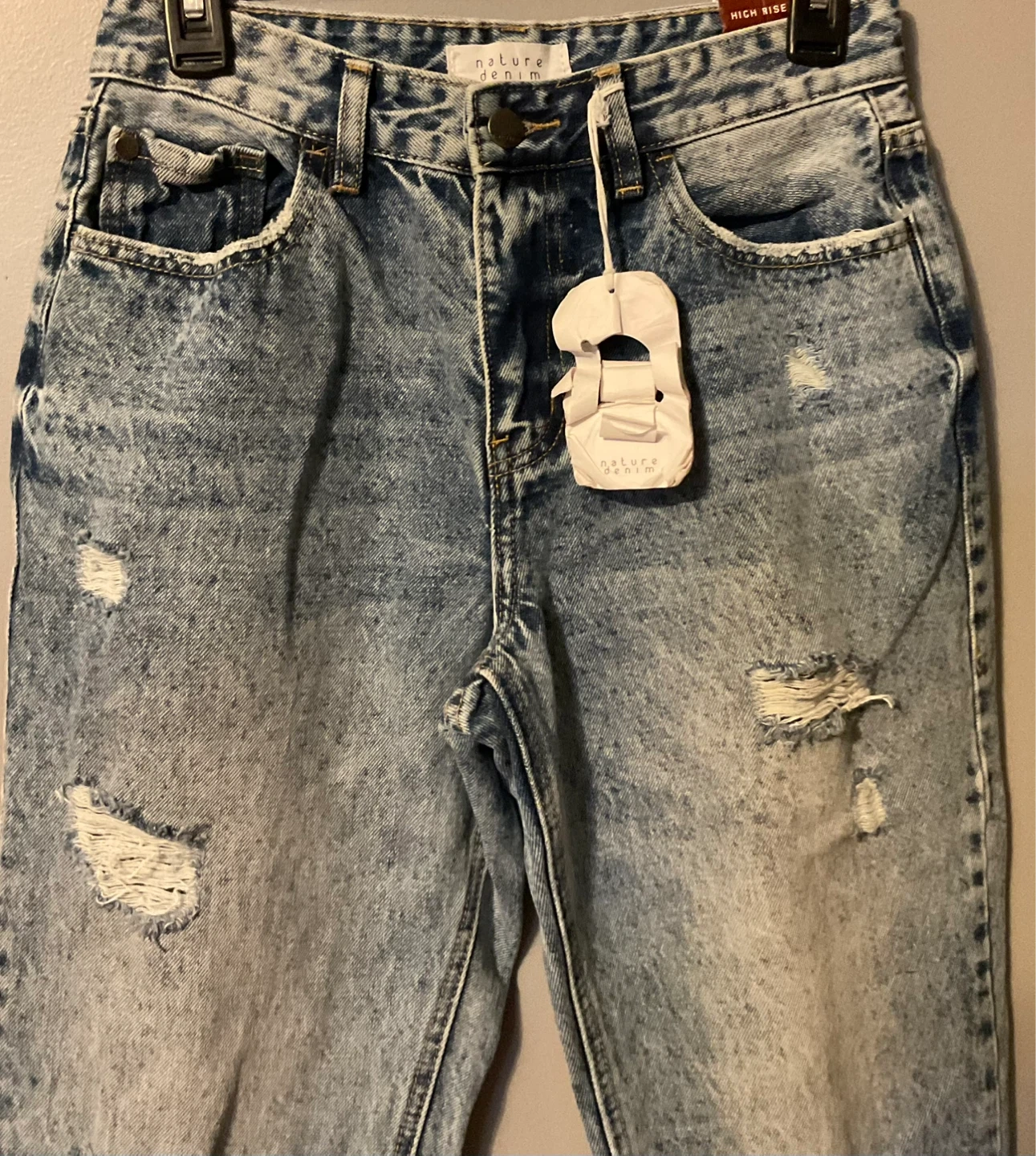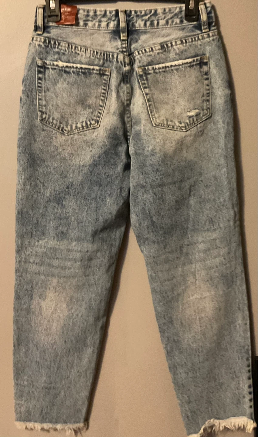 Brand New Nature Denim high rise jeans in a distressed acid wash. These feature a straight leg and frayed hem. Size 27.
