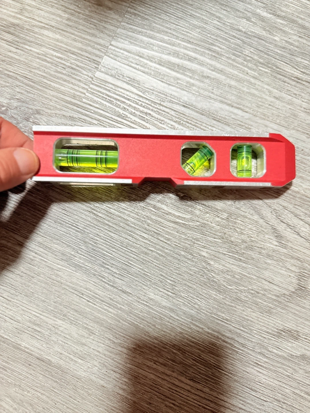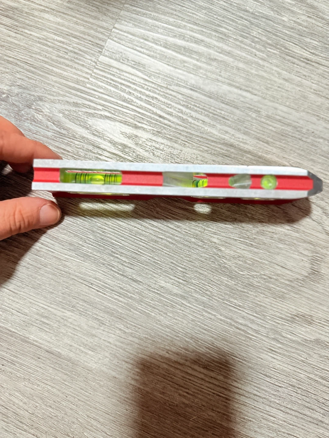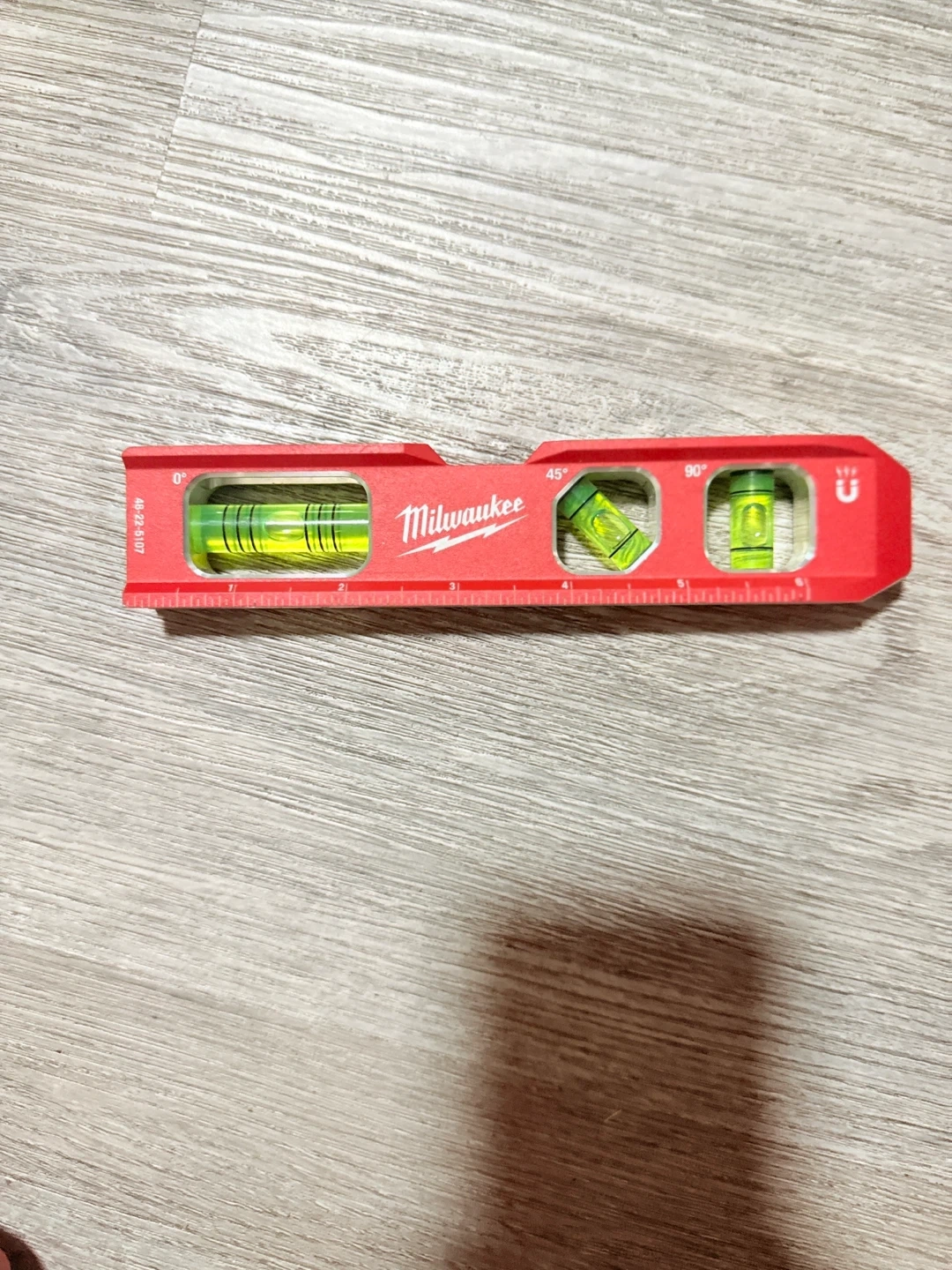 This is a Milwaukee 9-inch torpedo level with three vials for horizontal, vertical, and 45-degree measurements. It's red and features a durable aluminium body. The vials show clear readings for accurate levelling. It's useful for any DIY project or professional construction task.