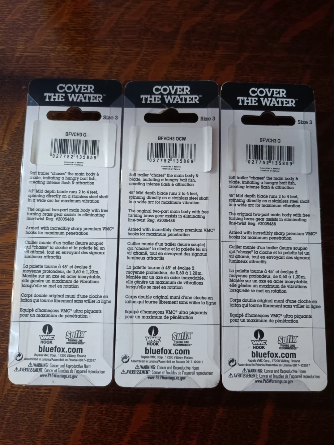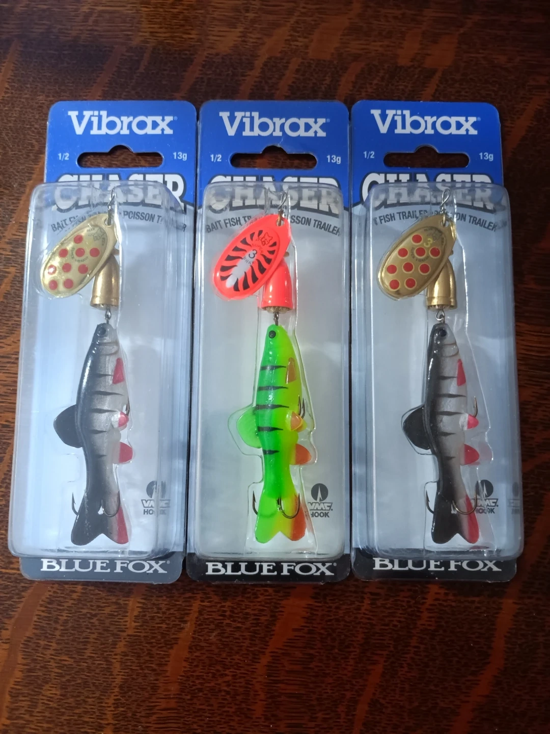 Three Blue Fox Vibrax "Chaser" spinner fishing lures are included. These lures are designed to imitate a bait fish with a sharp body and blade, creating a hungry bait fish action. They run at a 45-degree depth and feature VMC hooks.