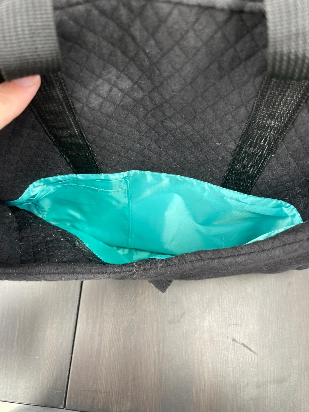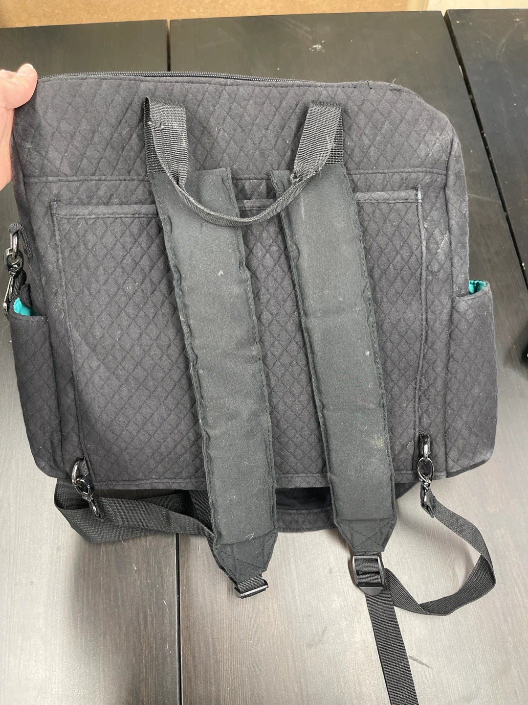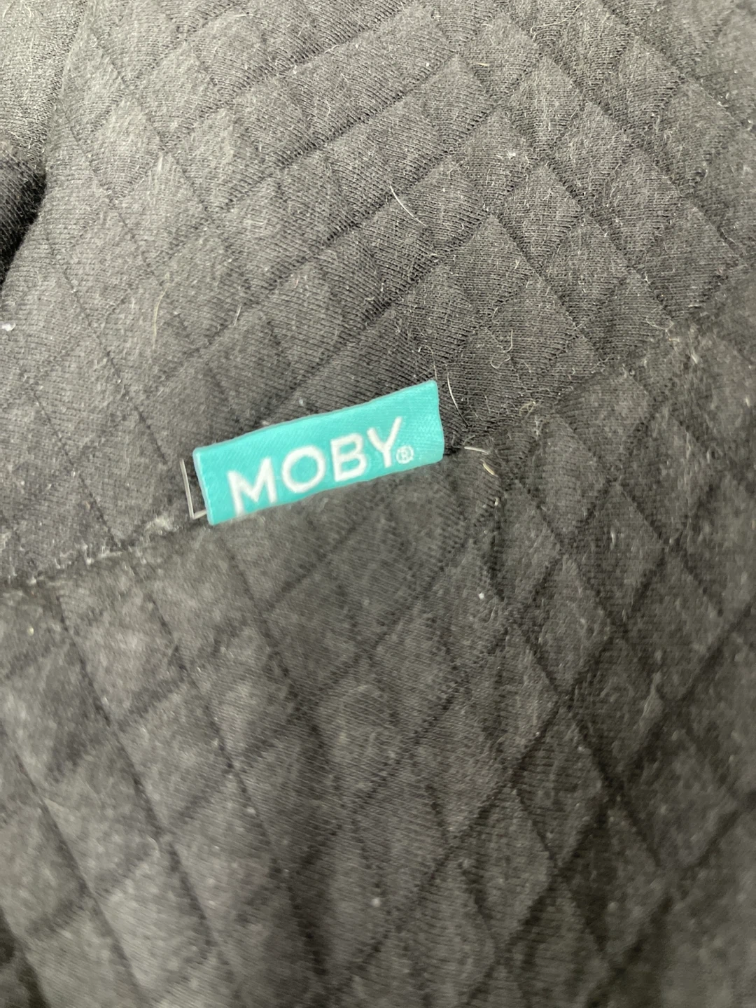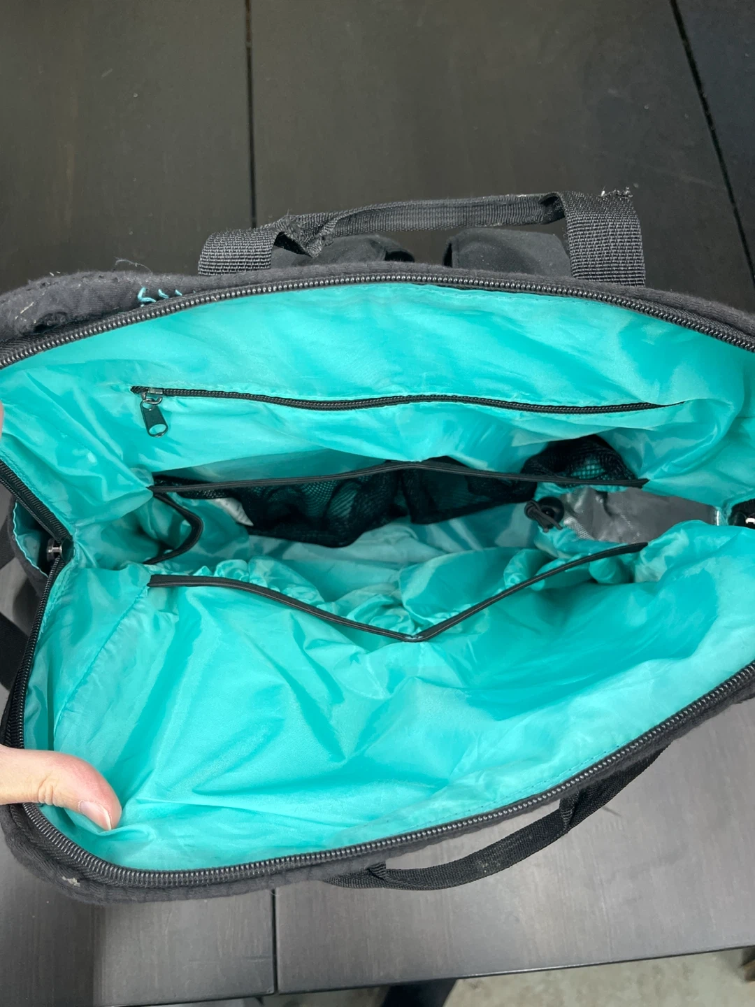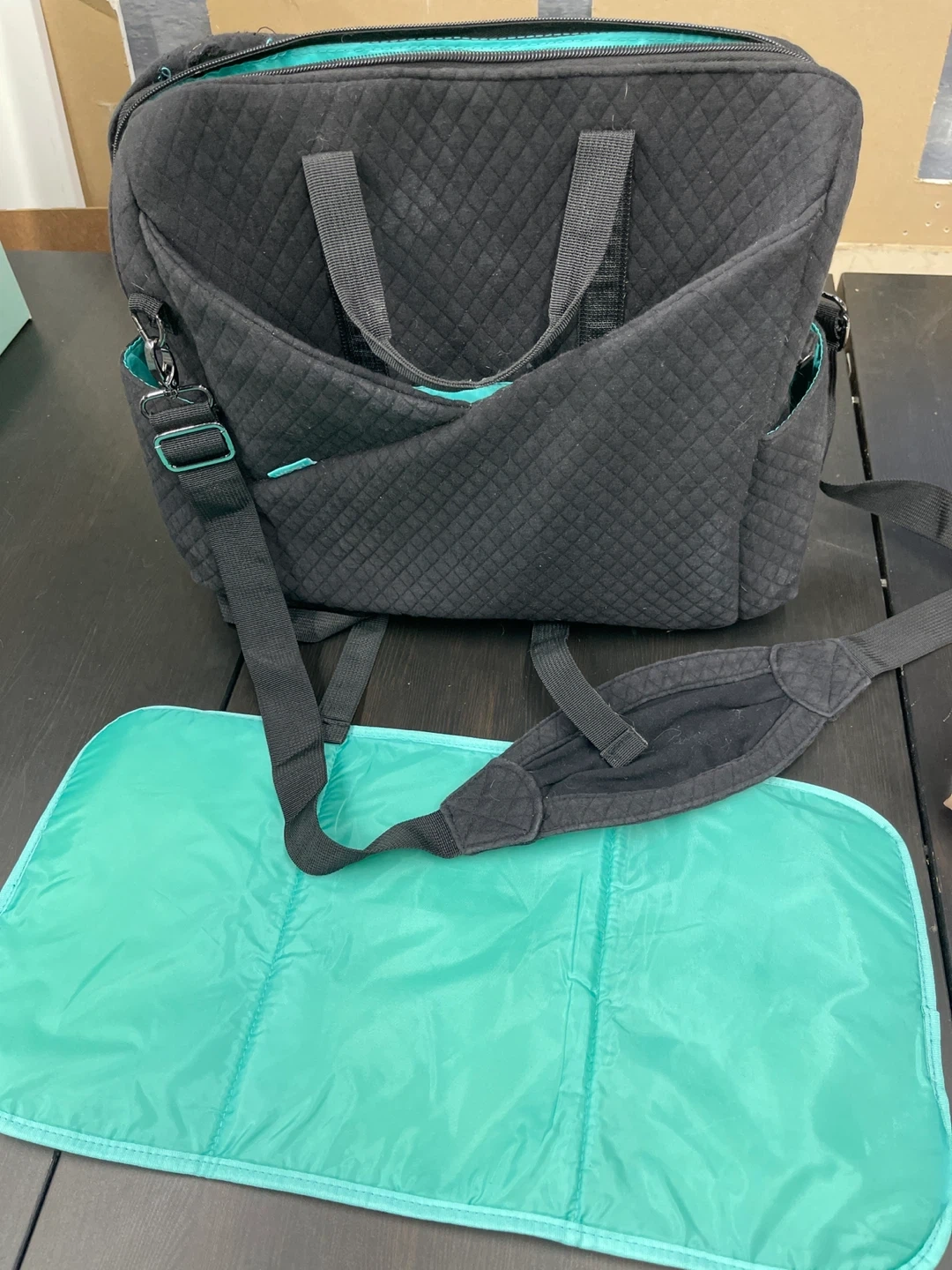This is a black Moby diaper bag backpack. It features a quilted design and teal interior. It has several pockets for organization and also includes a changing pad! Needs a few repair stitches near zipper and a damp rag to wipe a few dusty spots. Otherwise in great condition.