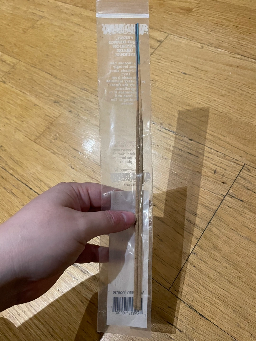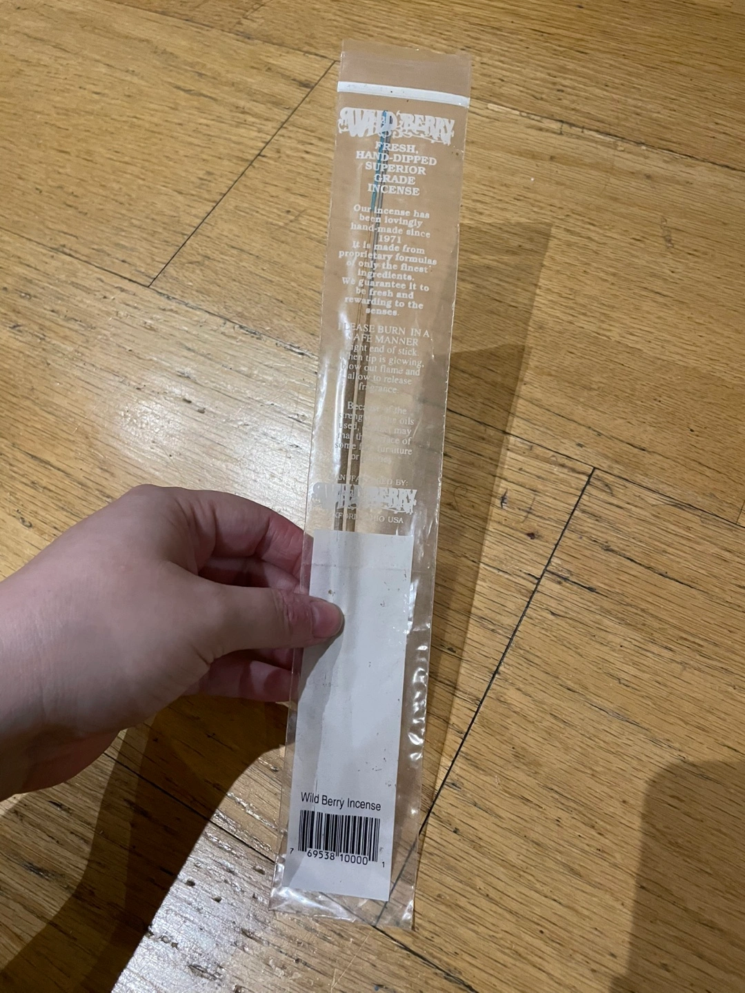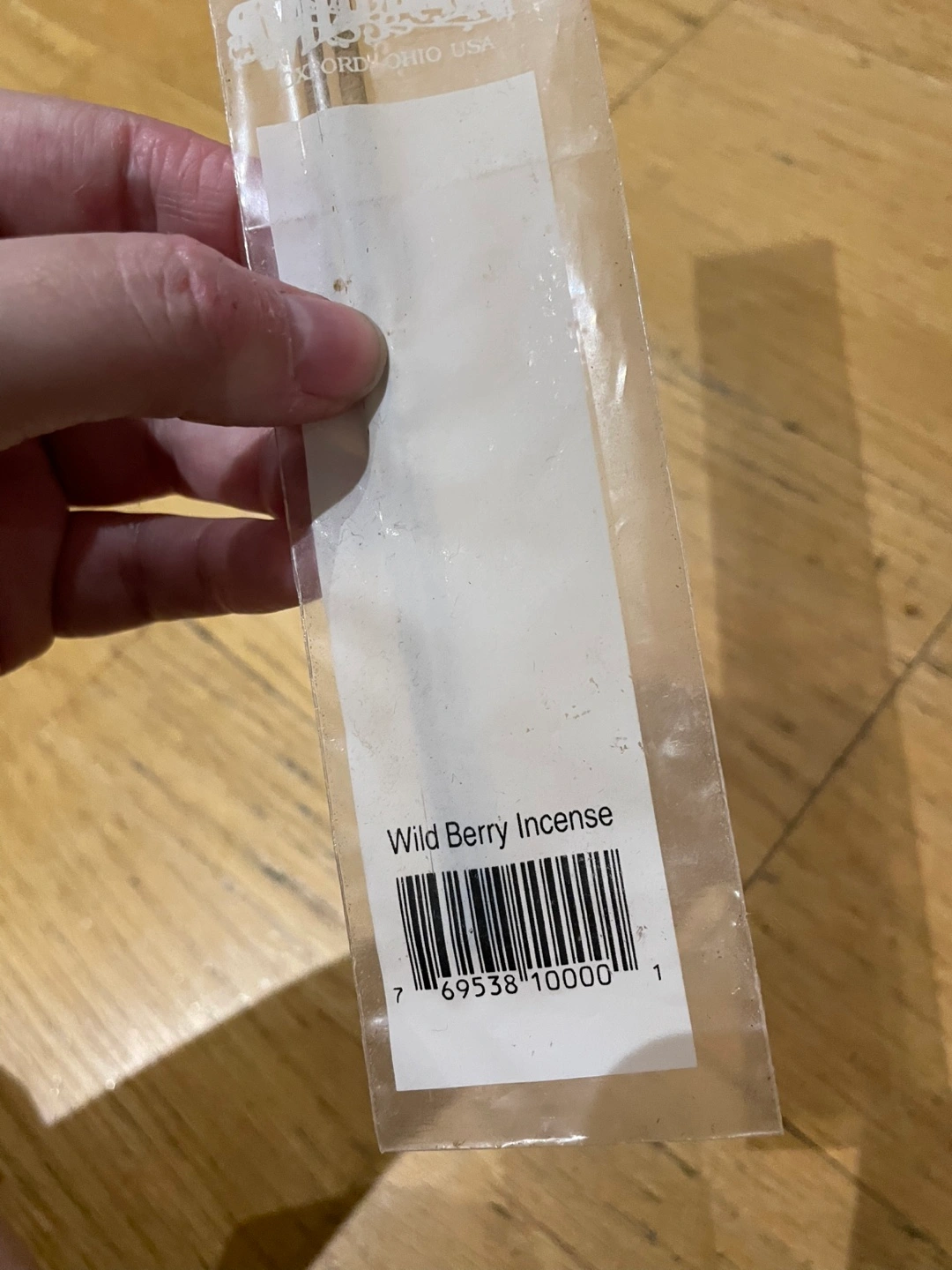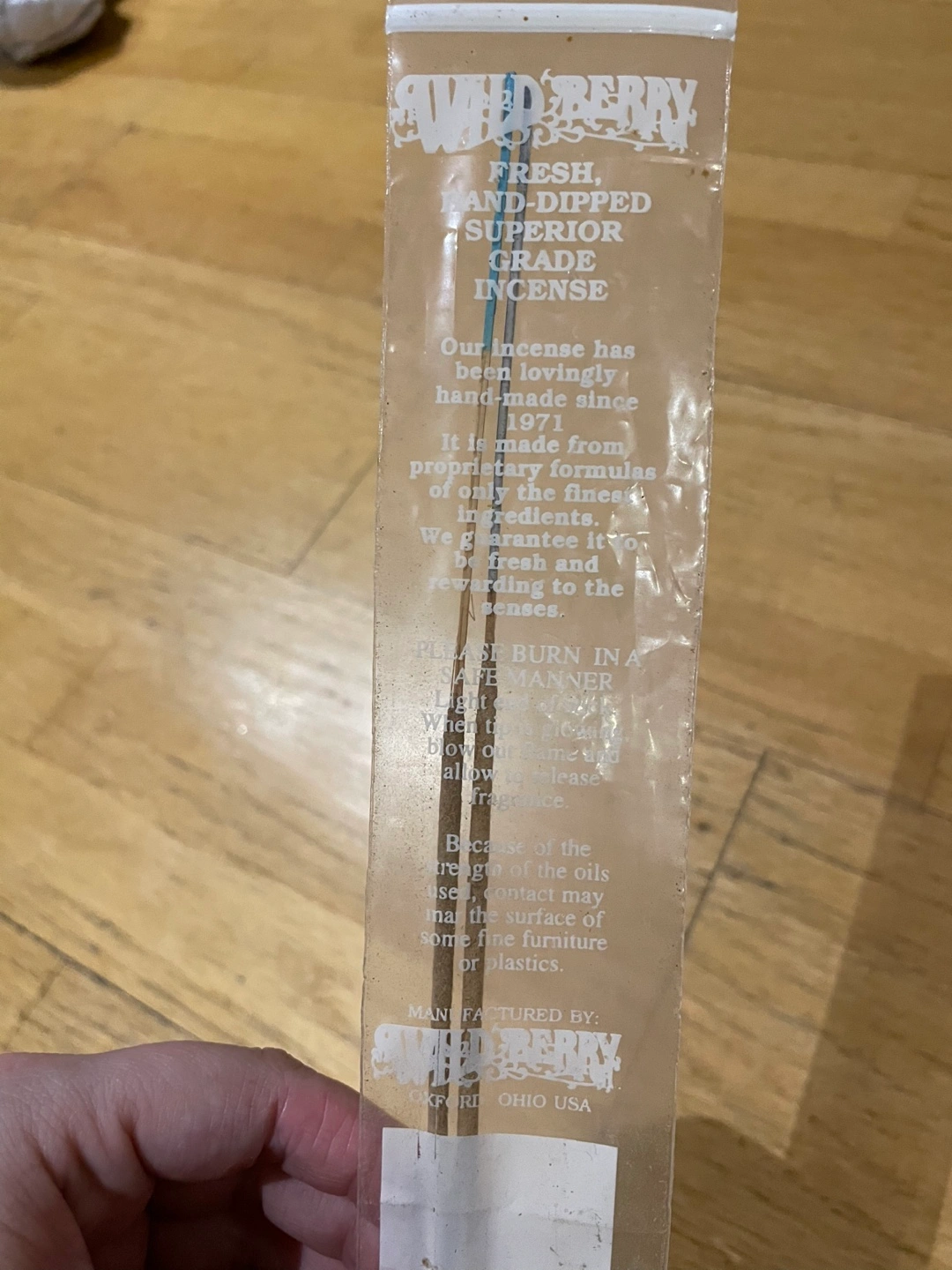 Two incense sticks, given to me in a bag called Wild berry but it’s clearly different colours on the ends so I am unsure what they are and if the bag was just used to store them. I’m not good with scents but one is a subtle rain? The other is a bolder fresh sheets type smell.