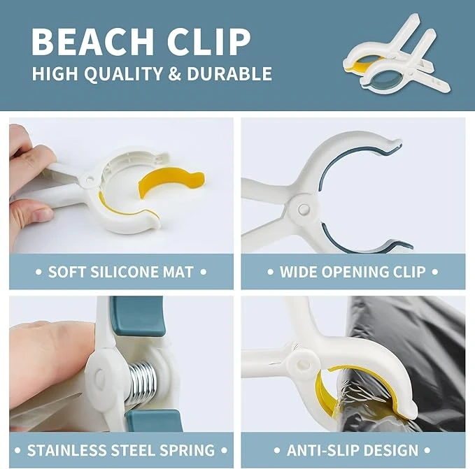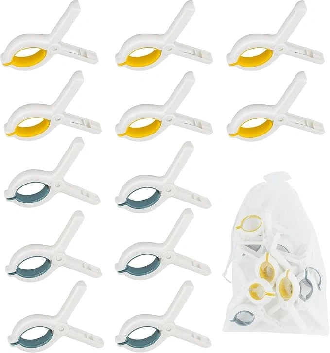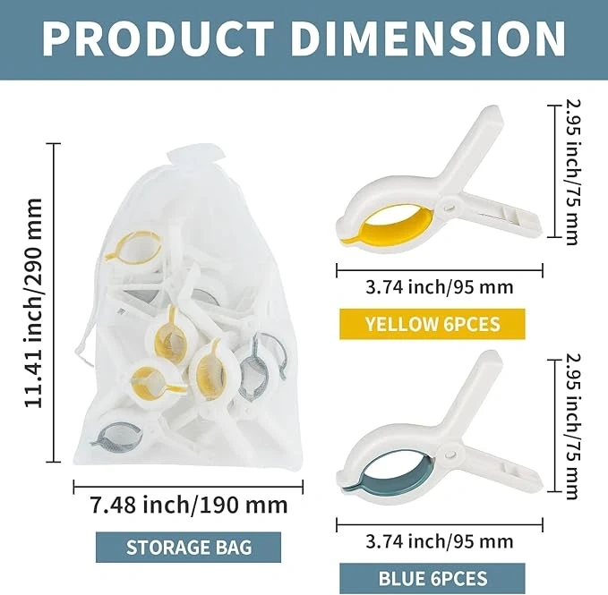 Keep your towels secure with these handy beach towel clips! This set includes 6 yellow and 6 blue clips, perfect for keeping your towels from blowing away in the wind. They feature a soft silicone mat, wide opening clip, stainless steel spring, and an anti-slip design. Comes with a storage bag for easy organization