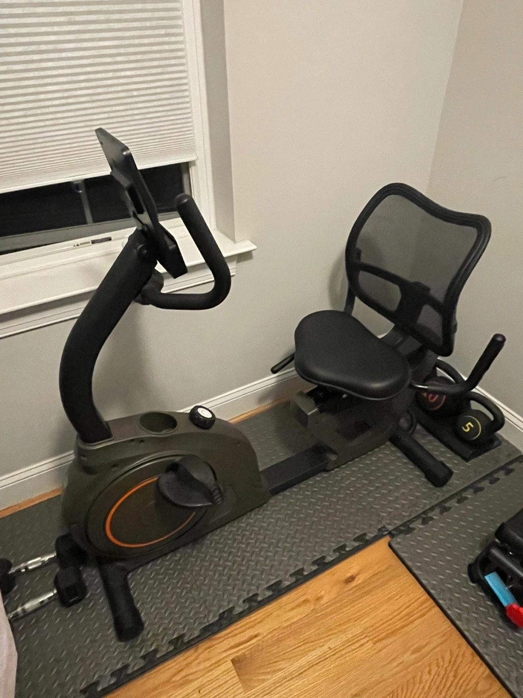 Recumbent exercise bike with adjustable seat and handlebars. Includes a small screen that displays workout information.