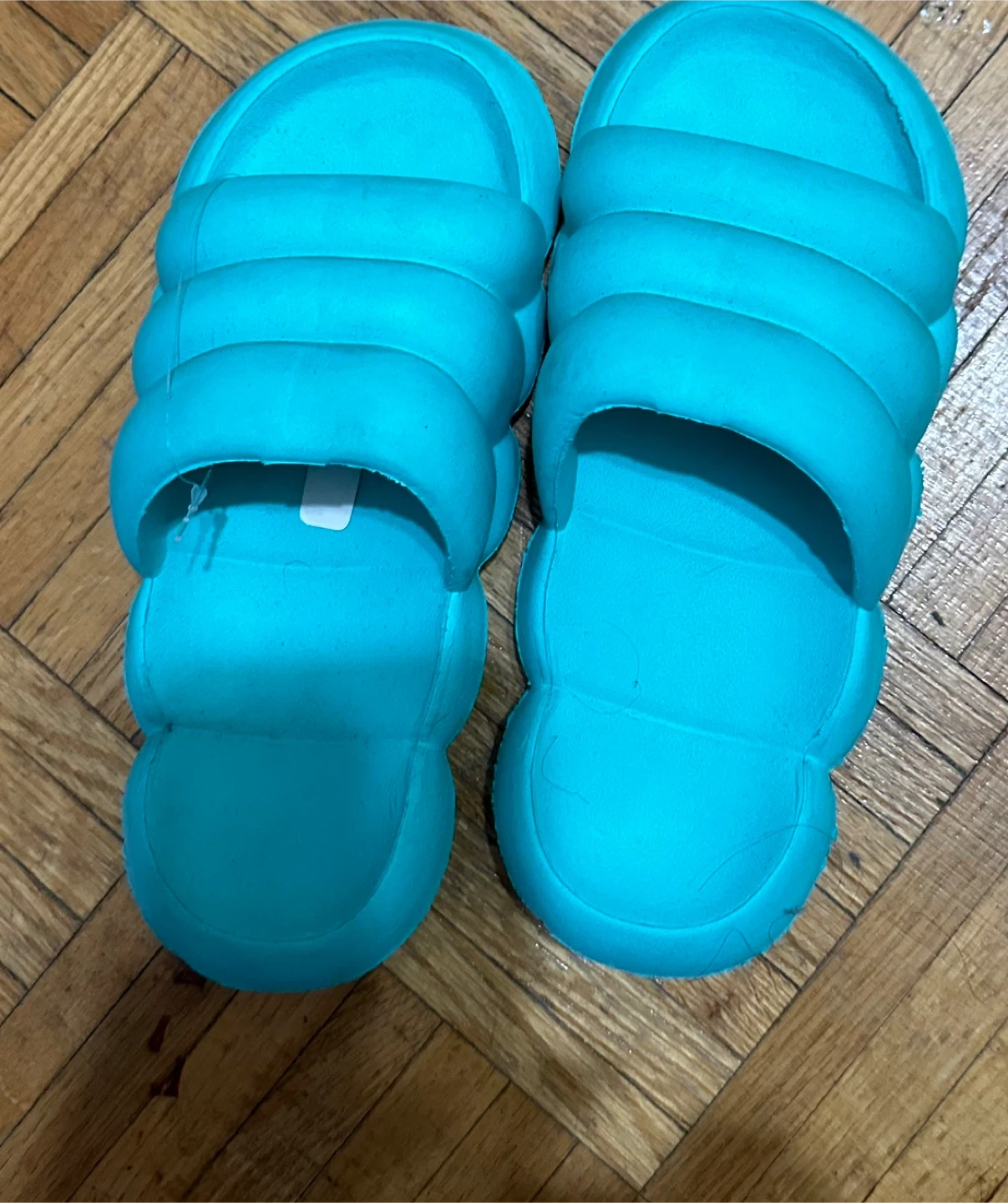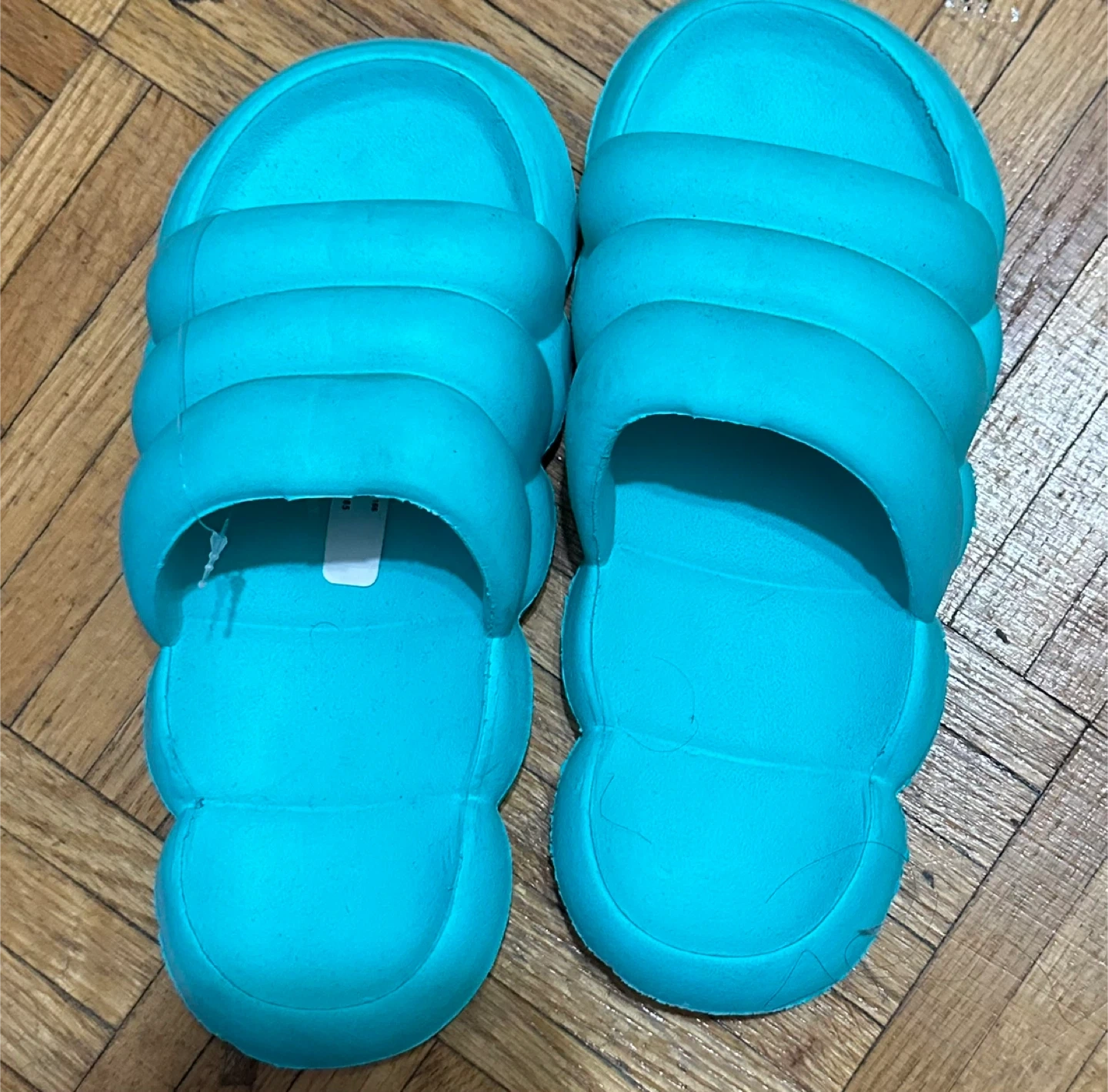 Comfy turquoise slides with a puffy design. These slip-on sandals are a size 8 Women's. Great for lounging around the house or quick trips outside!