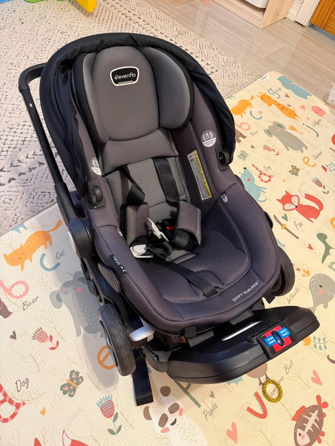 Selling an Evenflo Shyft DualRide infant car seat and stroller combo. It includes the infant car seat, stroller frame, car seat base, parent cup holder, and quick start guide. This combo is designed for both car rides and strolls, making it super convenient!