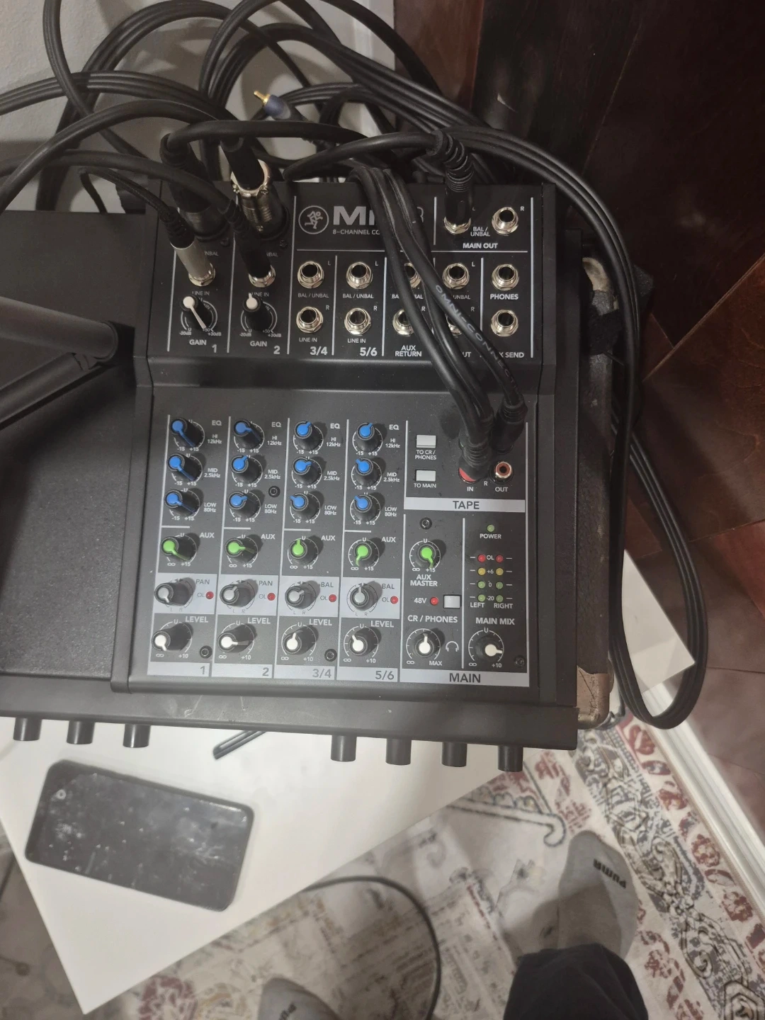 Mackie 8-channel compact mixer. It's great for small setups and portable use. Includes EQ, aux sends, and main mix outputs.