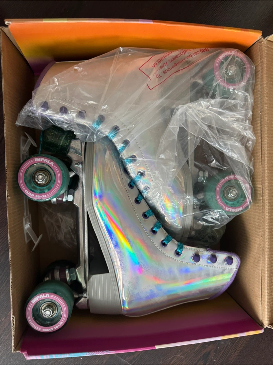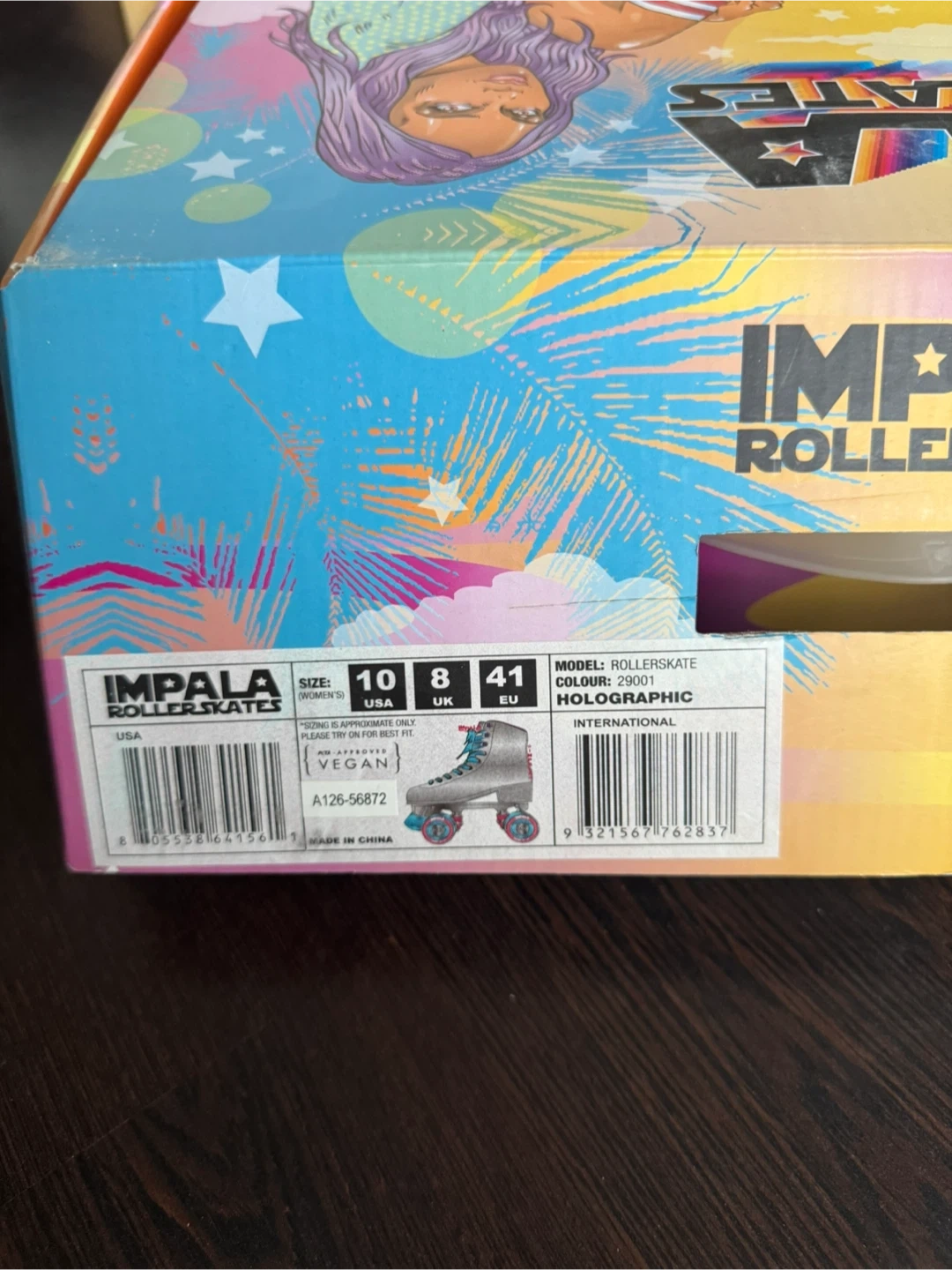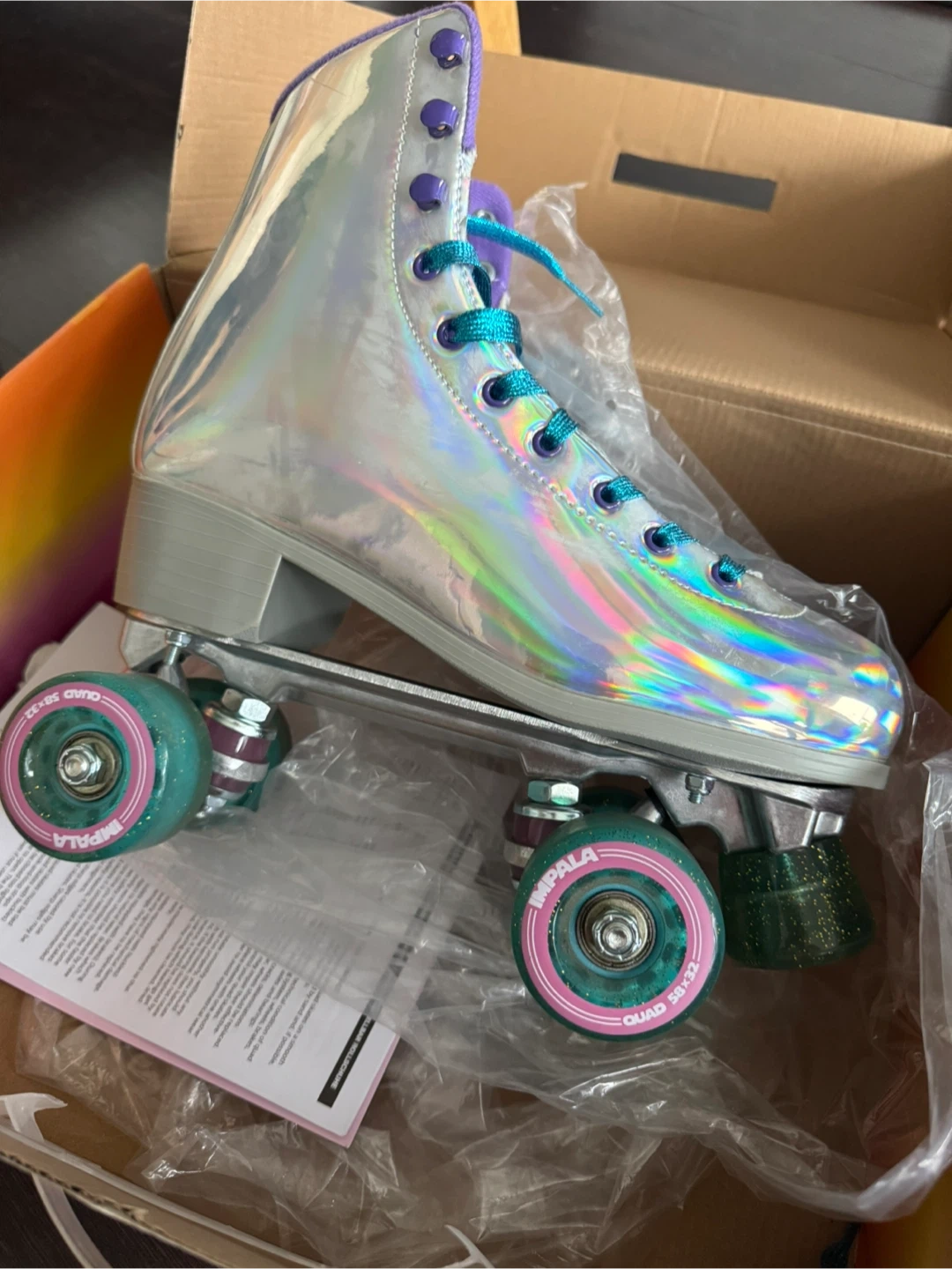 Impala roller skates in a holographic finish. These are roller skates, model name Rollerskate, colour code 29001. They are vegan. Includes original box.