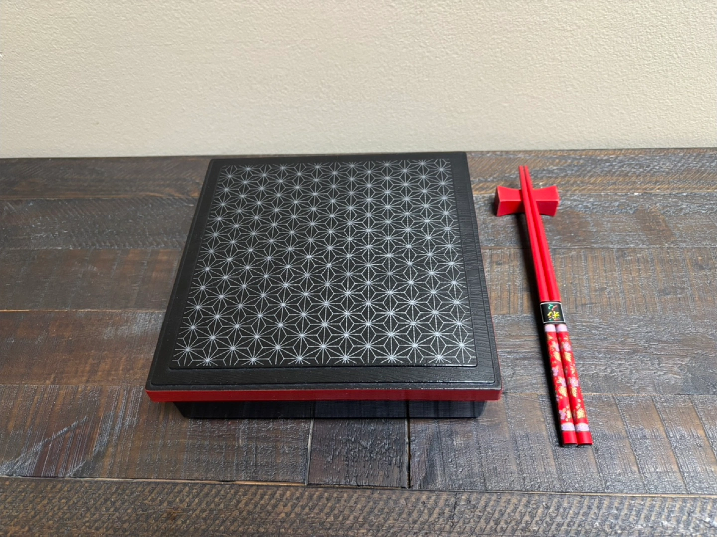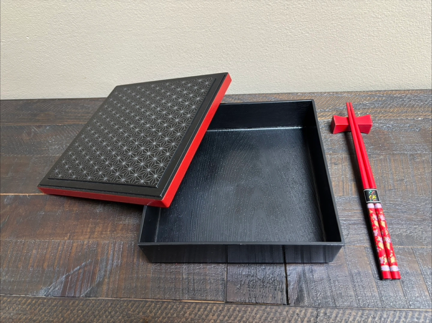 black and red lacquered bento or sushi box with a pair of chopsticks. They are all in new condition. Selling all of them together for $15
