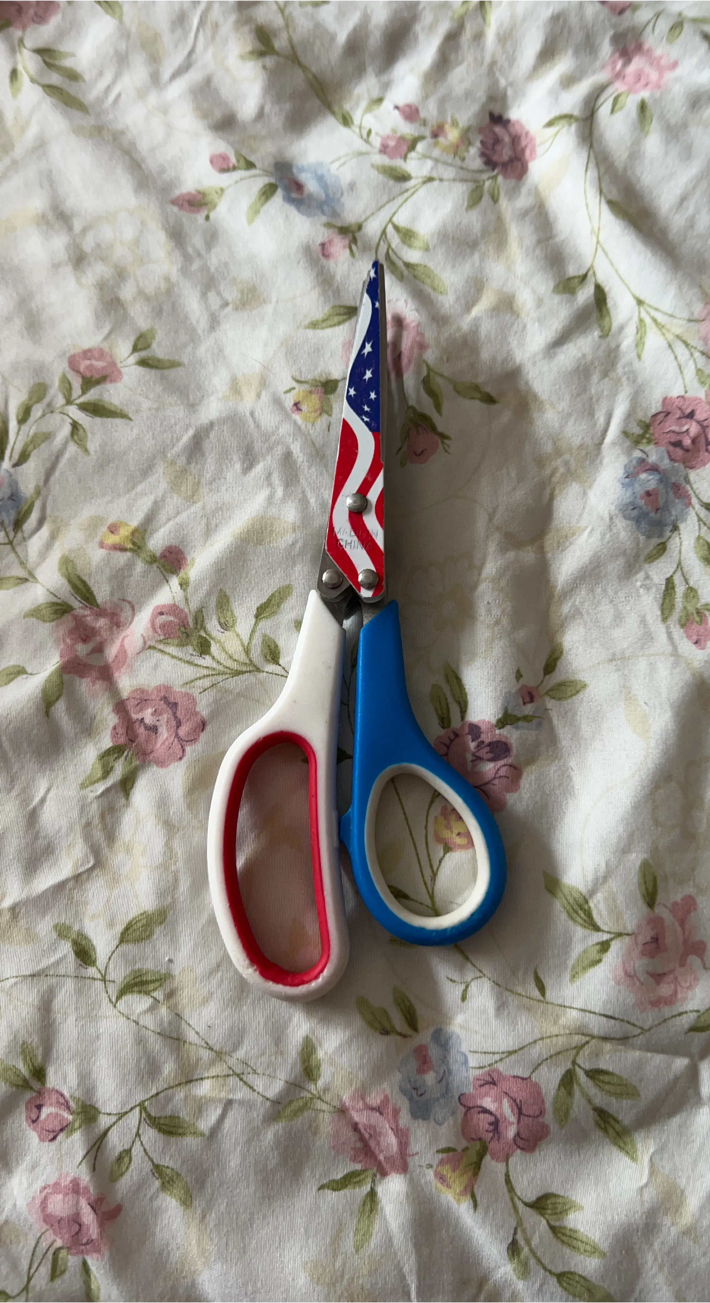 These scissors have blades decorated with the American flag. The handles are white and blue with red accents. Made in China.